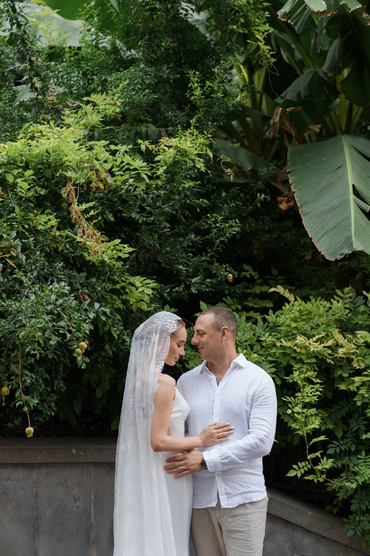 Для росписи в ЗАГС мы выбрали лёгкие, свободные, городские образы. На мне было платье-комбинация из тонкого атласа. Образ дополняли кружевная фата и винтажные серьги 70-х годов. Жених надел лёгкую льняную рубашку и светлые брюки — просто и элегантно.