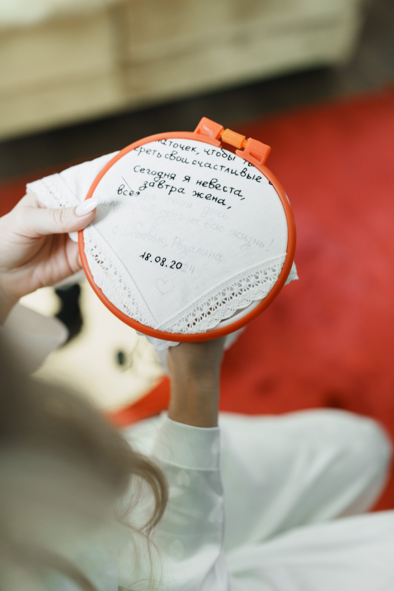 Под венец меня вёл мой папа, и это был невероятно трогательный момент. Для родителей с обеих сторон я своими руками вышила платочки «для слёз счастья» со словами благодарности, мы вручили их перед церемонией.