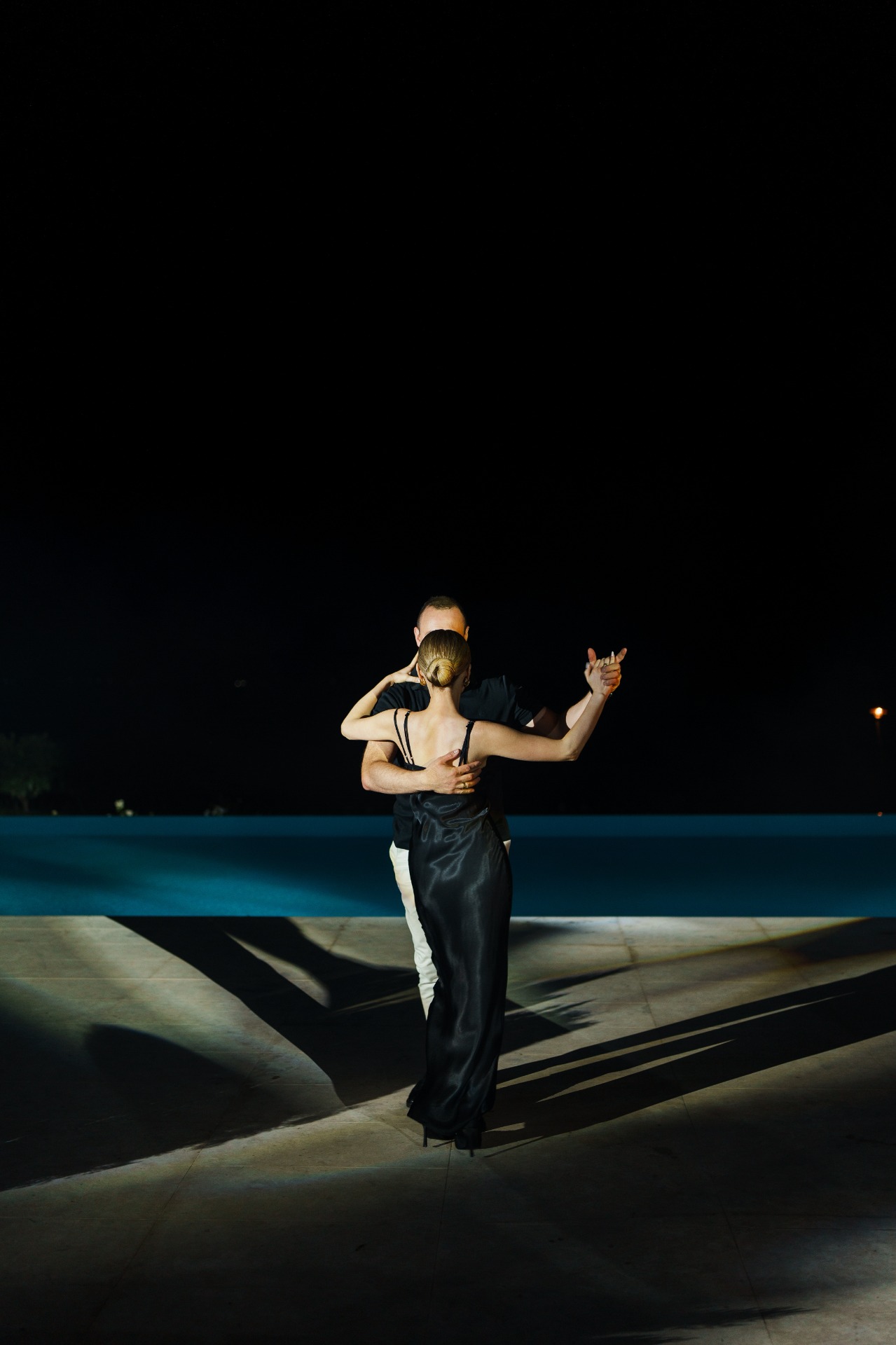 А вечером, во время исполнения ритмичной бачаты на мне было лёгкое чёрное платье-комбинация, а на Максиме — белые брюки и чёрная футболка.