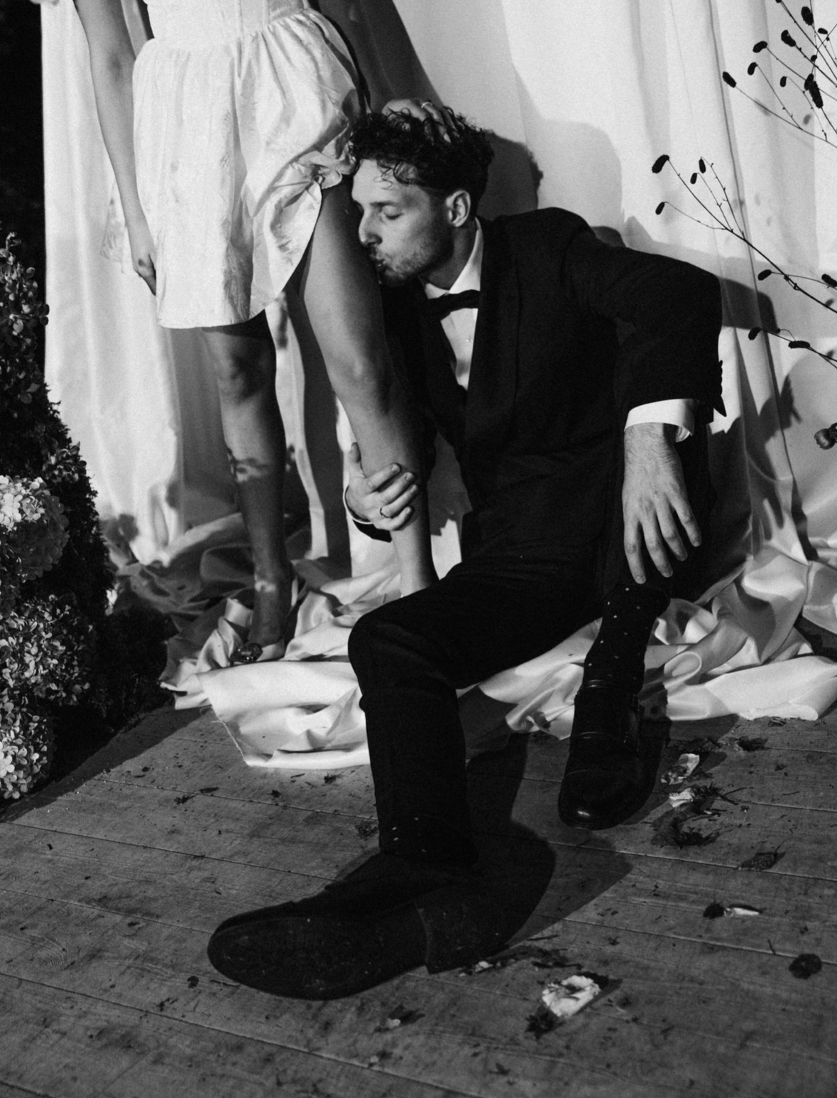 Для Саши мы искали неклассический вариант костюма, и для нашего праздника идеально подошёл чёрный смокинг с необычным запахом.
