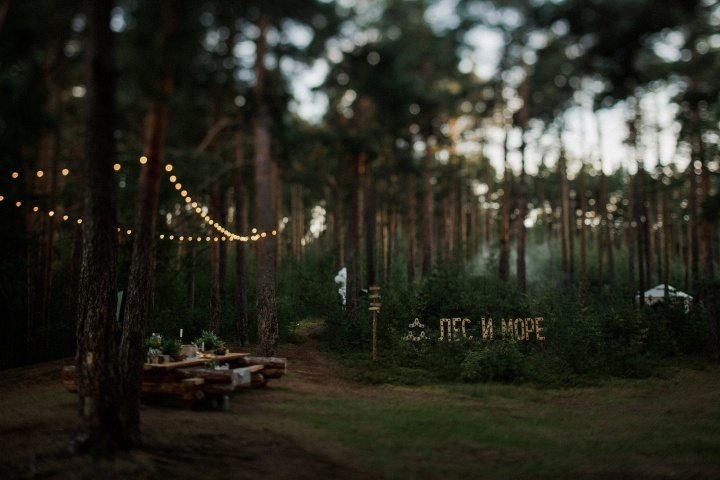 Внутри палатки творилось какое-то волшебство из дерева, тканей, стильных подушек и пледов, ковров в стиле бохо, ловцов снов — казалось, будто через эту палатку можно было пройти в Нарнию… Так мы узнали про «Лес и Море», влюбились, и, наверное, уже тогда поняли, где будет проходить наша свадьба. Для порядка мы, конечно, взвесили все плюсы и минусы и, поняв, что никакие сложности не встанут между нами и всем этим чудом, наконец утвердили локацию праздника!