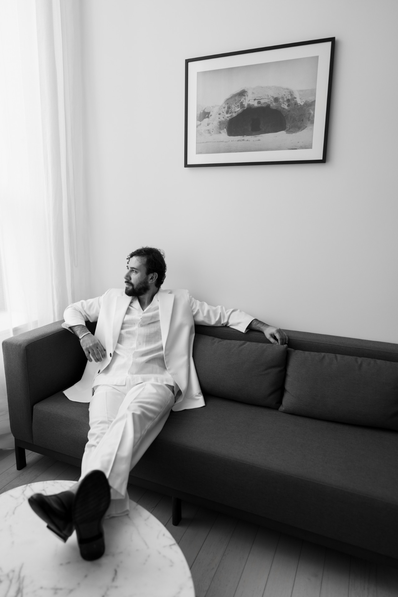 Вахо хотел классический, но при этом лёгкий и расслабленный образ, выполненный в оттенке, созвучном моему платью. Поэтому свой костюм он тоже заказал индивидуально.