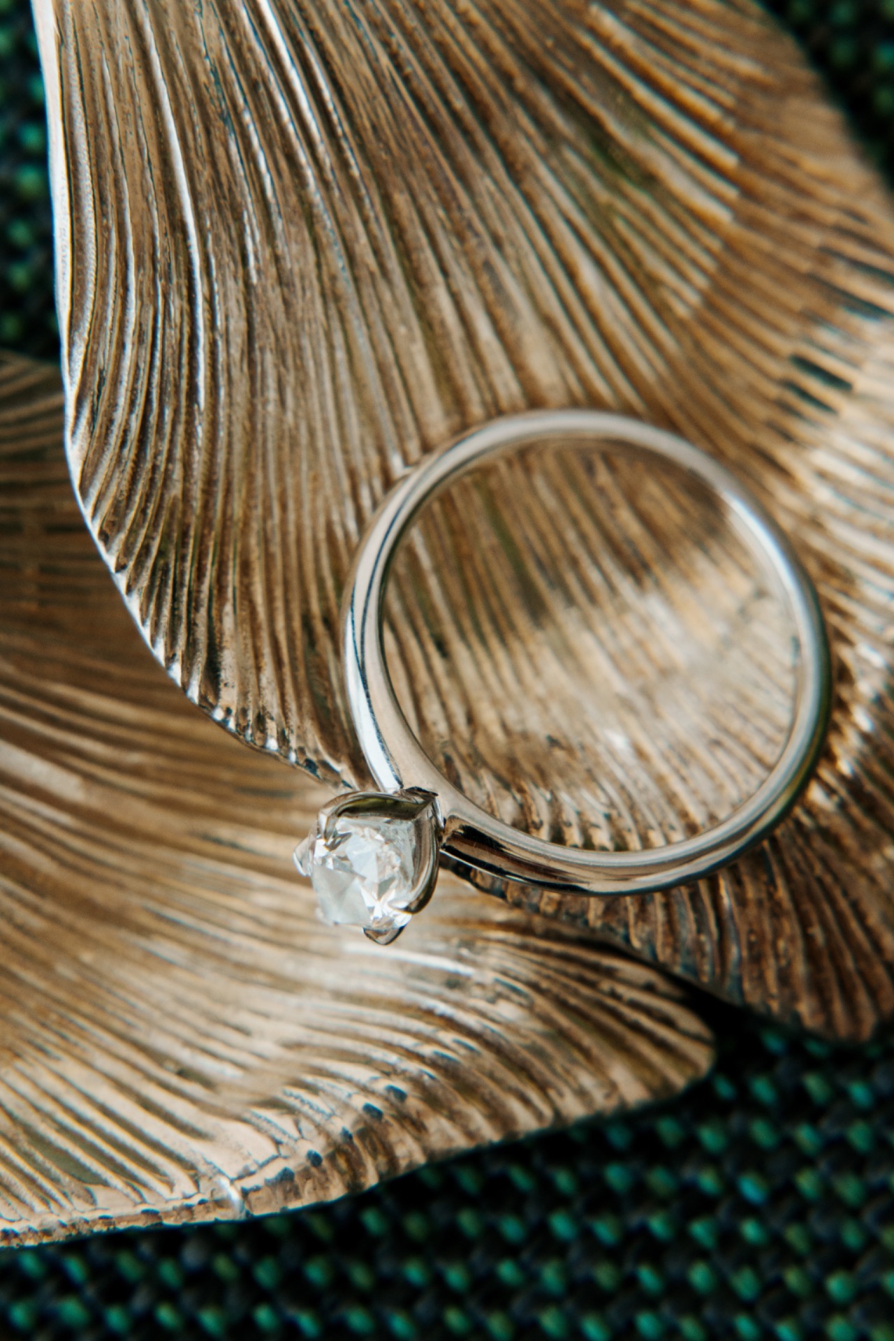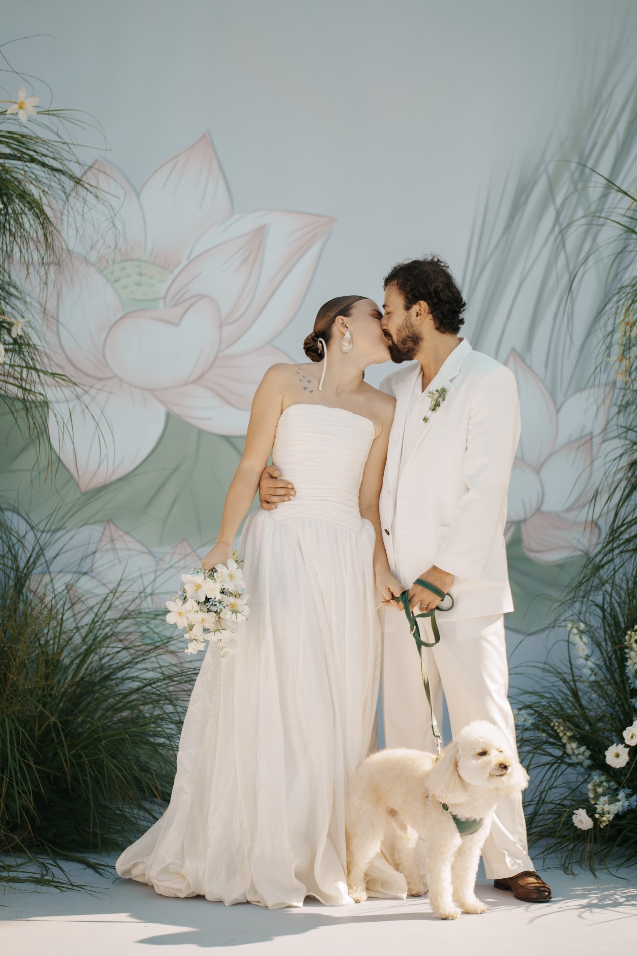 Свадьба была камерной — только мы, самые близкие и природа вокруг. Наша церемония прошла на открытом воздухе, среди зелени и мягкого света. Вместе с нами был наш любимый пёс Джус, а кольца вынесла моя сестра Мира.