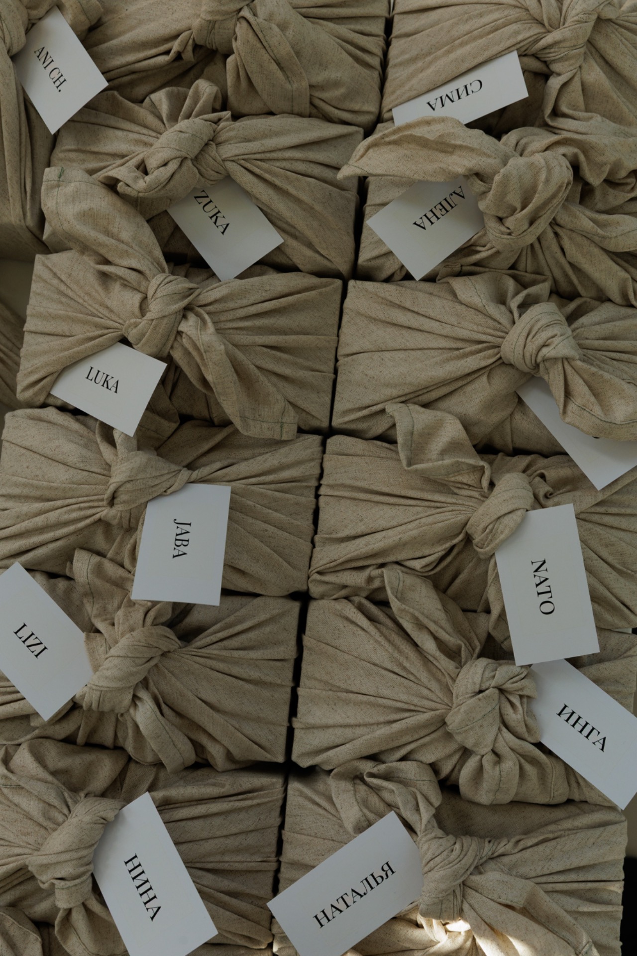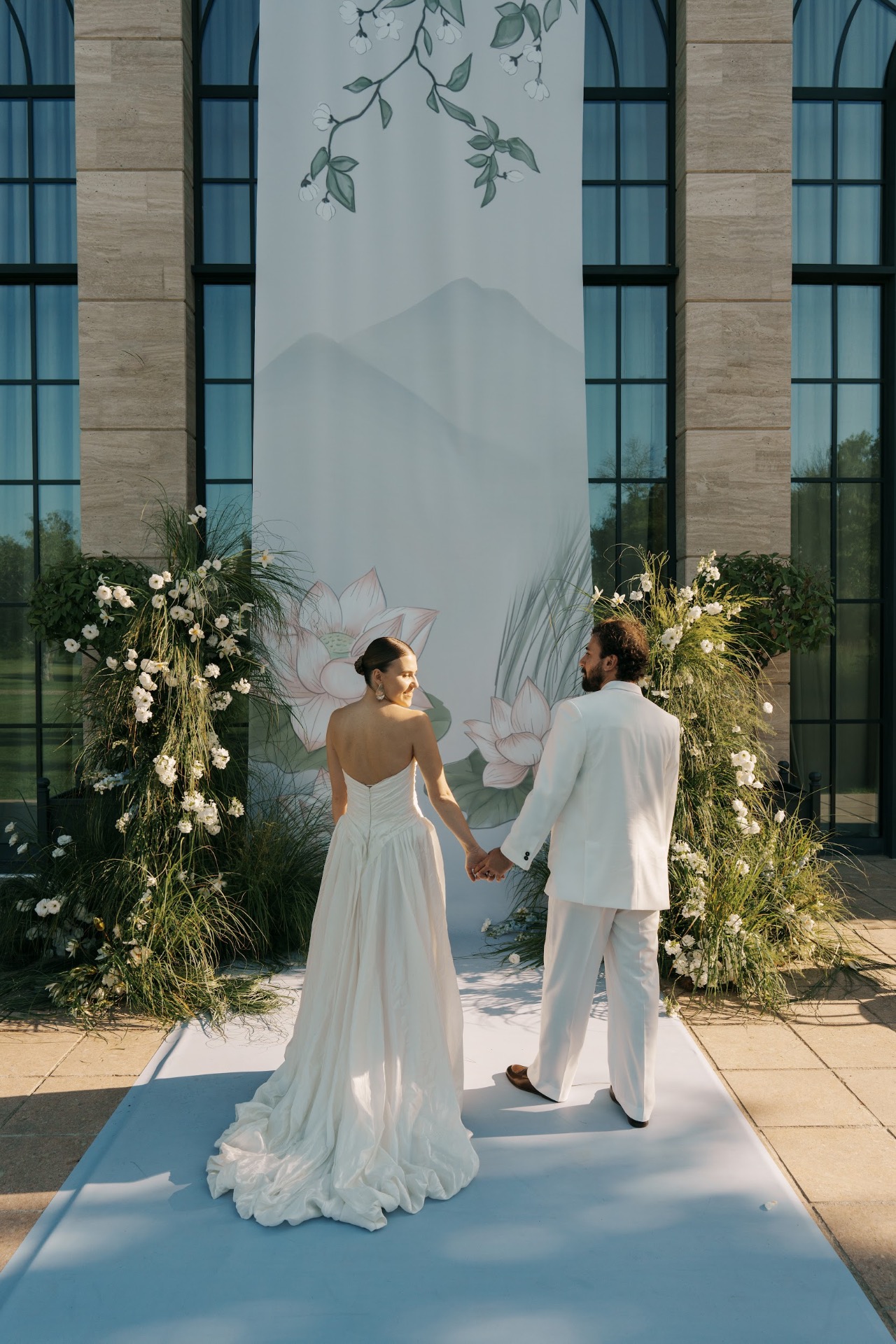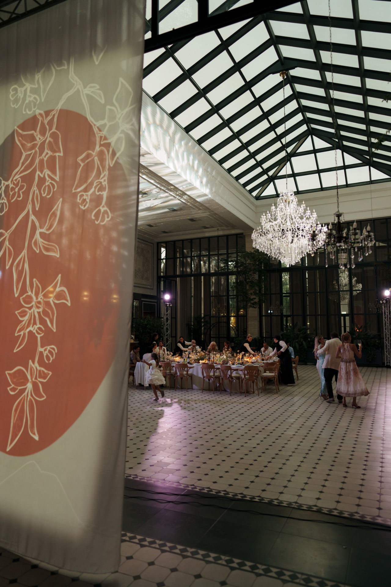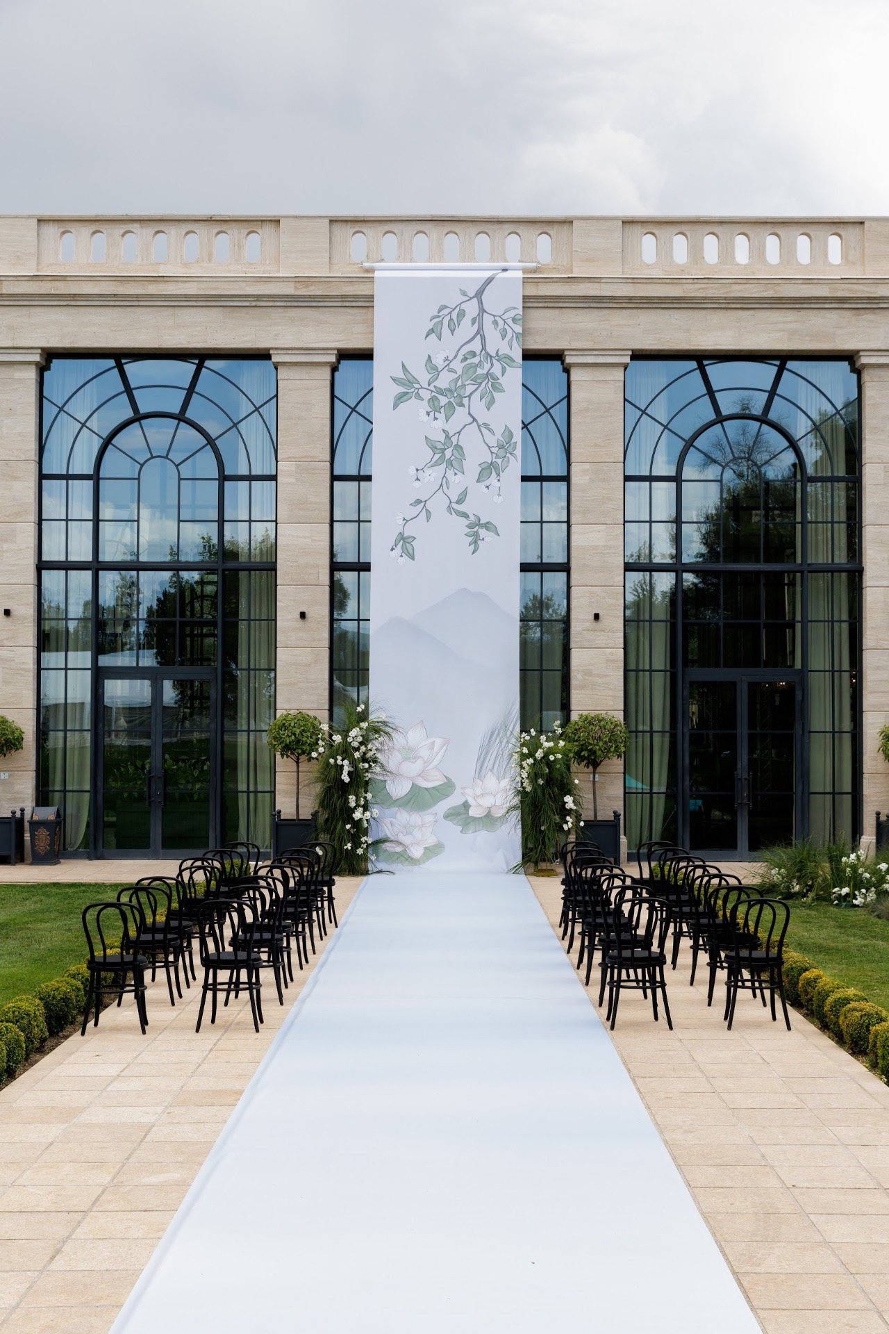 Для зоны церемонии мы вместе с дизайнерами создали баннер в природной стилистике по мотивам наших путешествий. Он был напечатан в виде свитка, напоминающего древнюю летопись, и свисал с крыши здания. В качестве сувениров для гостей мы подготовили платочки с вышивкой для трогательных моментов и изящные азиатские вееры.
