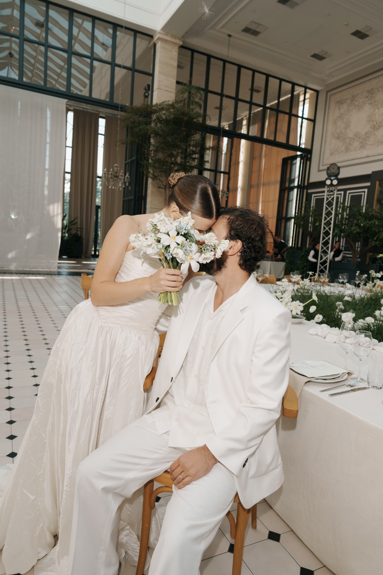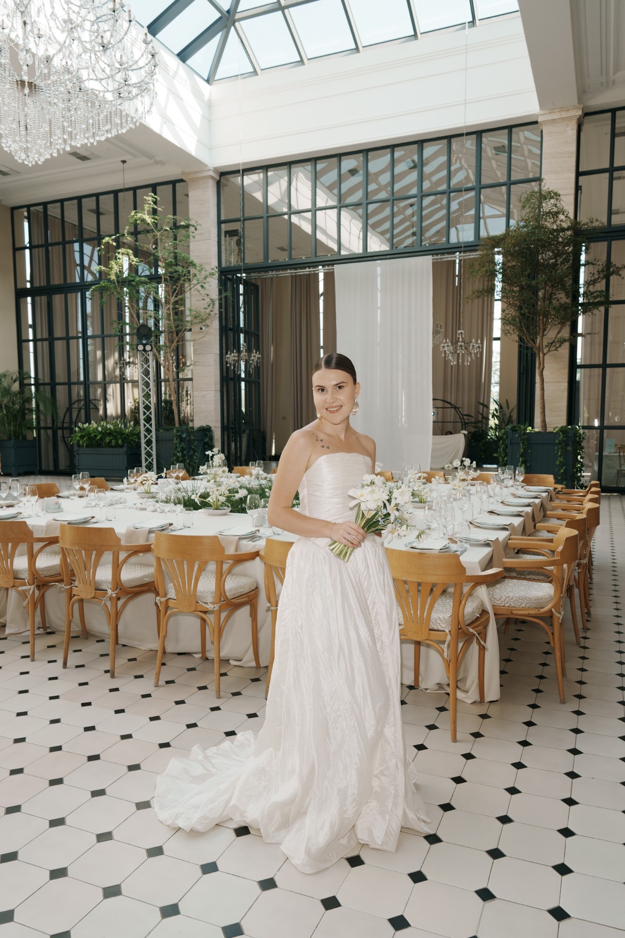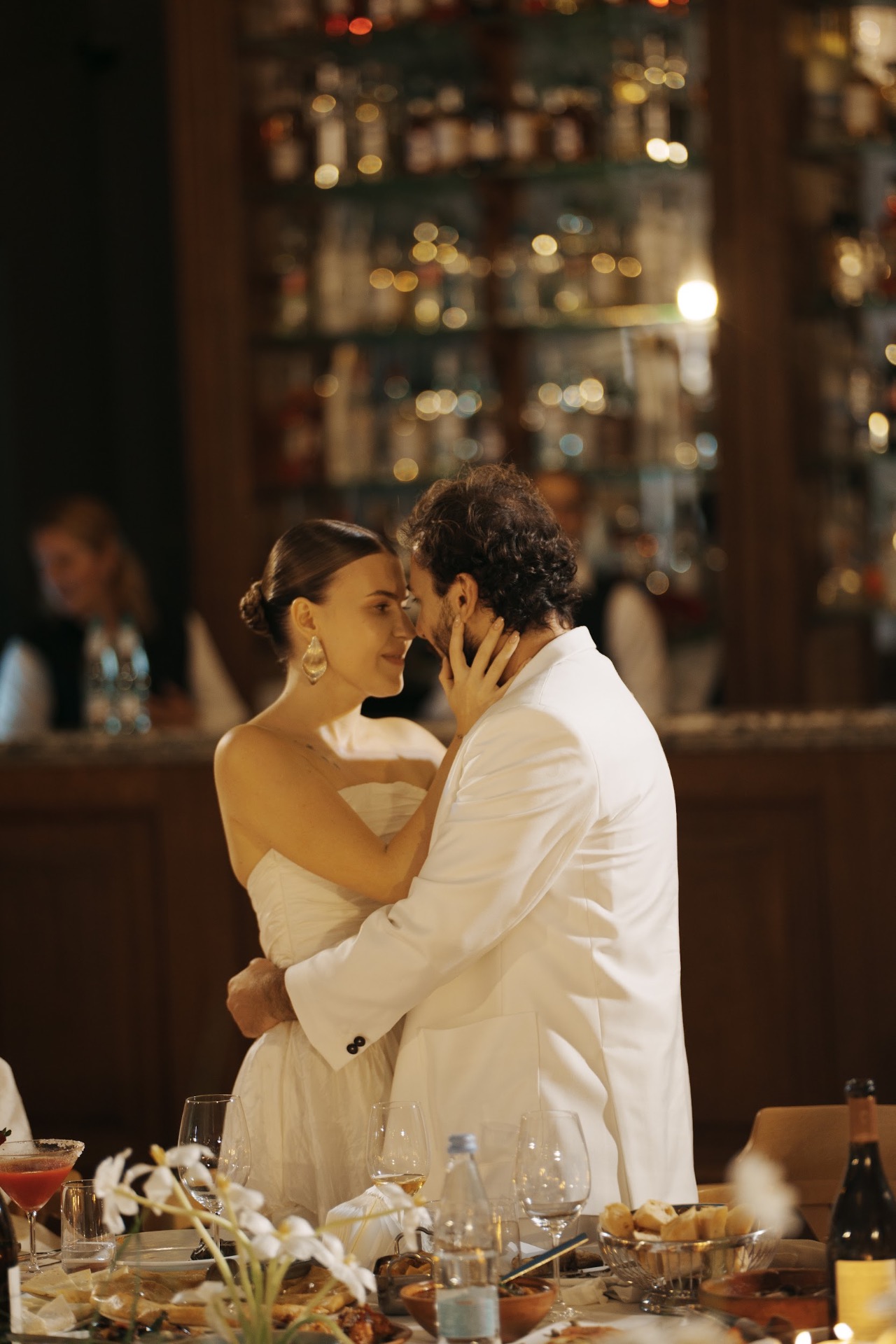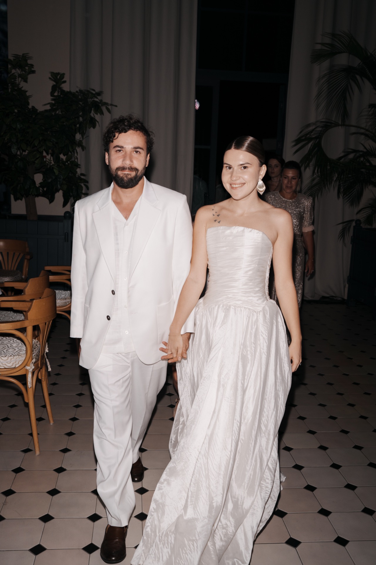 Моё платье было сшито на заказ в Perle Bridal. Я выбрала наряд, который подчёркивал естественную красоту и сочетал в себе классику с современными акцентами. Образ дополнили макияж в стиле clean makeup и аккуратный минималистичный пучок с элементами косоплетения, который мы придумали вместе со стилистом. Для меня было важно, чтобы на свадьбе я оставалась собой.