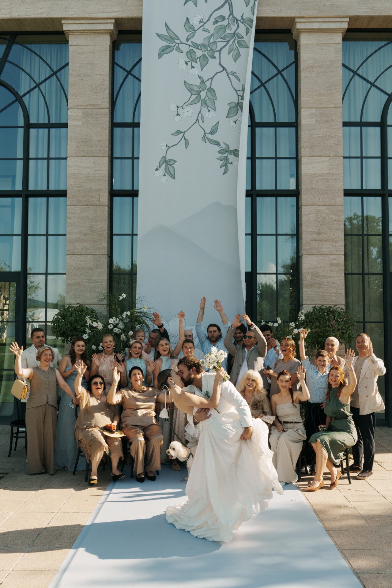 Каждое решение, связанное со свадьбой, мы принимали вместе: от выбора цветовой палитры до разработки активностей для гостей. На подготовку ушло около шести месяцев, и всё сложилось именно так, как мы мечтали.