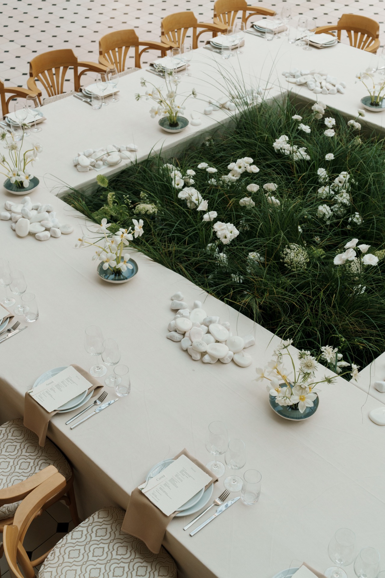 На ужине нам хотелось создать уютную атмосферу, поэтому всех гостей мы усадили за один большой квадратный стол, в центре которого разместили много зелени. Обстановку дополнял большой отрез ткани с проекцией узоров баннера и природными мотивами. Мягкий свет, керамические вазы с кензанами и свечи-камни сделали вечер особенно тёплым.