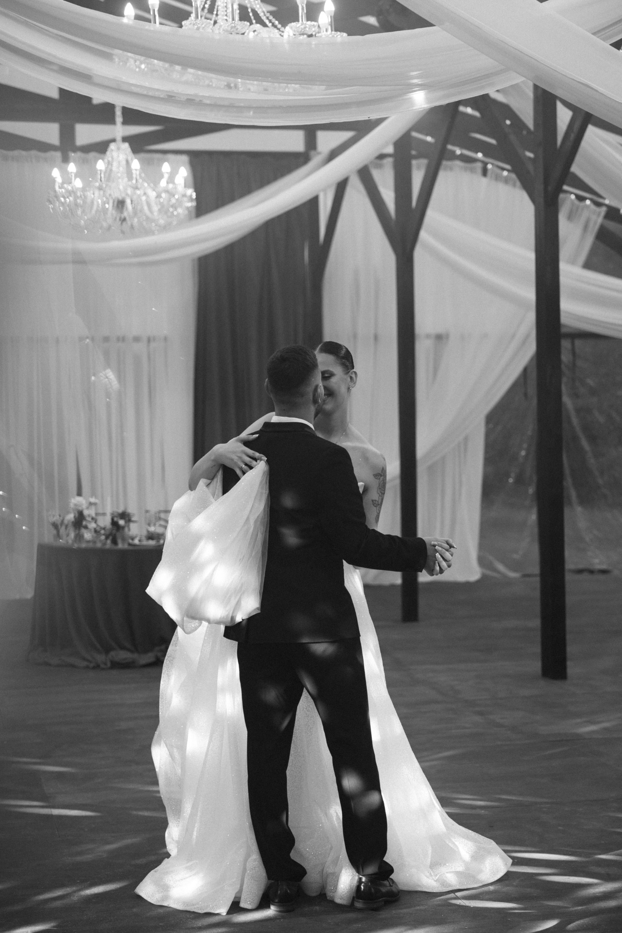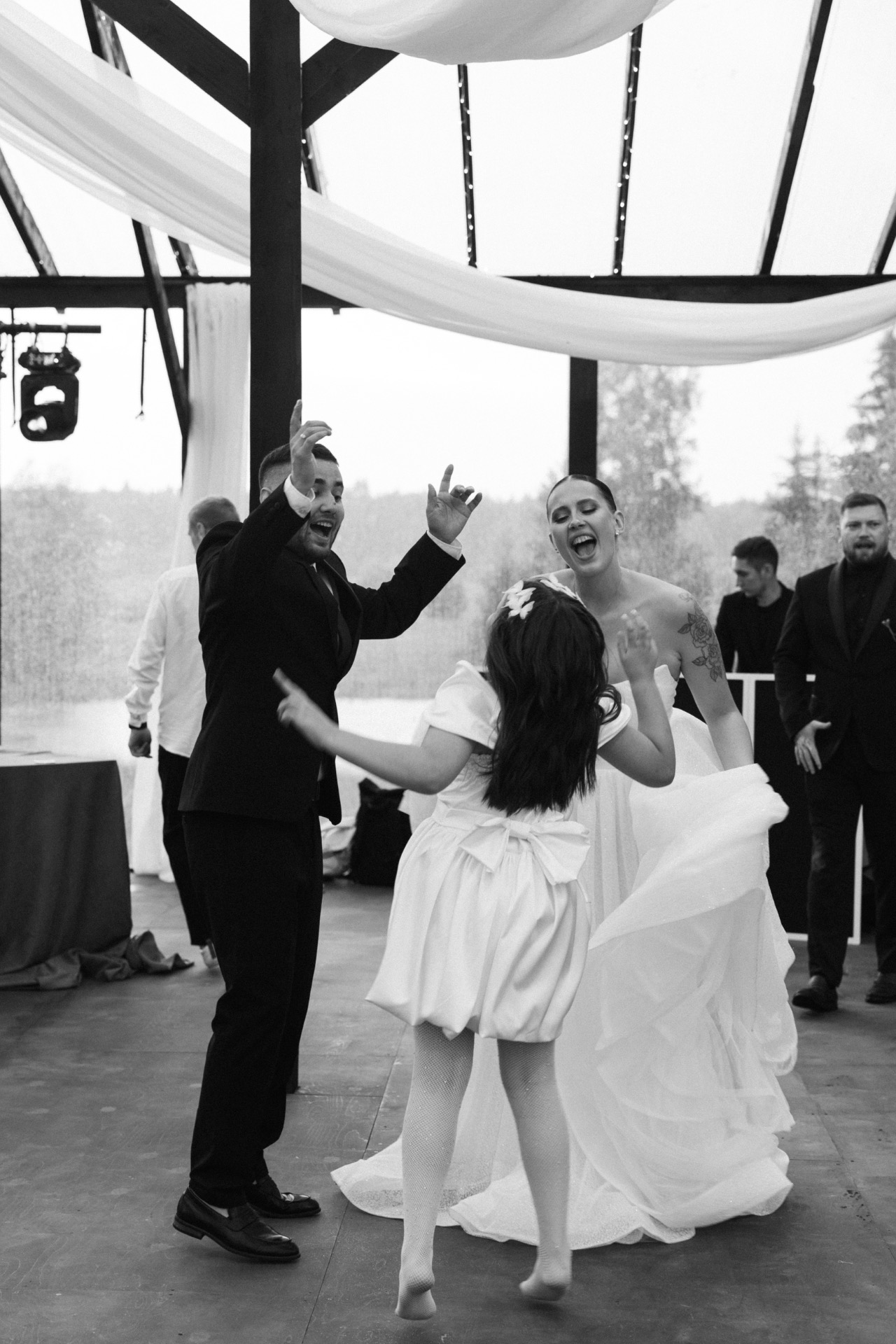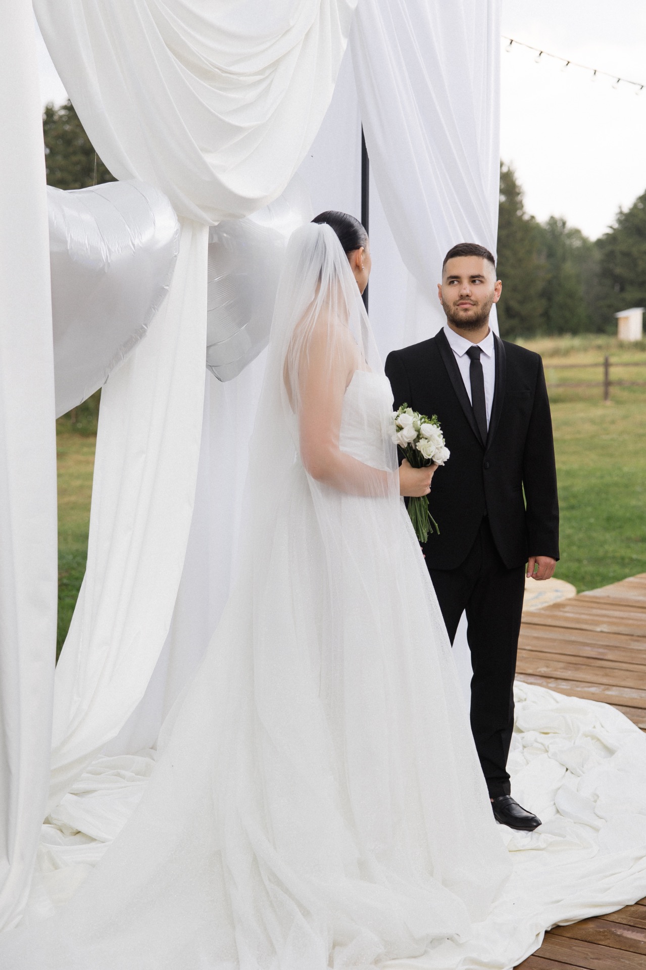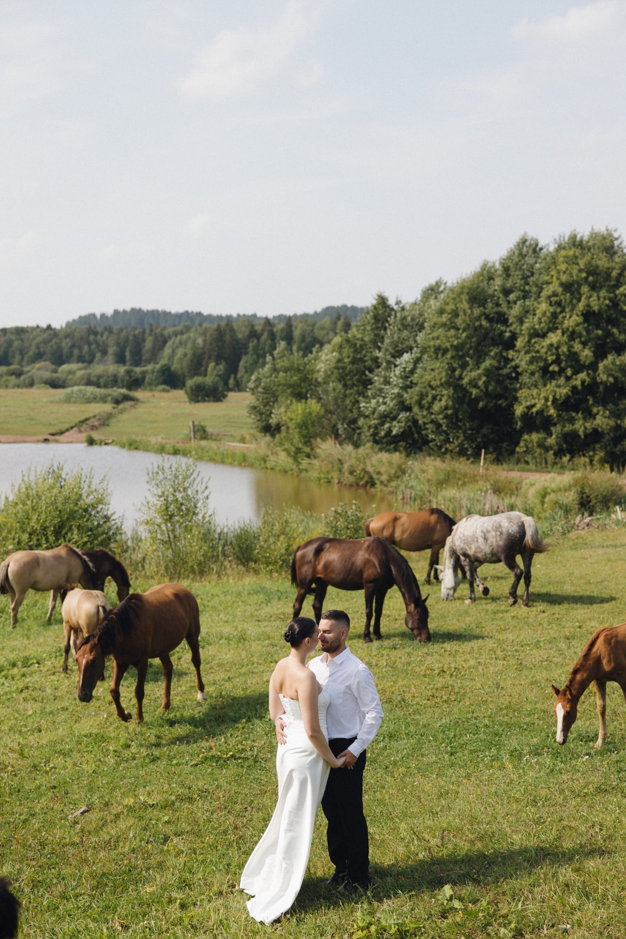 Нам хотелось, чтобы день был о нас, чтобы каждая деталь отражала наше видение. Поэтому мы выбрали площадку на природе: прозрачная терраса, вокруг зелень и небольшой водоём, виды на поля и небо. Пространство, наполненное воздухом и светом, где чувствуется свобода и умиротворение.