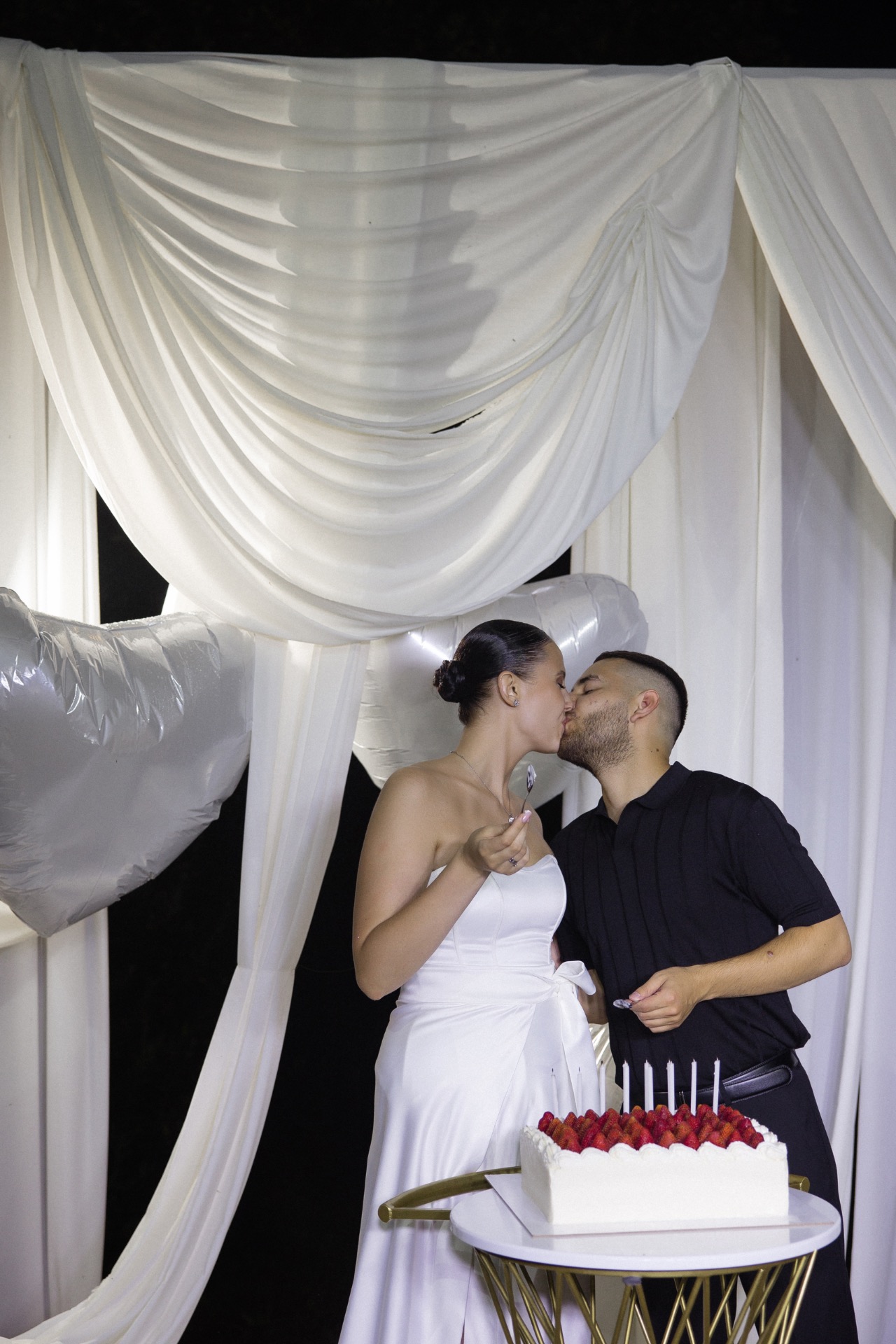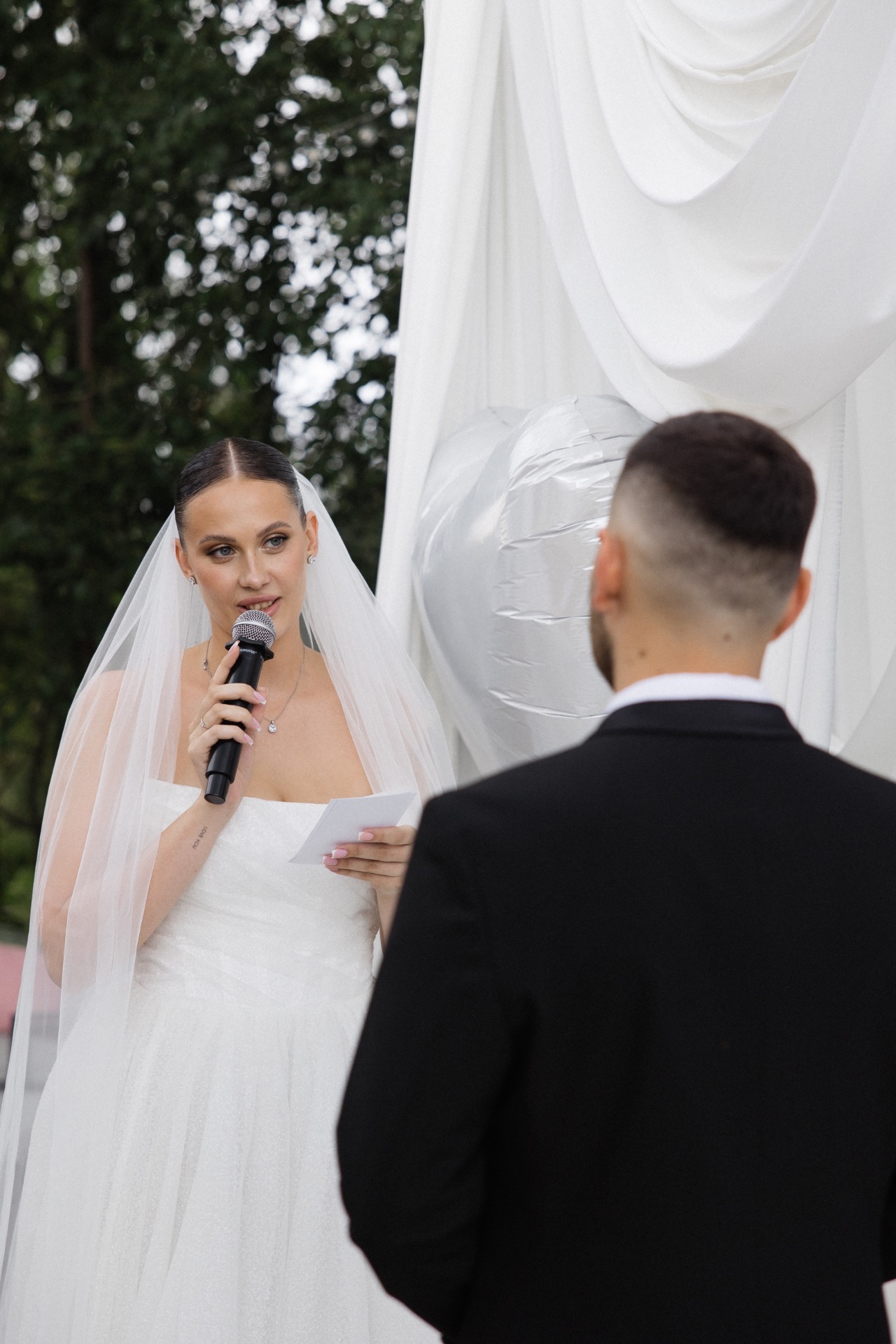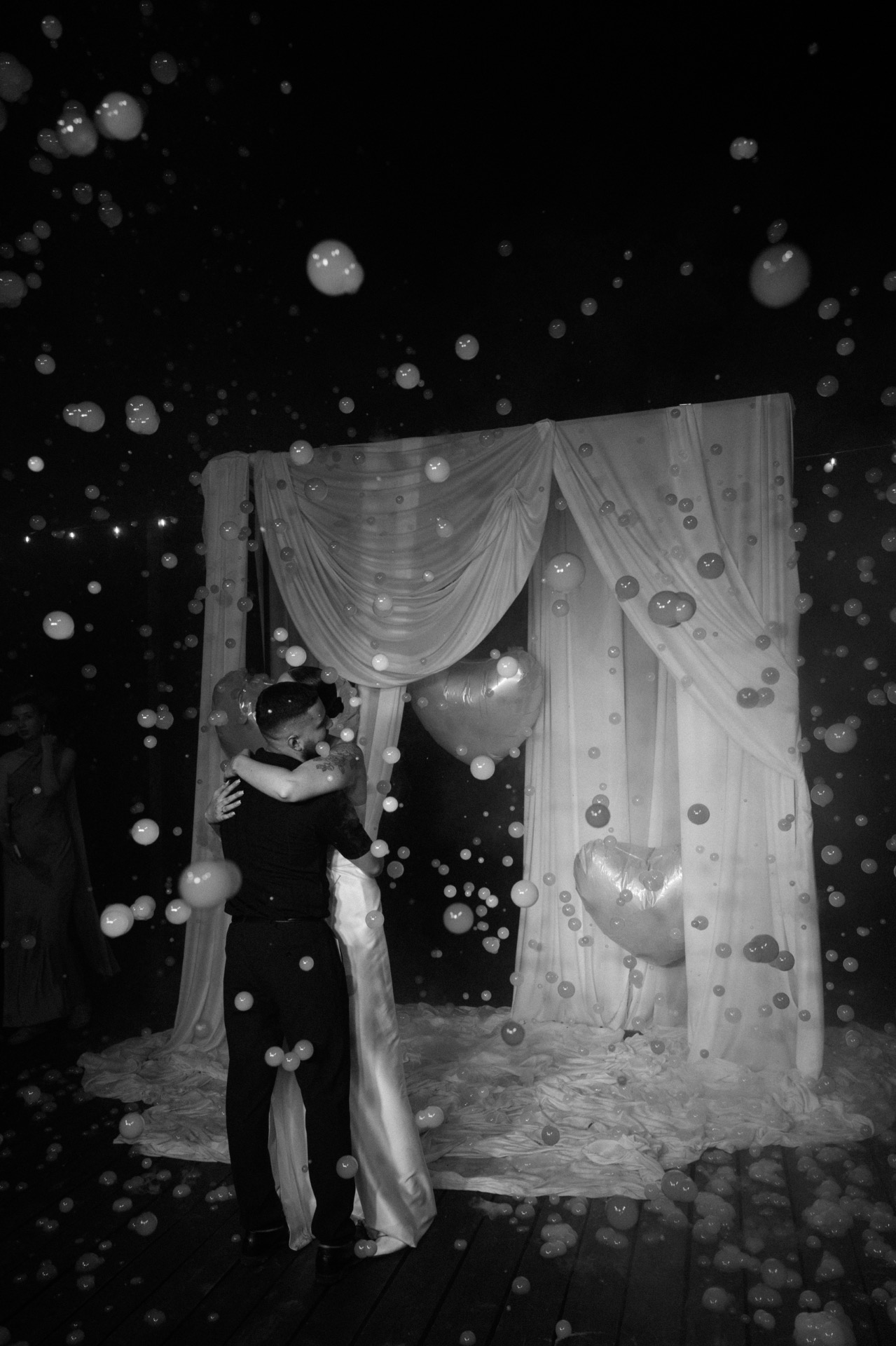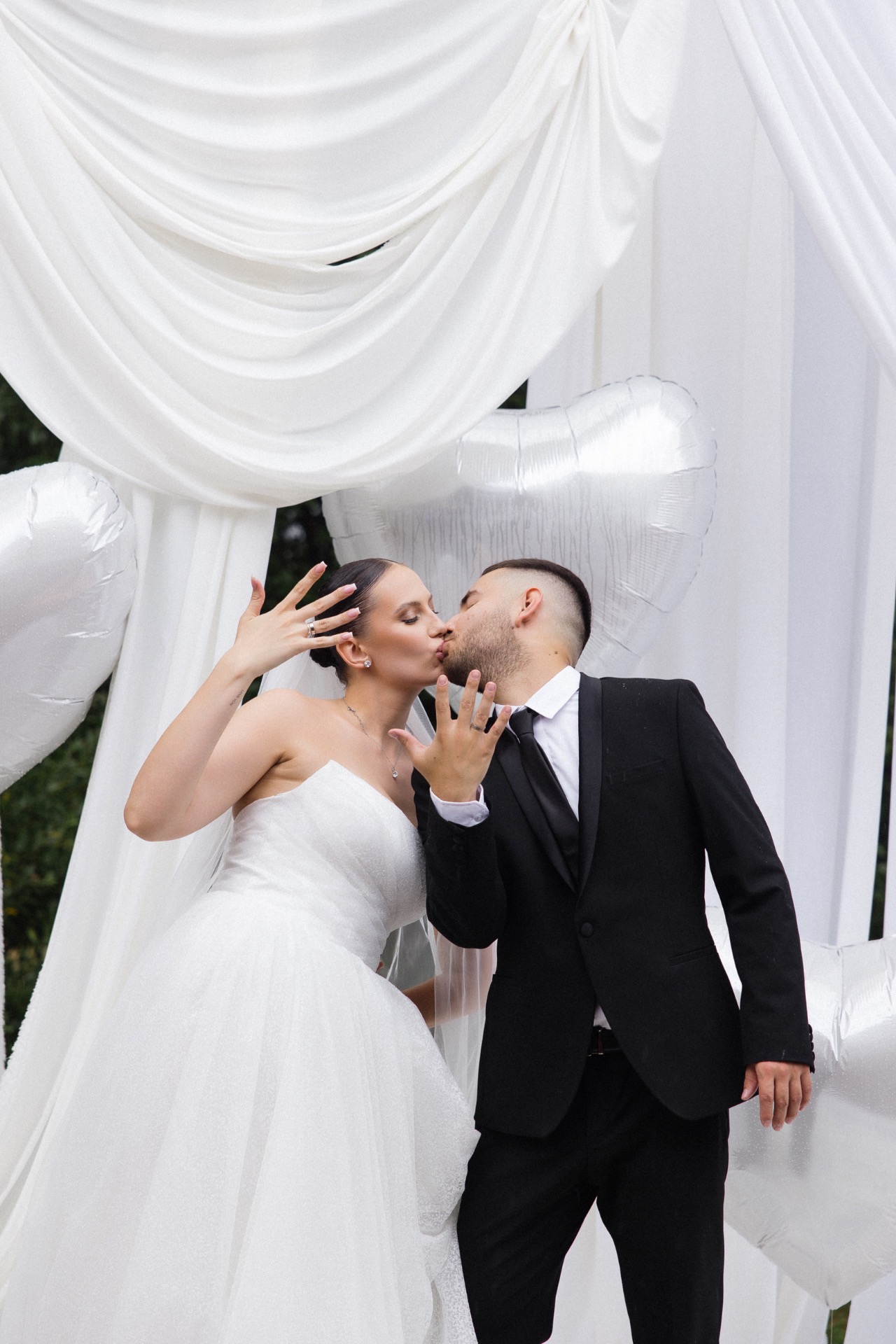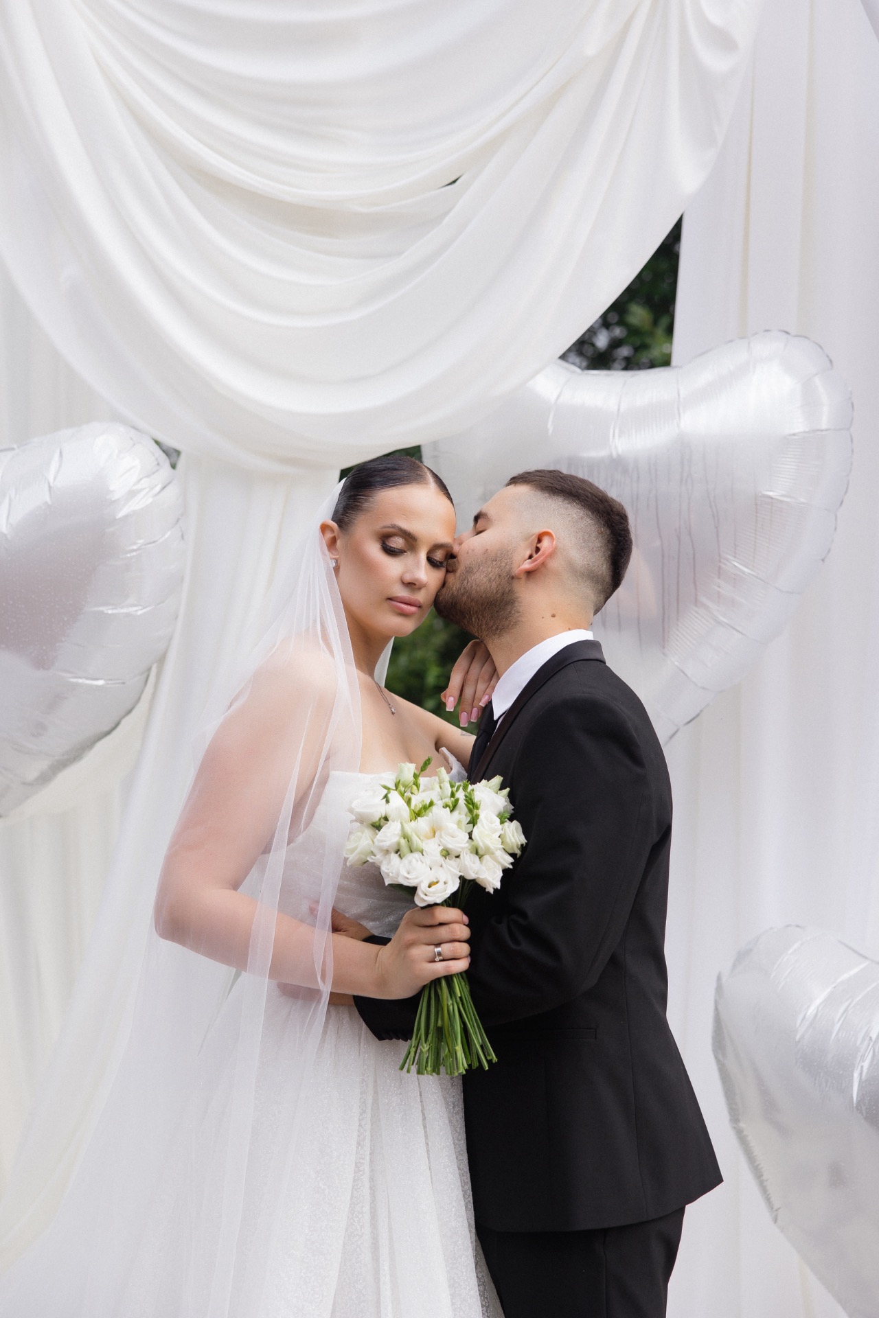 Церемония прошла на веранде террасы. Арка из лёгких тканей, воздушные шары в форме сердца — всё это выглядело как дыхание любви.
