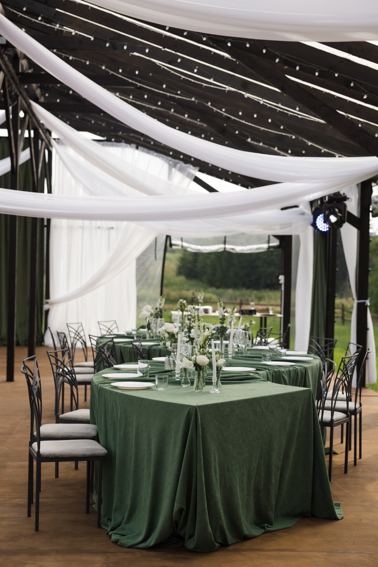 В декоре мы сделали ставку на минимализм: белые и тёпло-зелёные цвета, лёгкие ткани, струящиеся драпировки, свечи и цветочные линии вдоль столов.