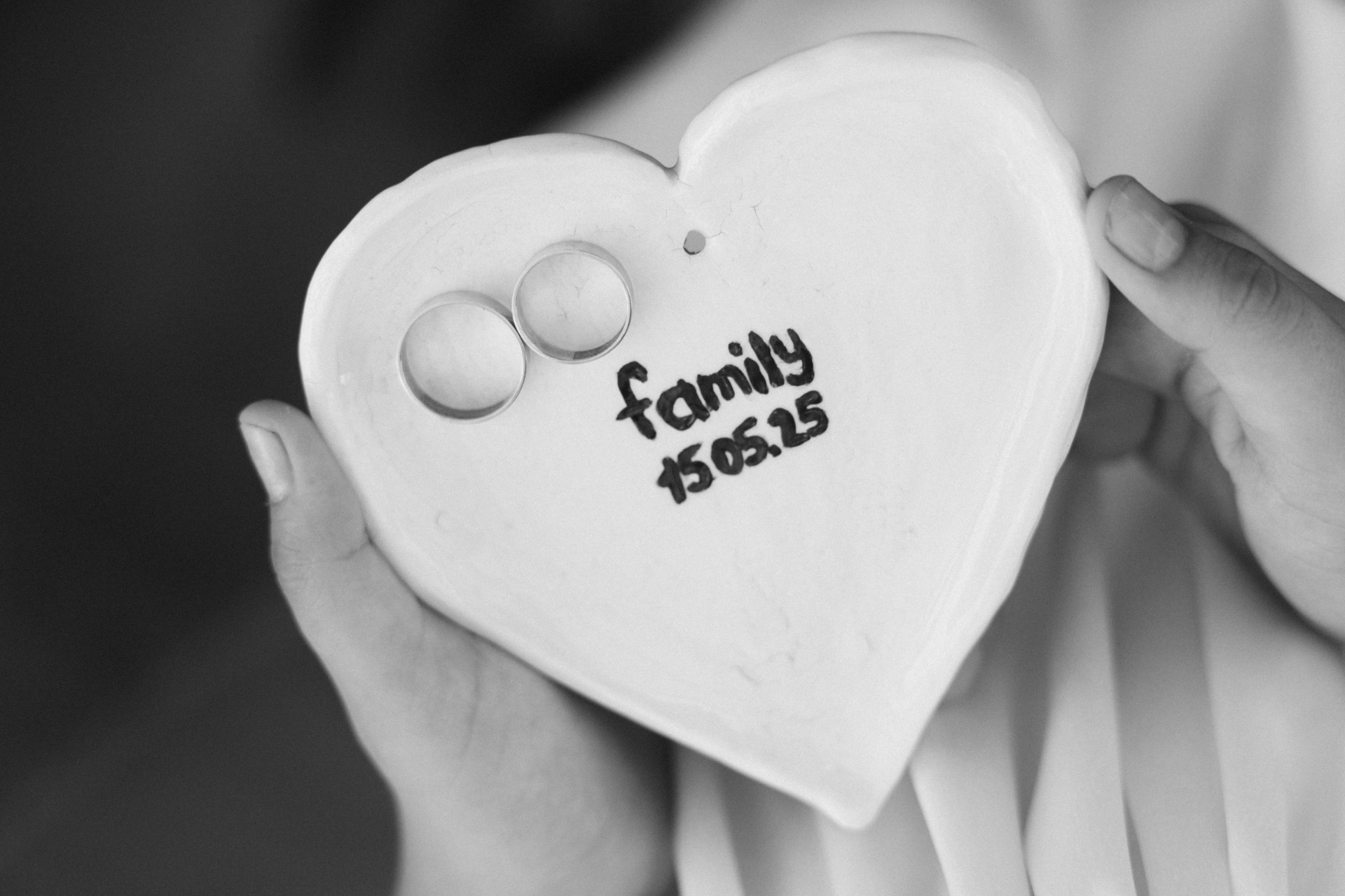Кольца нам вынесла наша дочь — на тарелочке из глины, которую мы сделали вместе в день росписи. Она получилась неидеальной, с отпечатками, трещинками, но именно в этом и был её особый шарм.