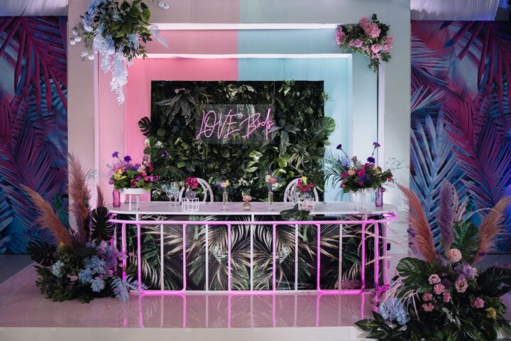 Наша свадьба называлась «Love birds». Изначально мы пришли к организатору с запросом на тропическую тему. Очень нравились яркие цвета, неон, листья-монстеры. За год до планирования свадьбы мы побывали в Тайланде и очень вдохновились тропиками. А влюблённые птицы, потому что мы всегда вместе, как попугайчики-неразлучники.