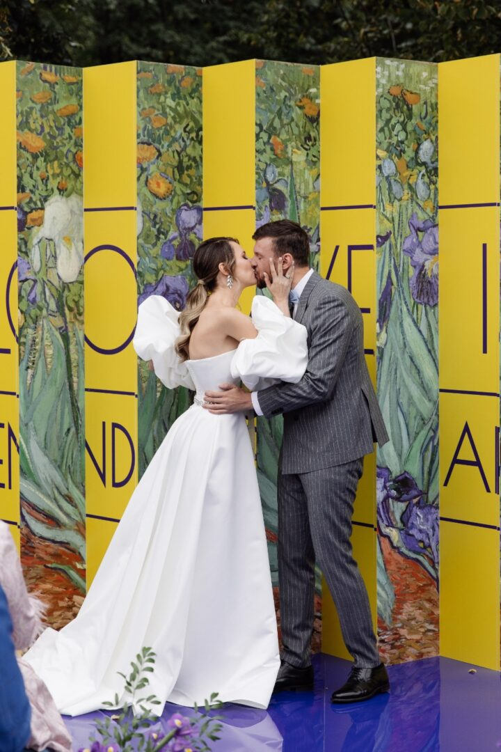 В качестве основного мотива свадьбы мы выбрали искусство. Нам хотелось, чтобы искусство было не просто абстрактной темой. Нам было важно создать что-то, в чем будут объединяться эпохи, привнести в старое новые смыслы. Поэтому для церемонии была произведена интерактивная конструкция в духе музеев современного искусства — в зависимости от угла зрения гости видели: слоган «Love is endless art» (я сама придумала эту фразу), картину Ван Гога «Ирисы» или всё вместе.