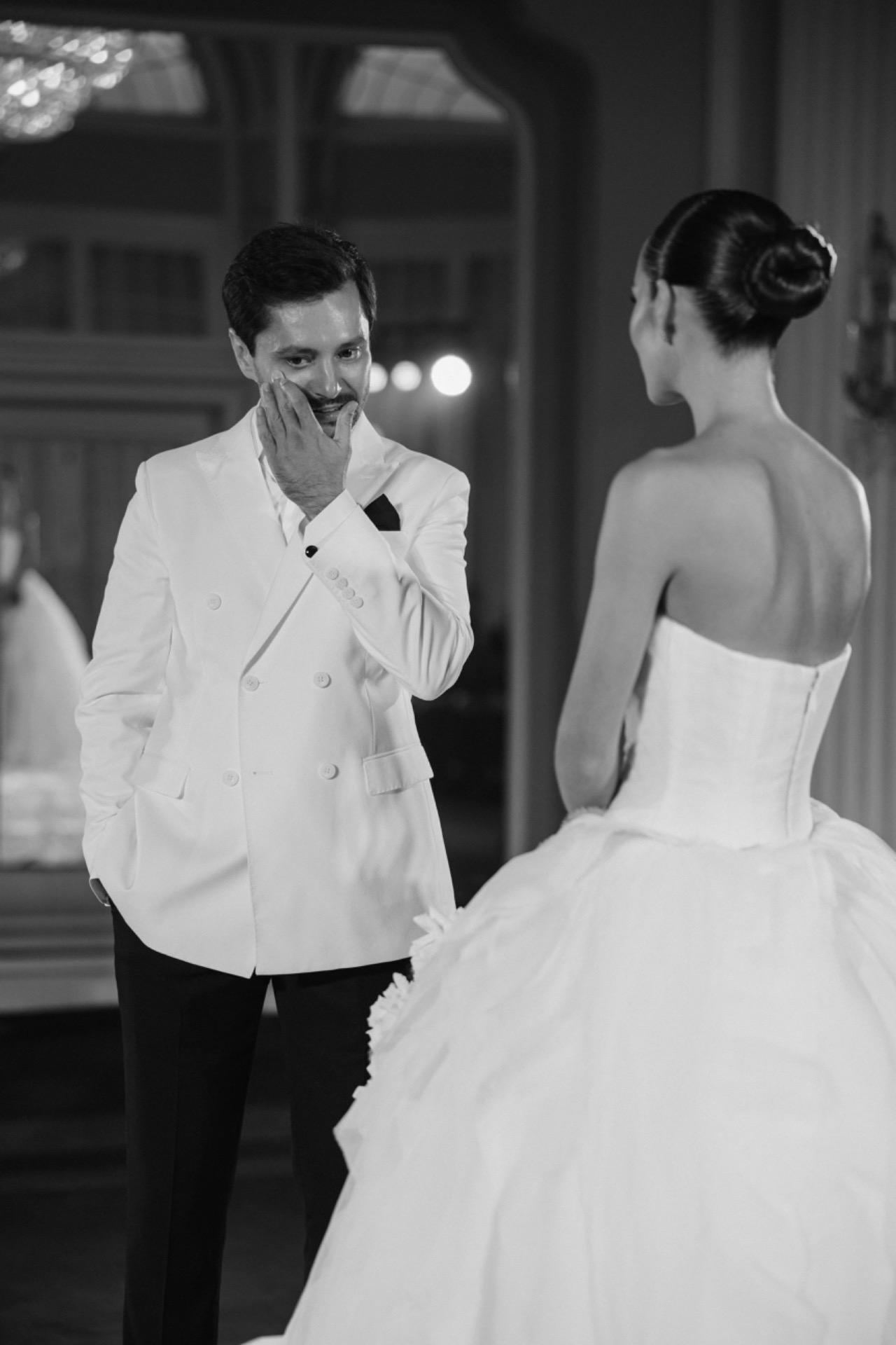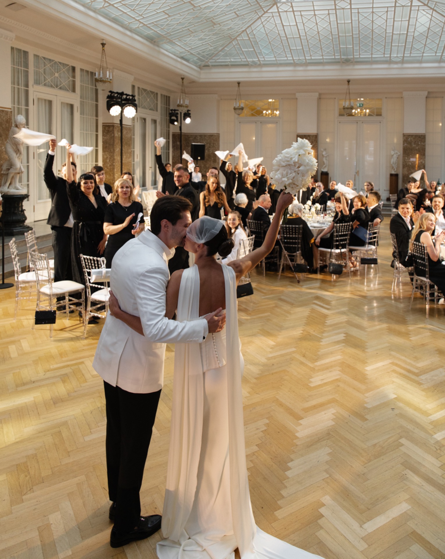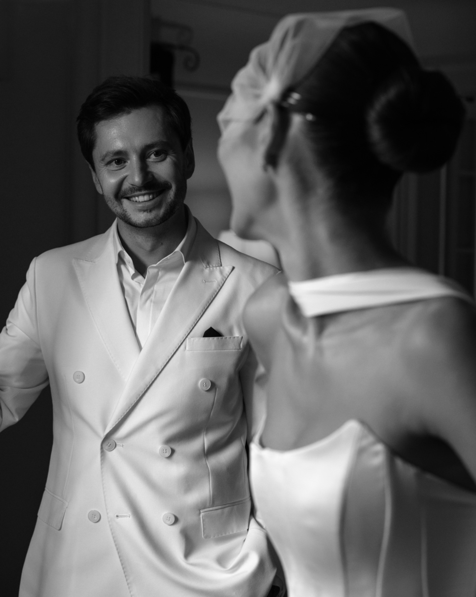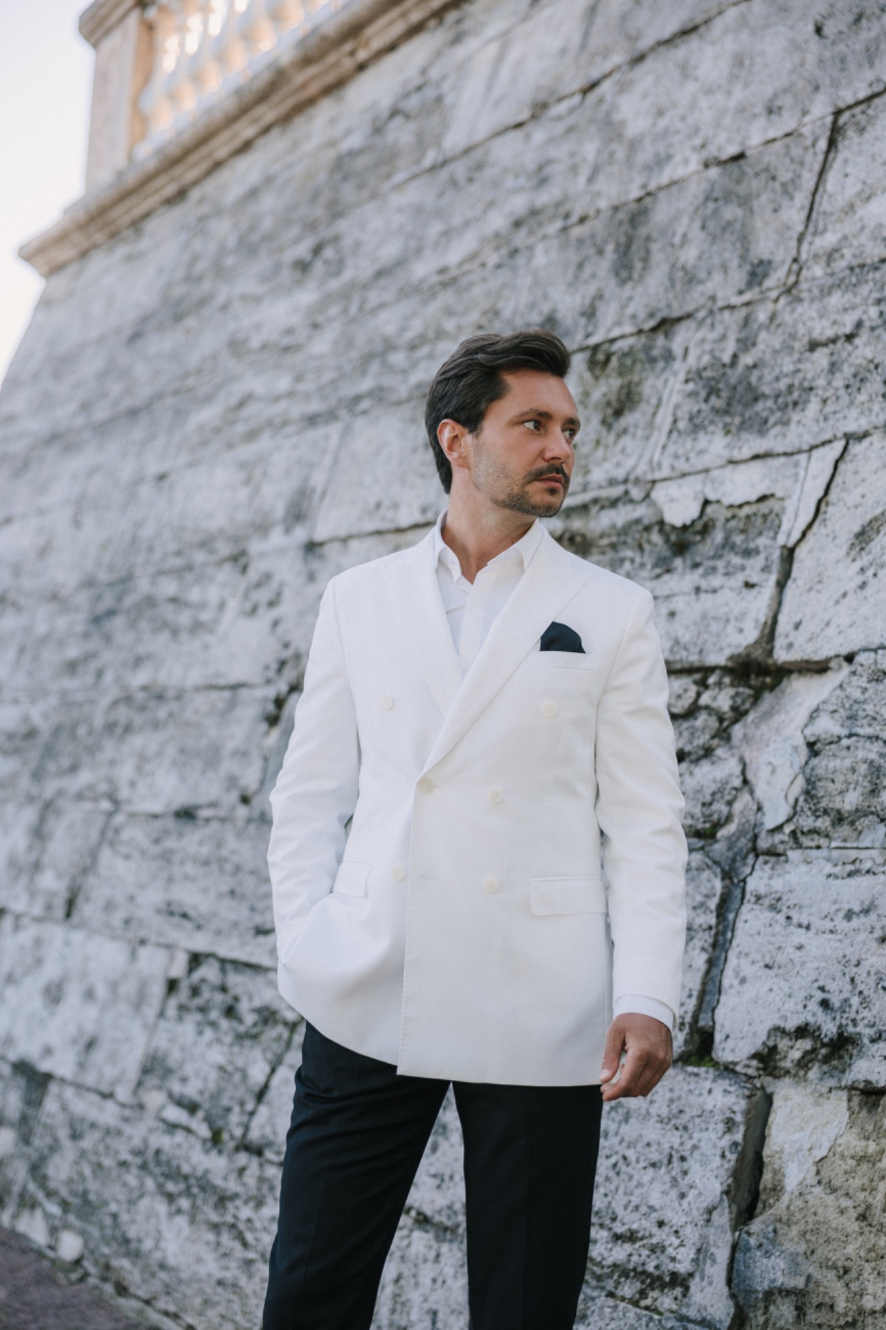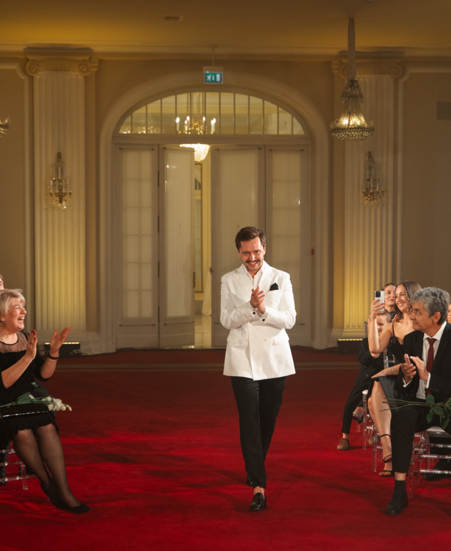 Образ Серёжи получился не менее стильным: итальянский двубортный пиджак с лаковыми лоферами. Сначала он выбрал классический чёрный, но позже понял, что хочет выделяться, и нашёл идеальный белый. Мы выбрали чёрный дресс-код — строгий, но невероятно стильный. Сначала старшие гости переживали, что чёрный будет выглядеть траурно. Но в день свадьбы все признали: это смотрелось потрясающе. Мужчины в смокингах, женщины в длинных платьях — словно кадр из красивого фильма.