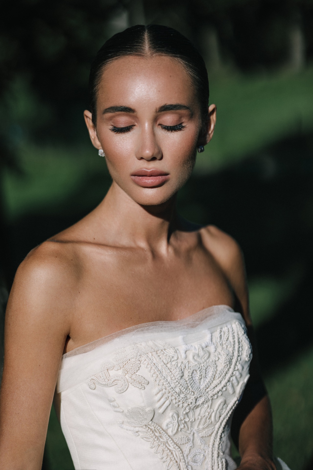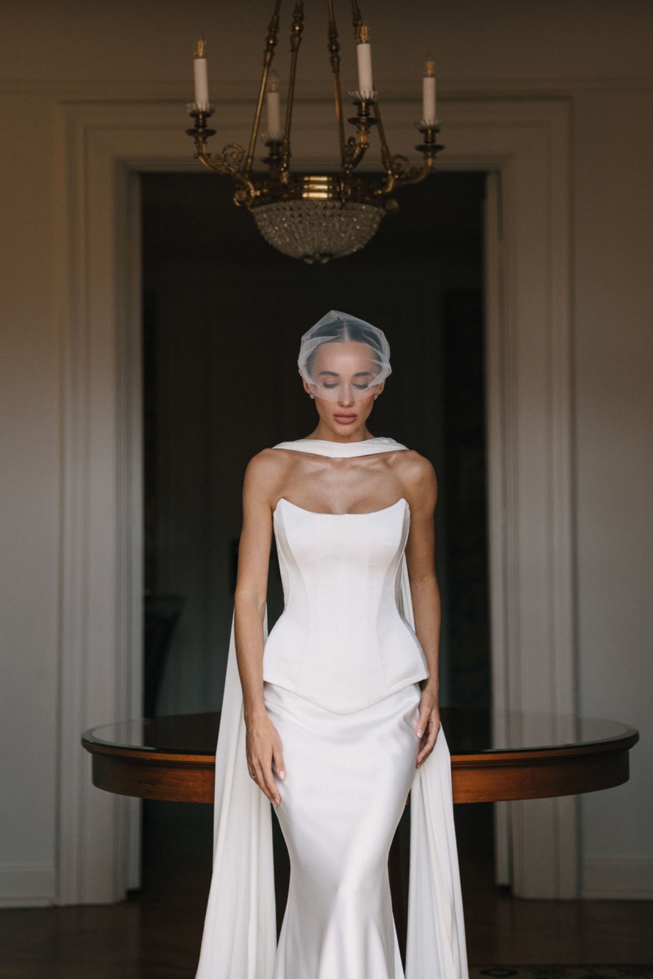 Для банкета я выбрала второе платье — силуэтное, длинное, сшитое на заказ. Я обошла почти все салоны Петербурга, но «своего» так и не нашла. Дизайнер создала для меня идеальный корсет, а к вечеру мы добавили второй вариант — короткую юбку с лёгкой драпировкой. Получился образ для танцев и улыбок, но при этом он оставался свадебным.