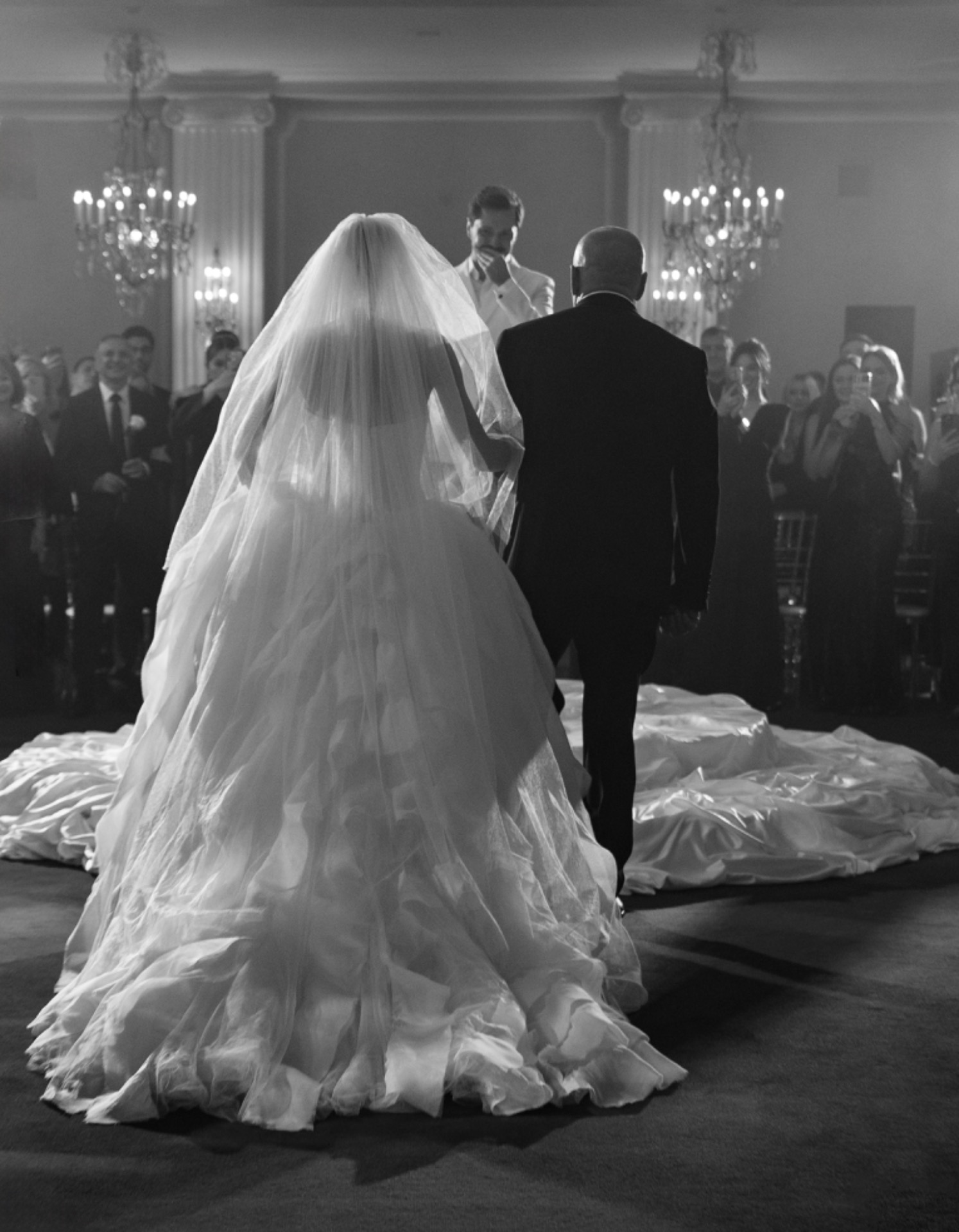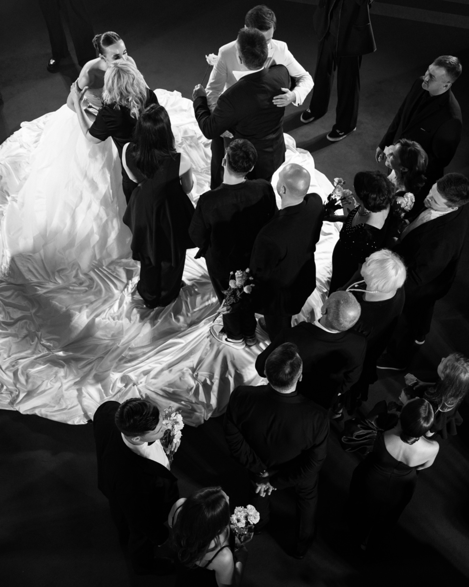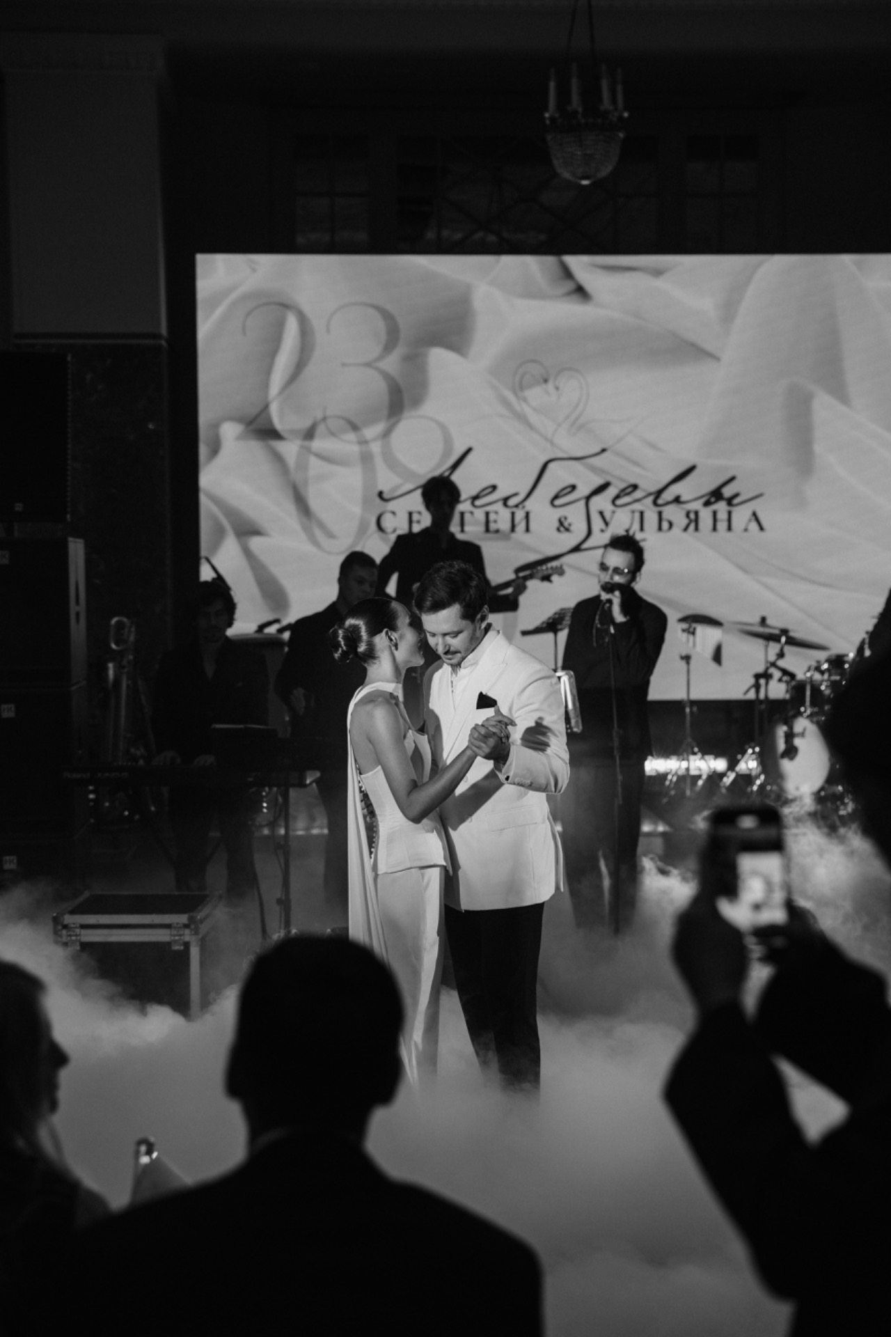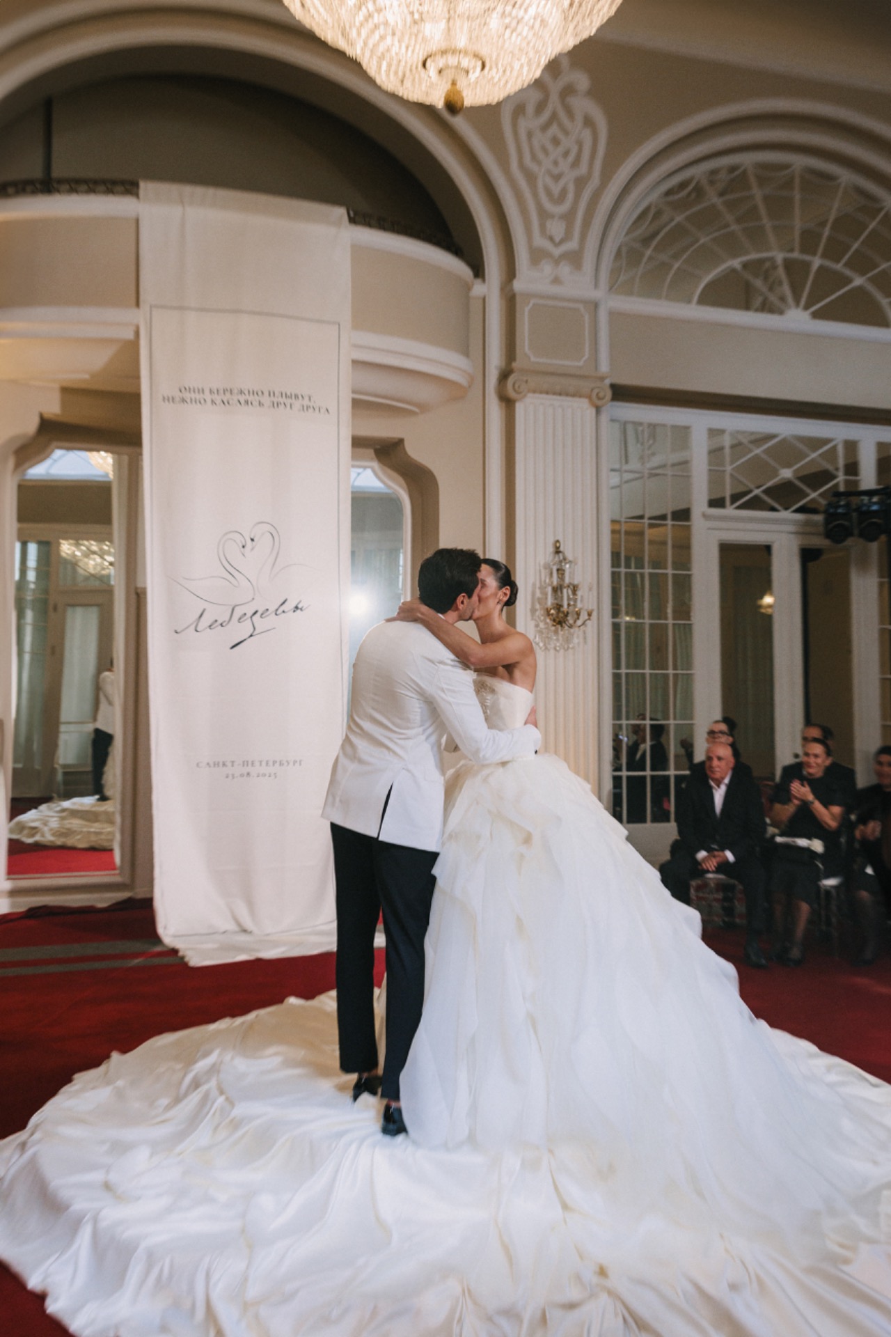 Когда я шла под руку с папой, Серёжа впервые увидел меня в платье. В кульминационный момент с балкона спустилось полотно с нашей общей фамилией. После церемонии нас ждали тёплые объятия, общее фото и смена моего образа.