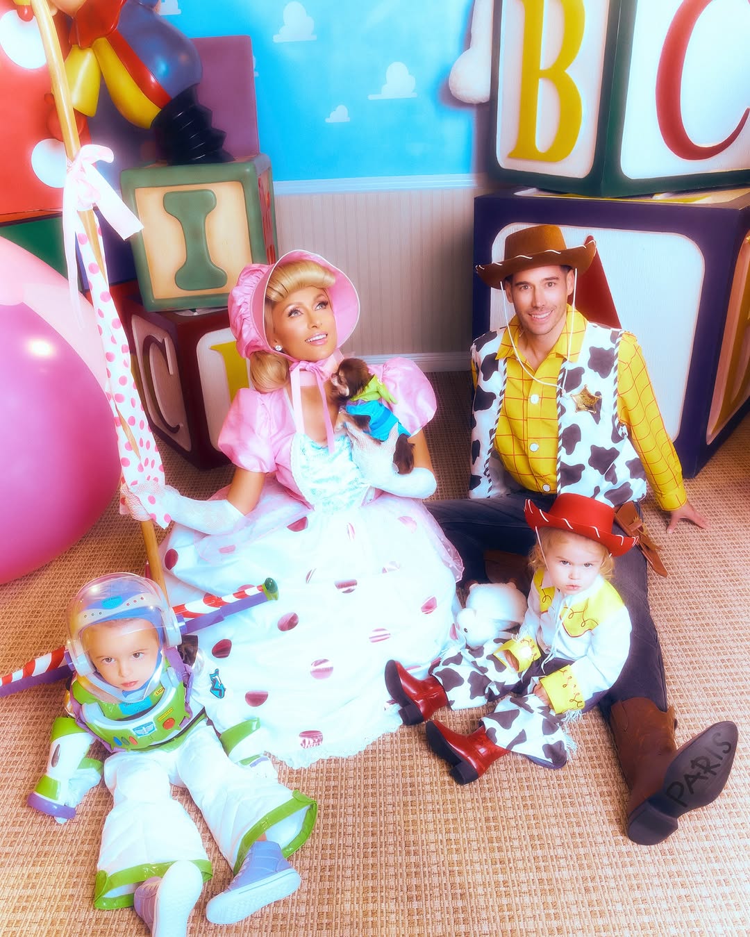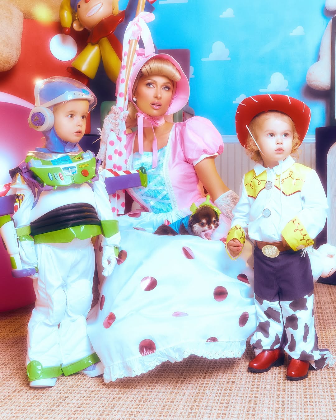 В этом году икона нулевых стала рекордсменом по образам на Хэллоуин. Помимо сольного образа, девушка преобразилась в фею Динь-Динь из «Питера Пэна» и Бо Пип из «Истории игрушек». Компанию в этих перевоплощениях ей составили её муж, дети и собака.