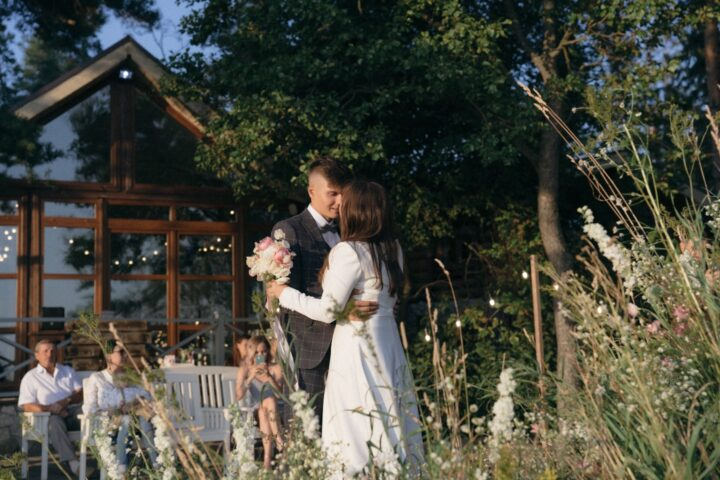 Основным критерием выбора площадки был залив! Очень хотелось свадьбу на заливе, камерный уютный вечер, танцы босиком, вечернюю церемонию в лучах заходящего солнца! Палитра свадьбы была в пудровых оттенках, всё было очень тонко и нежно. Торт был лаконичный, белый в один ярус, но с изюминкой — маленькие озорные ромашки.