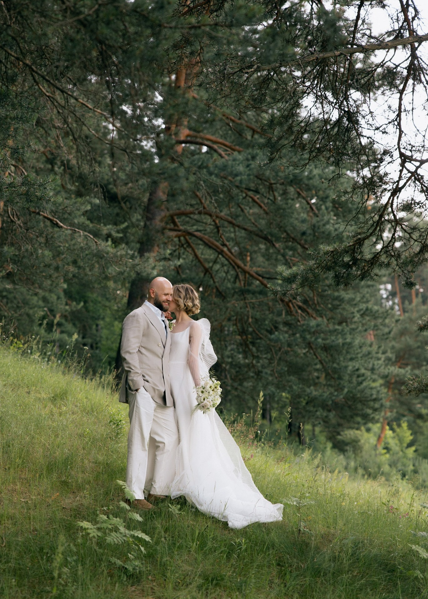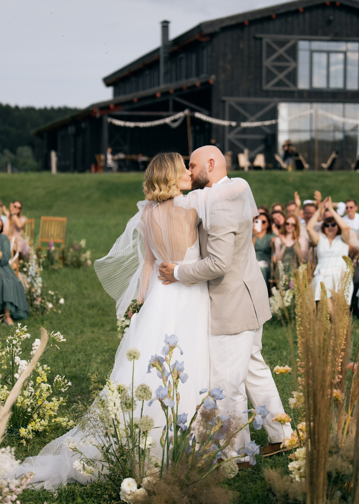 Нам очень хотелось свадьбу на природе, лёгкую и воздушную; длинные деревянные столы, палитру, близкую к природным оттенкам, полевые и фермерские цветы и больше расслабленности.