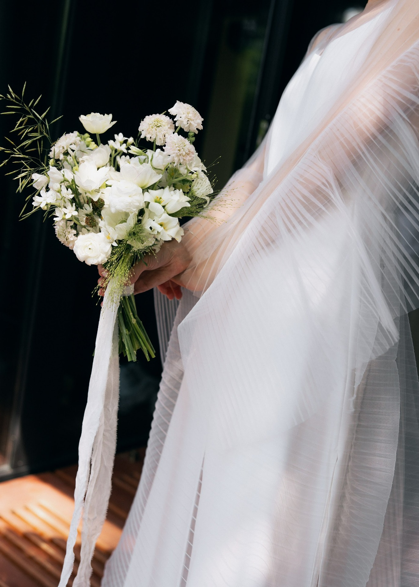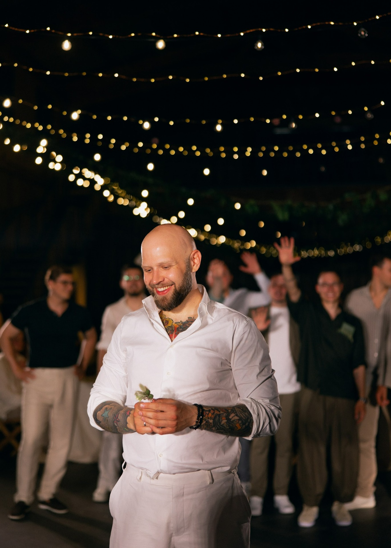 Жених также не представлял себя в классическом чёрном смокинге. Он выбрал белые брюки и серо-бежевый двубортный пиджак в Suit Supply и лоферы в 12storeez.