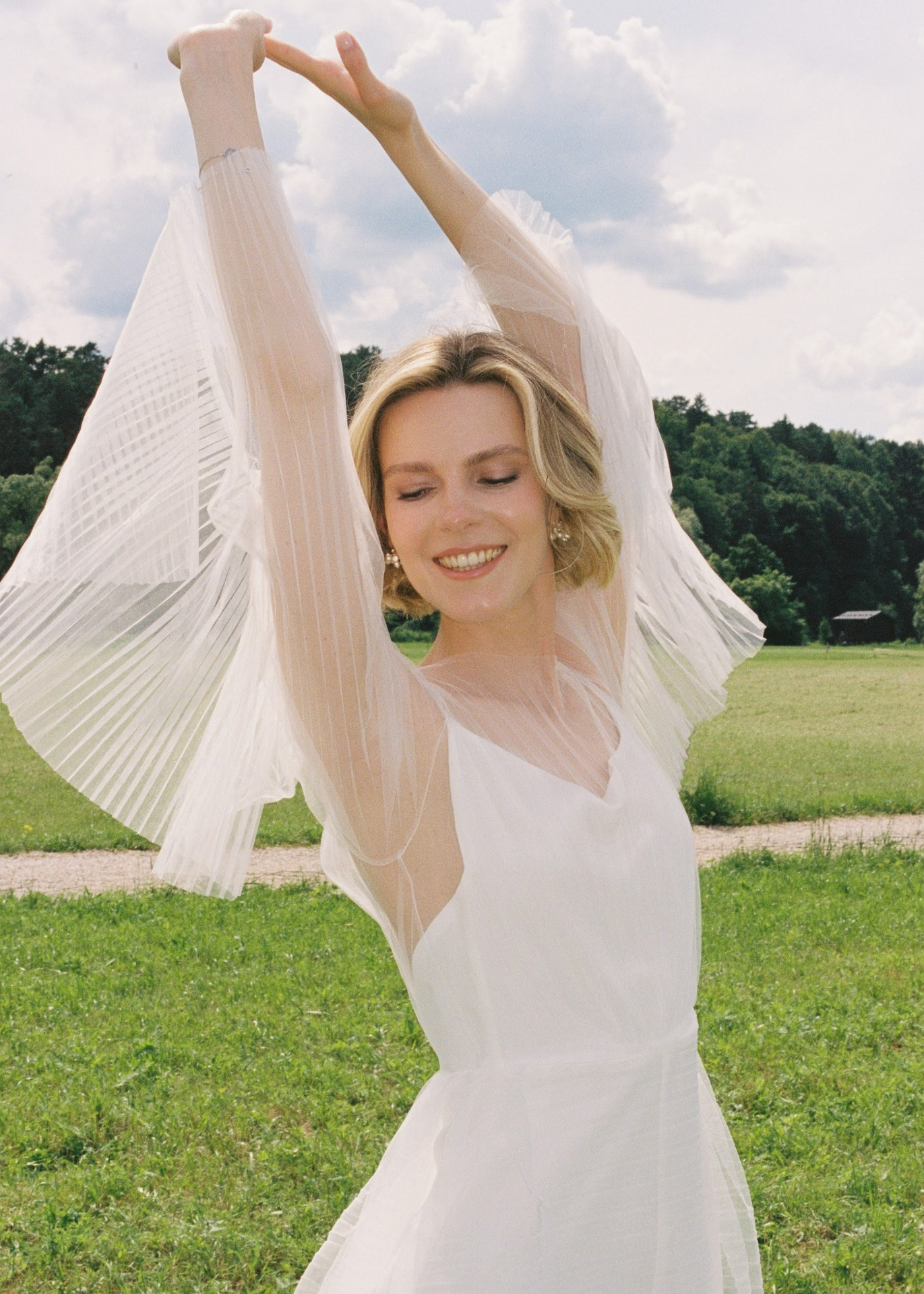 Я сразу знала, какое это будет платье, но долго не могла найти его в Москве. В итоге нашла у прекрасной Нэсти Одиной и шила на заказ. Это моё платье мечты: воздушное из полупрозрачной ткани, с рукавами и элегантно закрытой спиной сверху, которое в середине вечера превращается в шикарное шёлковое платье с разрезами на тонких бретелях. И прекрасные серебряные босоножки Alevi, которые оказались самыми удобными туфлями на каблуках.