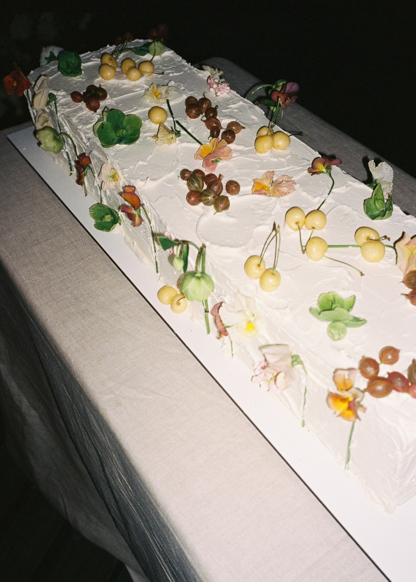 Было всё очень просто, потому что всё, что предлагало агентство было про нас. Огоньки, флажки, зона церемонии без арки, а просто цветочные композиции и прямоугольный торт, немного небрежный с ягодами и цветами — всё как мы хотели!