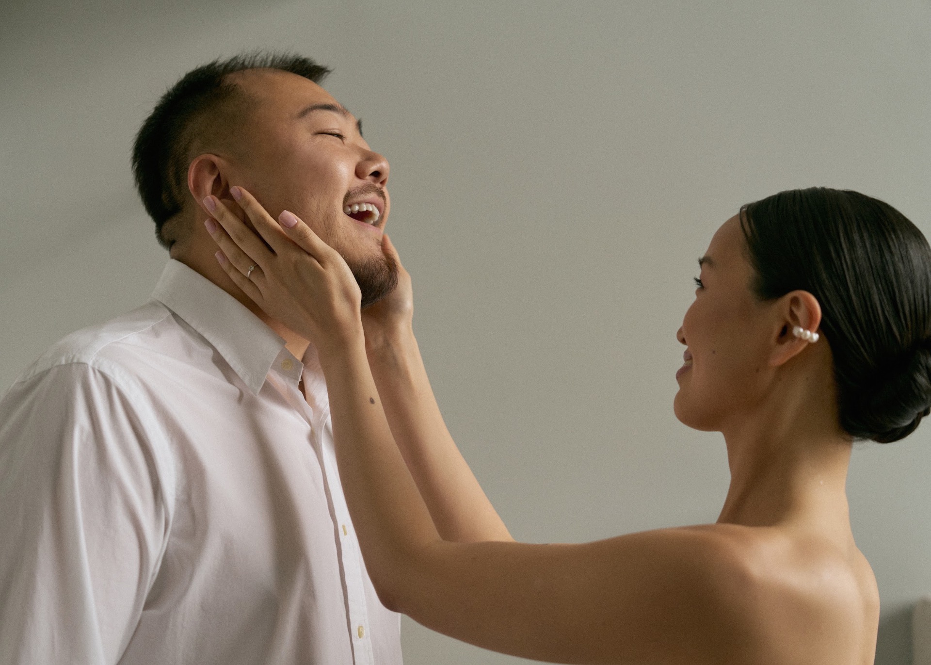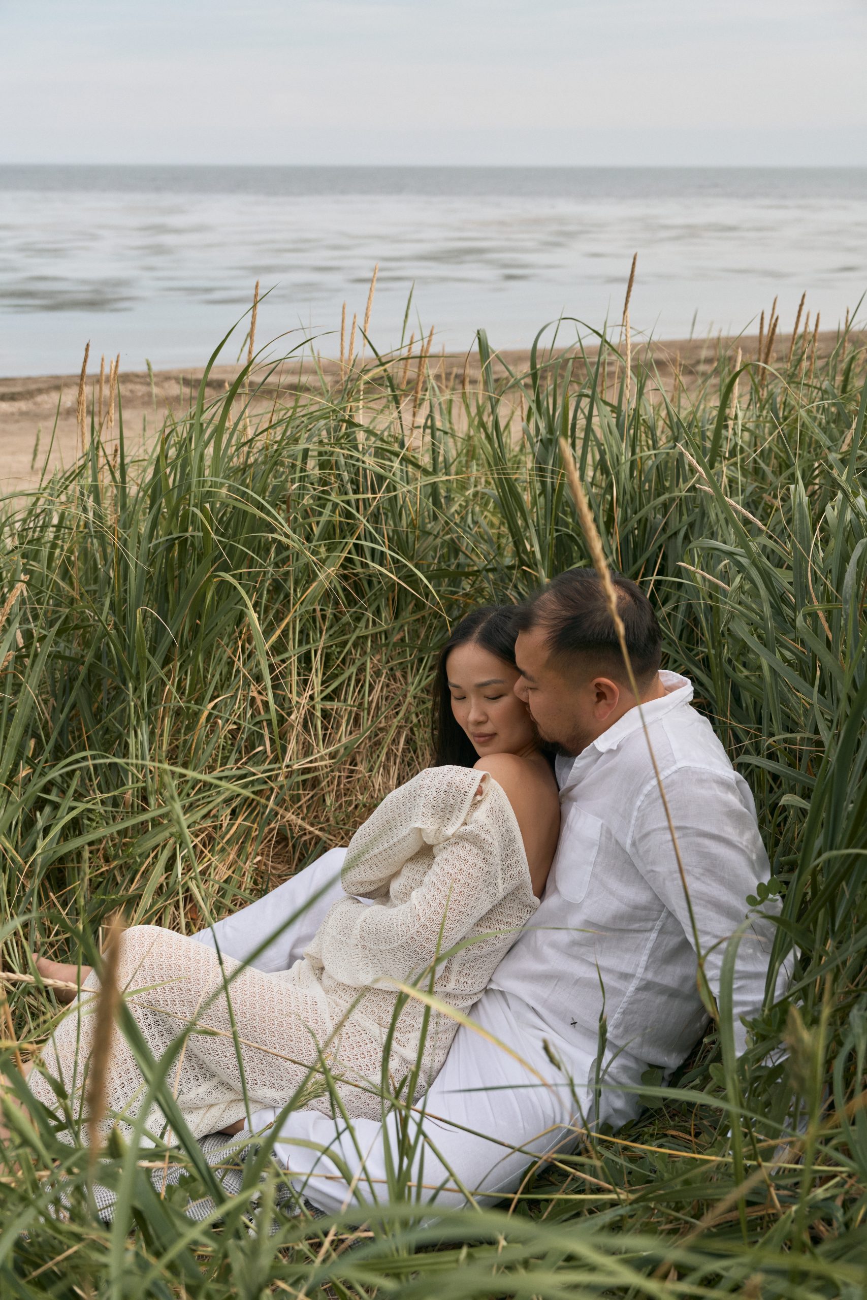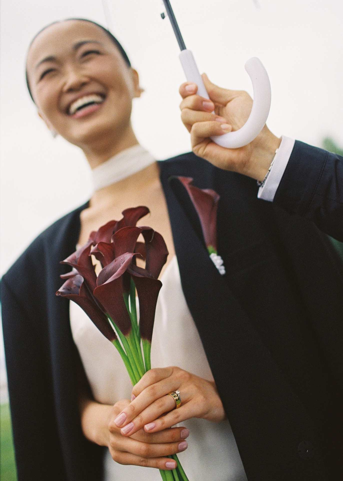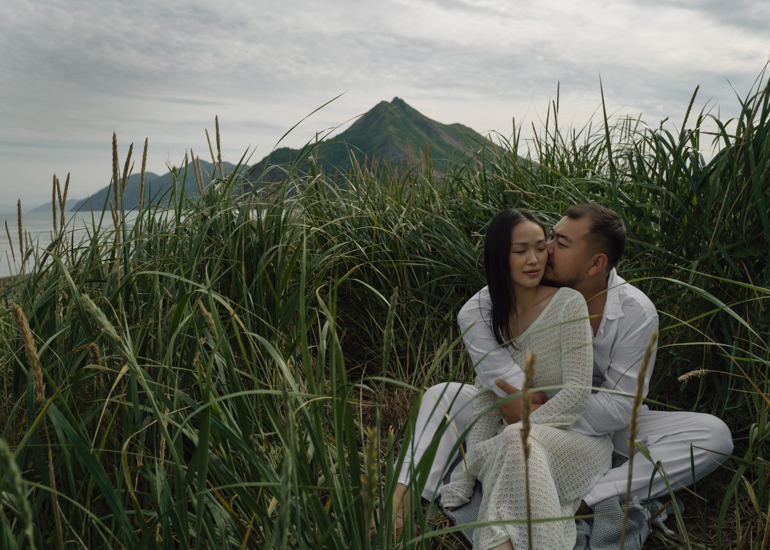 Мы начали съёмку за несколько дней до свадьбы в потрясающем месте — отдалённой бухте на острове. Там мы лазали по камням, наблюдали за чайками и ели любимую местными закуску на выезде — онигири. А позже я узнала, что в той бухте водятся медведи. Упс :)