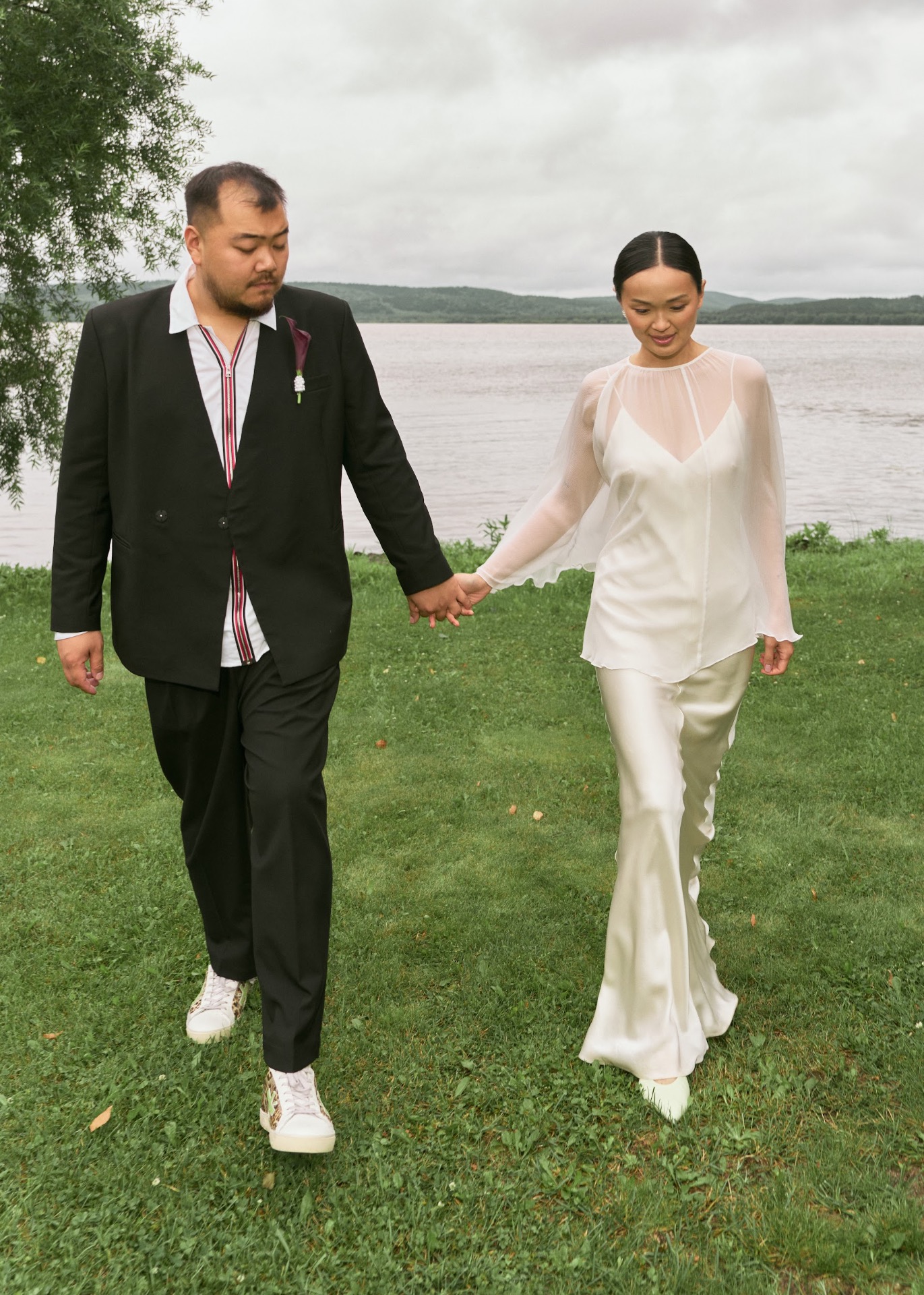 Образ жениха стал полной противоположностью: для Геры мы выбрали широкие брюки, оверсайз-рубашку и пиджак на запах, без лацканов с необработанным краем. Завершали образ кеды с леопардовыми вставками.
