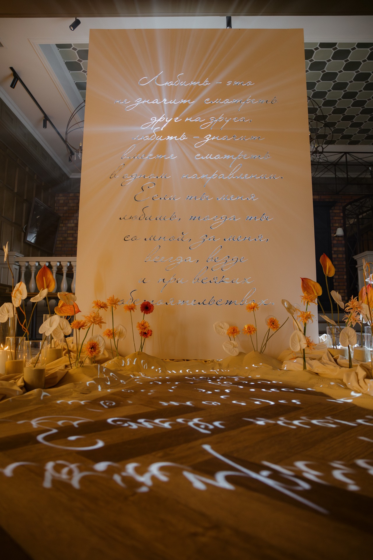 Декор мы сначала планировали сделать в белых оттенках, хотелось просто классики. Но после встречи с декоратором мы поменяли всю концепцию, доверились им, решив добавить оранжевые цвета. Оранжевый цвет был включен и в букет невесты, это было потрясающе.