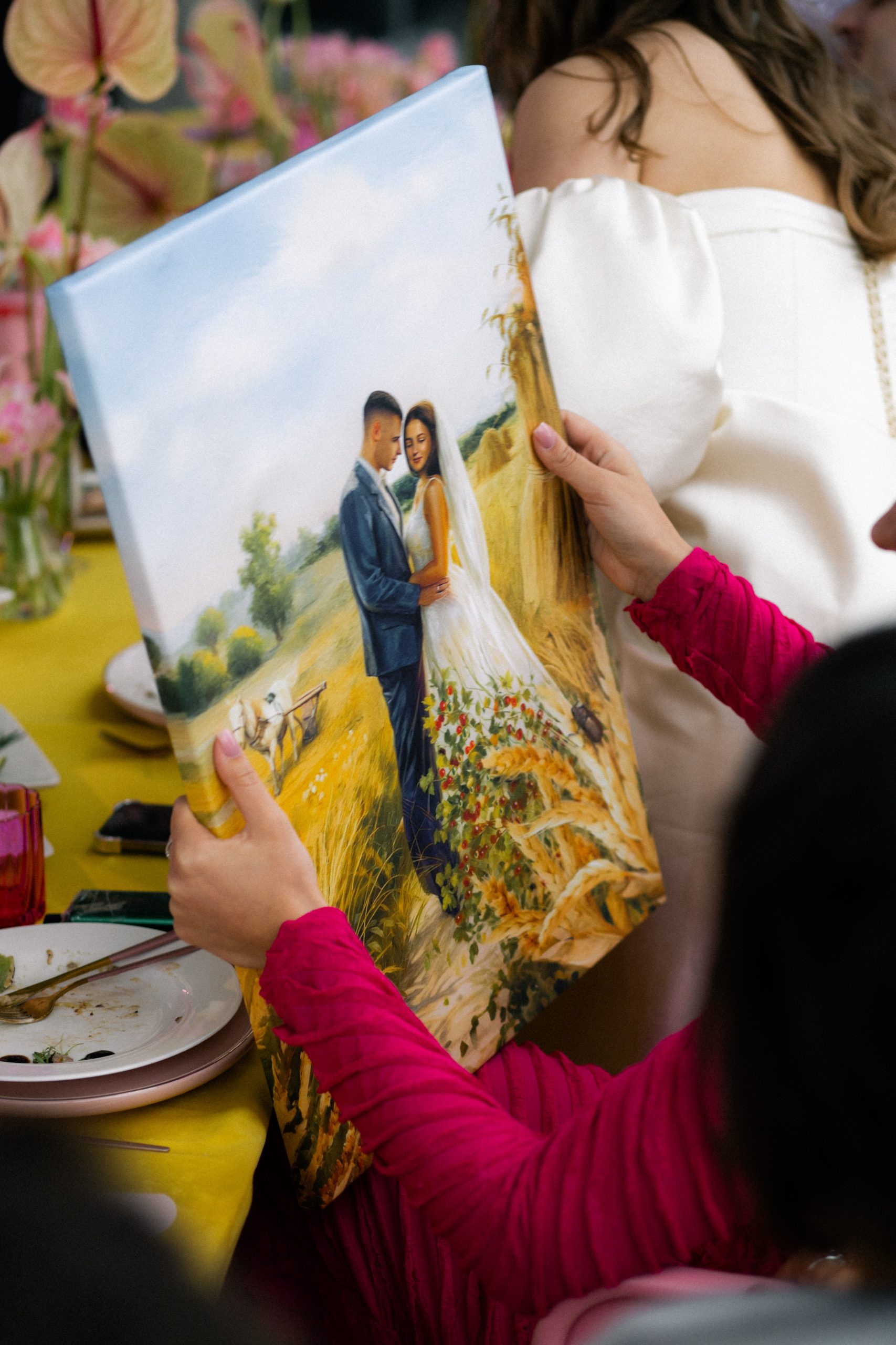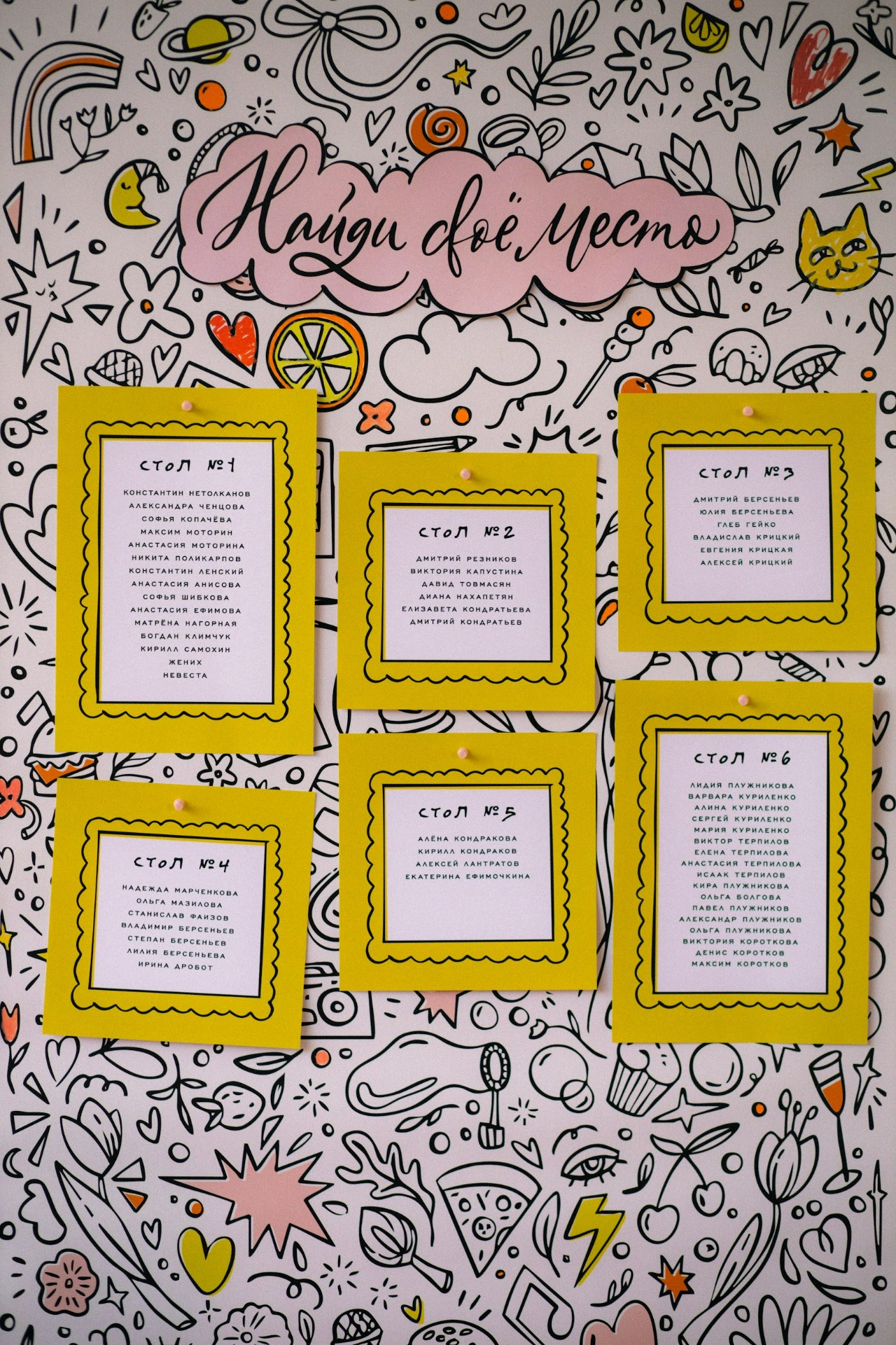 Мы чередовали лёгкие активности с тёплыми поздравлениями и личным общением за бокальчиком коктейля. У нас был и необычный план рассадки: в виде раскраски, на которой были изображения, символизирующие нас как пару.