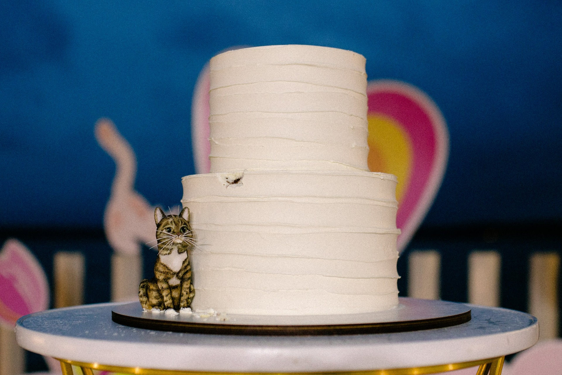 Конечно, у нас было много классных и забавных фишек, перекликающихся с нашей концепцией! Красной нитью через всю свадьбу проходила кошачья тема, ведь мы безумно любим кошек. Карточки рассадки были в форме кошачьей лапки, в зоне церемонии стояли милые котики, а в качестве подарков гостям я сделала свечи в виде лапок. И, конечно же, наш потрясающий торт — на нём была точная копия нашей Муси! Кондитер так точно изобразил нашу любимицу, что моя мама ещё три недели держала фигурку Муси в холодильнике. Было и съесть жалко, и выбросить невозможно.