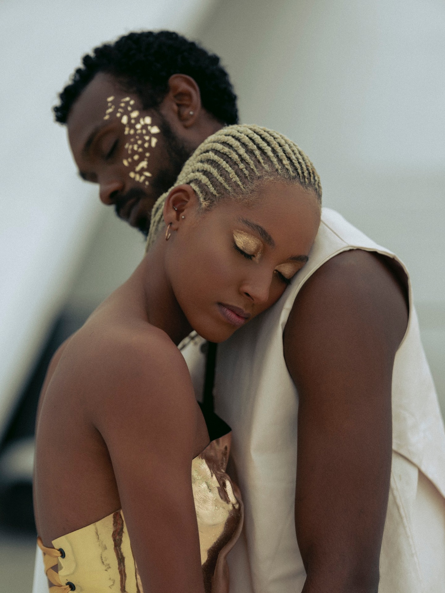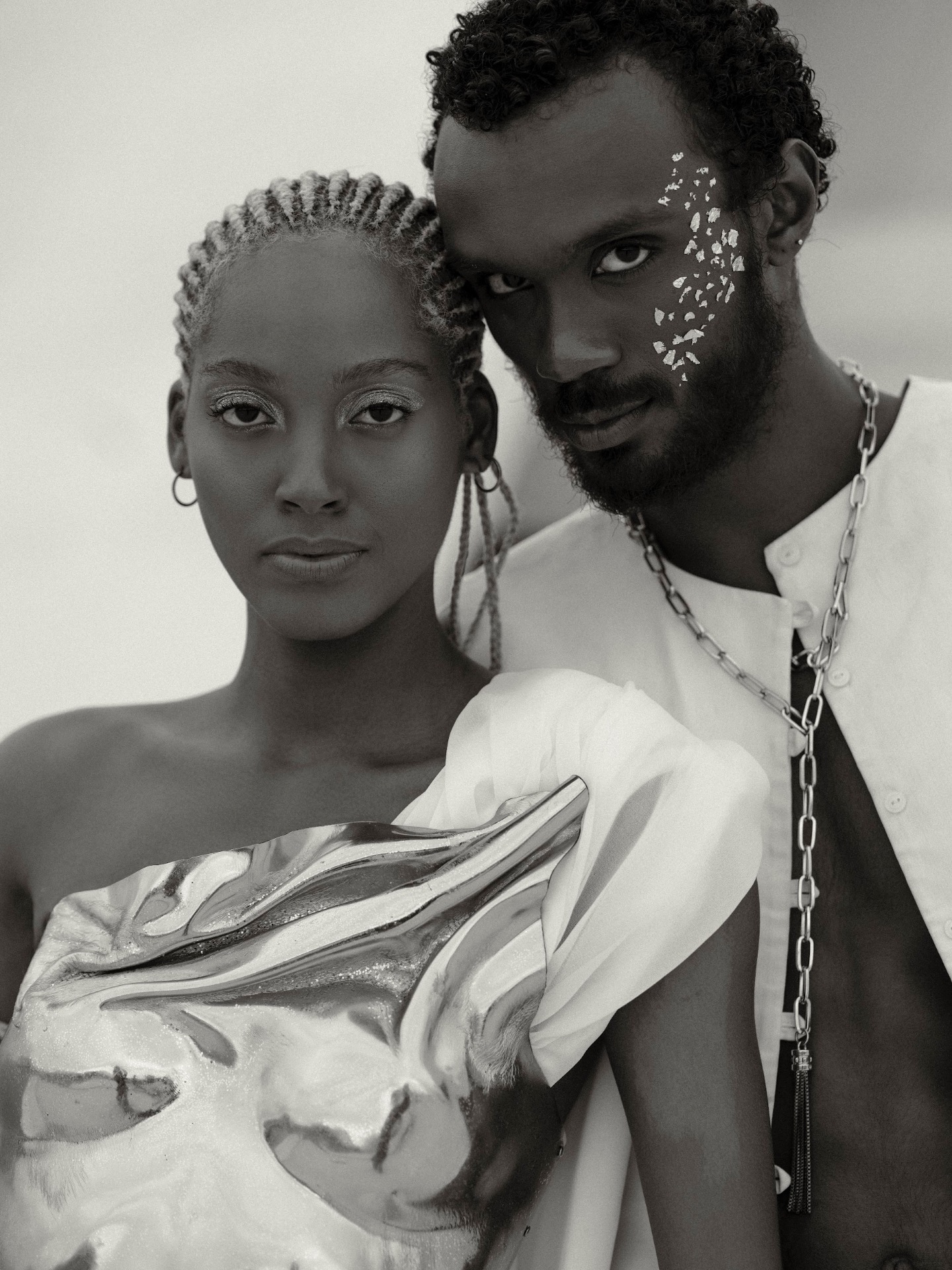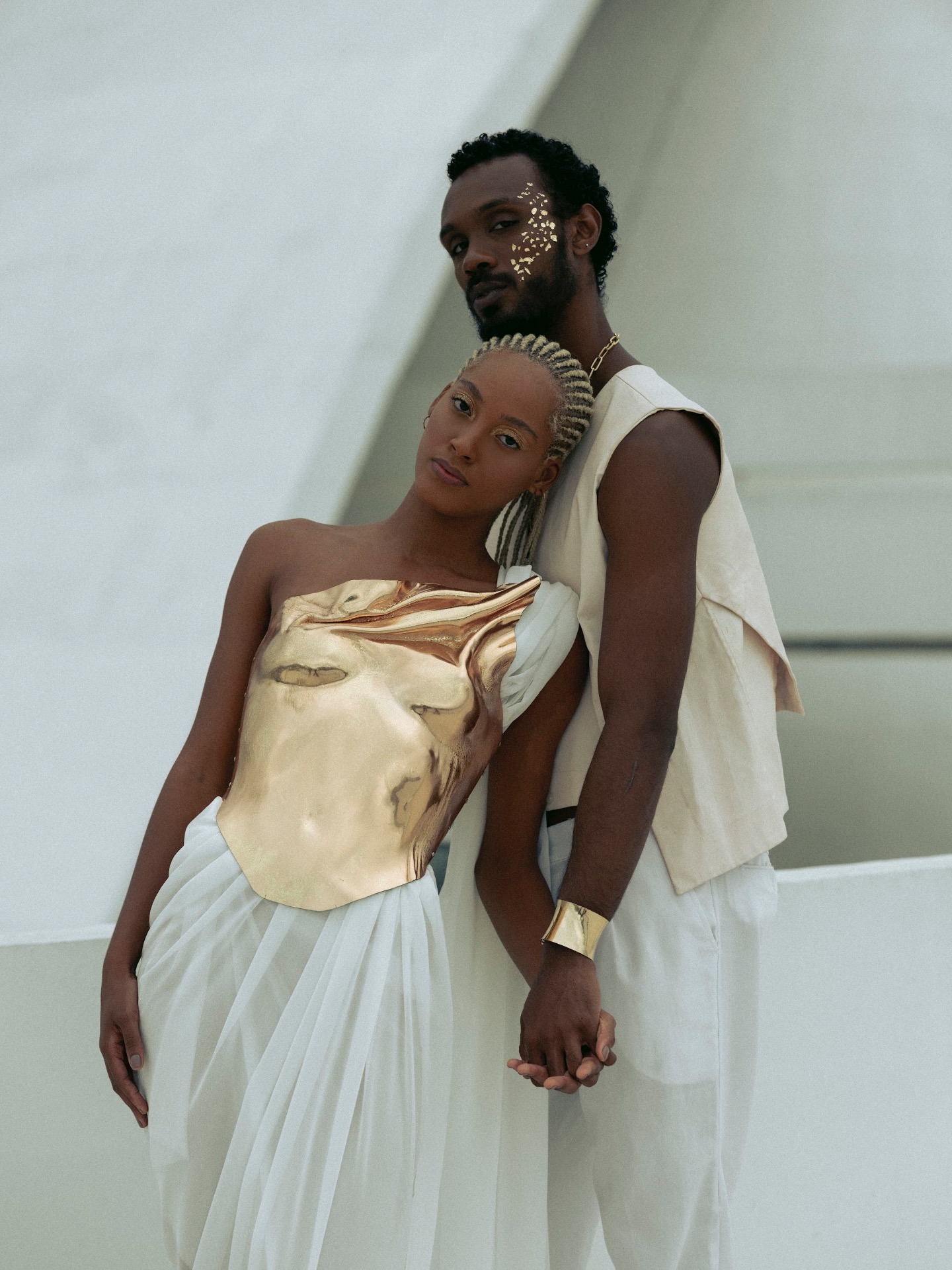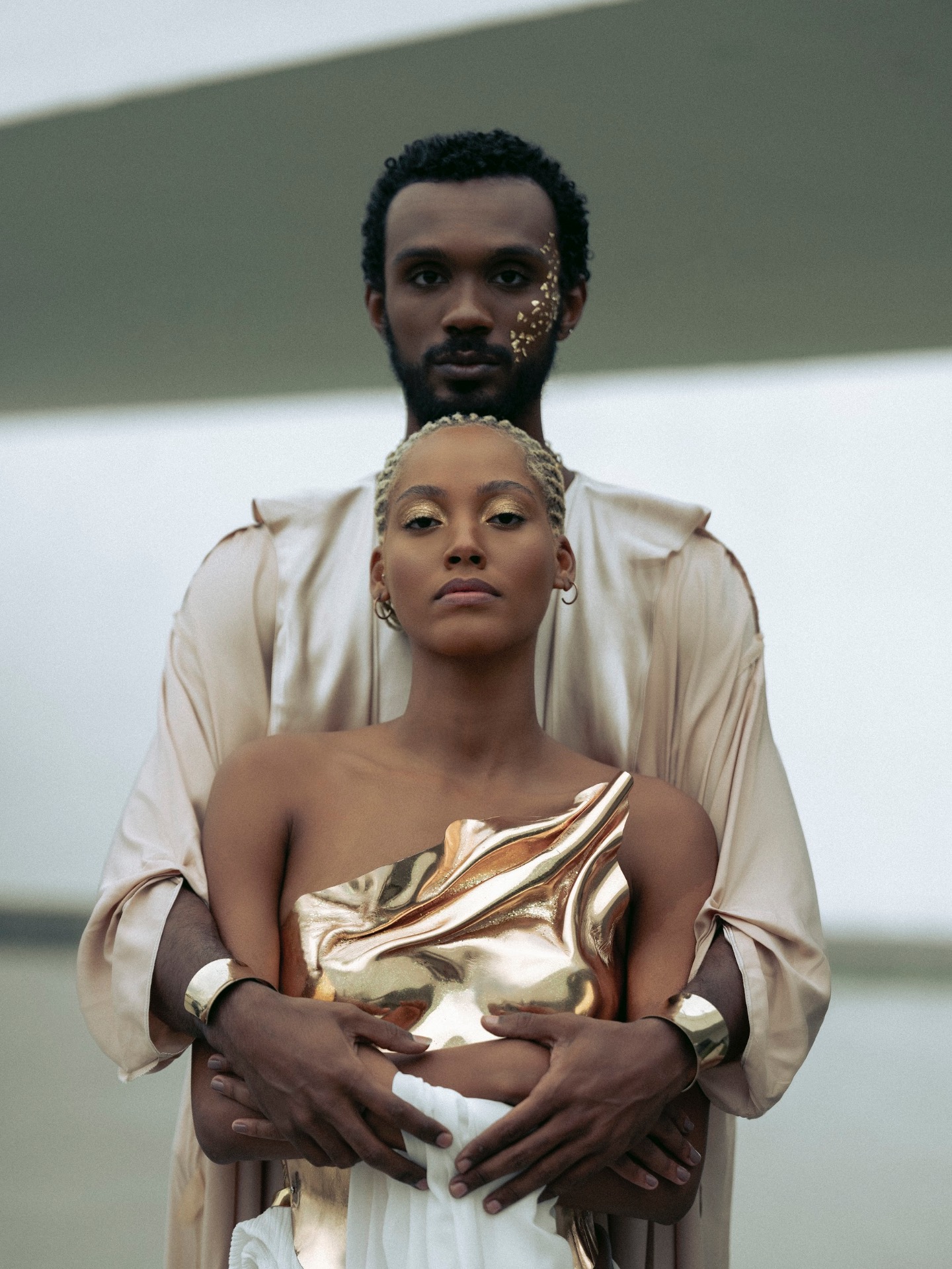 В нашей истории метаморфоза человека в необъятном космосе раскрывается через цвета одежды. Чёрный цвет символизирует одиночество и изоляцию, а микс белого и золотого — объединение двух сердец. Также белый цвет отсылает к свадебным традициям. Само чувство любви мы выразили через цвет золота. Он появляется у пары только после поцелуя. Словно магический свет, золотое сияние сплетает руки влюблённых и озаряет их тела и лица, наполняя теплом и жизненной силой.