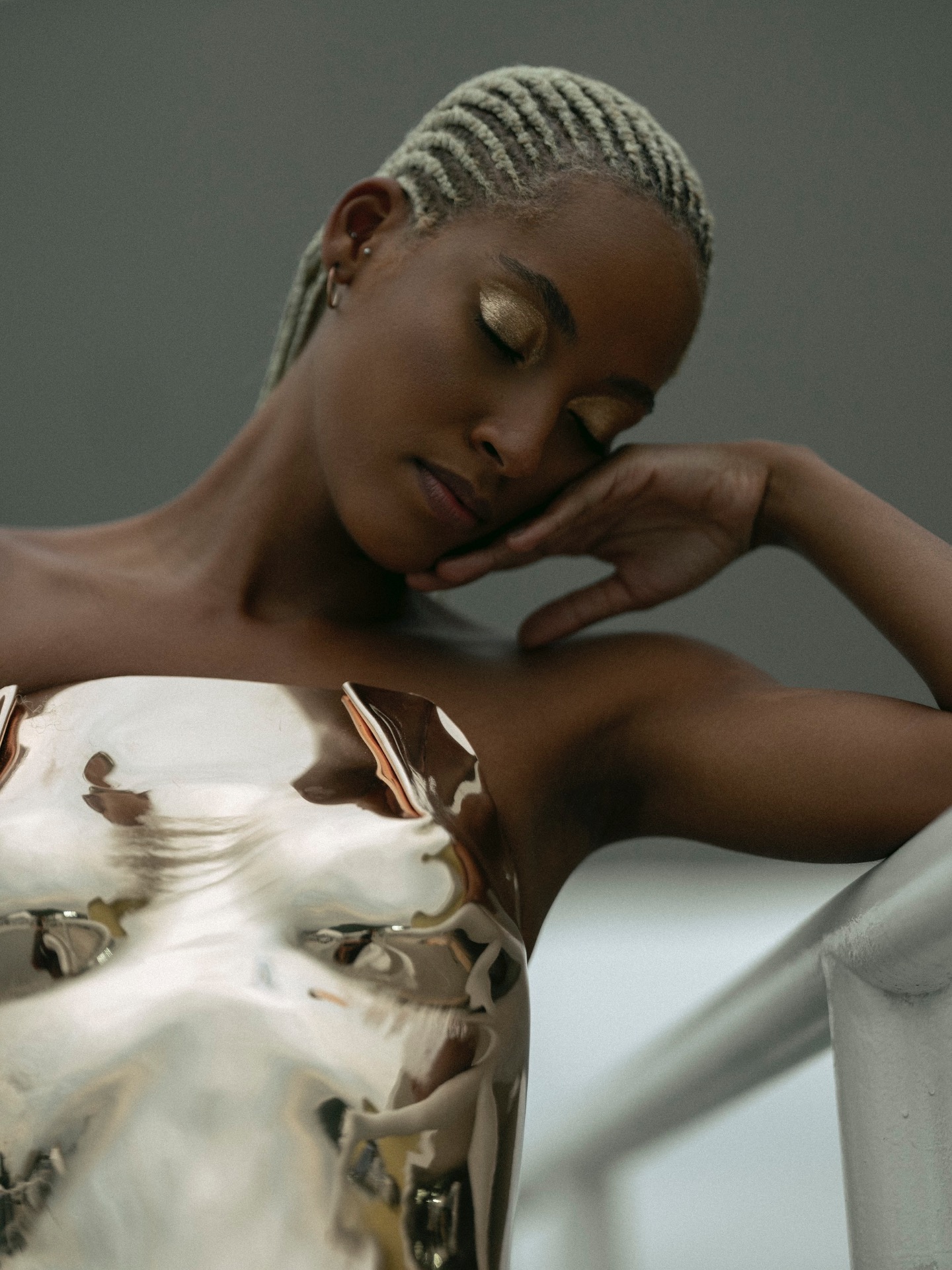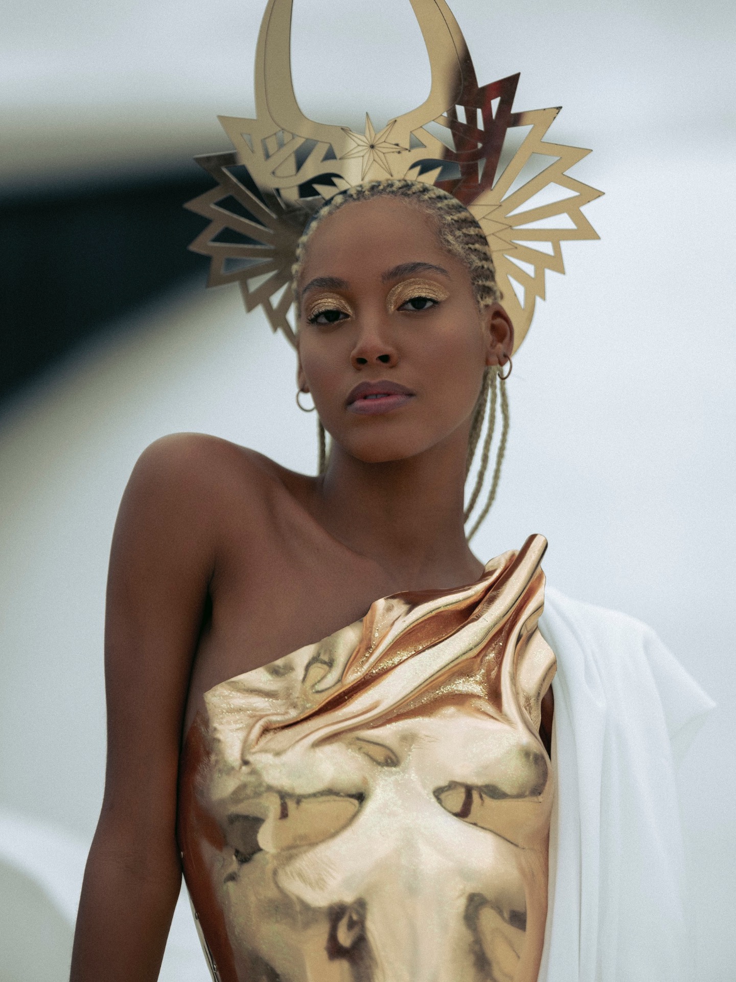 Ткань, которую мы драпировали прямо на месте, и корона были созданы талантливым дизайнером Polina Xasina. Эти детали придали образу особую изысканность и оригинальность.