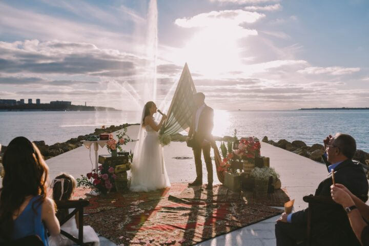Церемония была на залитом солнцем пирсе. Мы поставили немного стульев и расстелили коврики на ступеньках. Ведущий просил принести кольца, позвонив в ретро-телефон, а помогал ему в этом маленький «Wedding boy». Неожиданно и киношно получилось то, что незнакомые люди на набережной собрались на балконе чуть выше и наблюдали за церемонией. А в перерыве между церемонией и ужином гости могли написать друг другу письма, как это делали Сэм и Сьюзи в «Королевстве полной луны». И приложить к ним симметричные кадры в стиле Андерсона, сделанные на полароид.