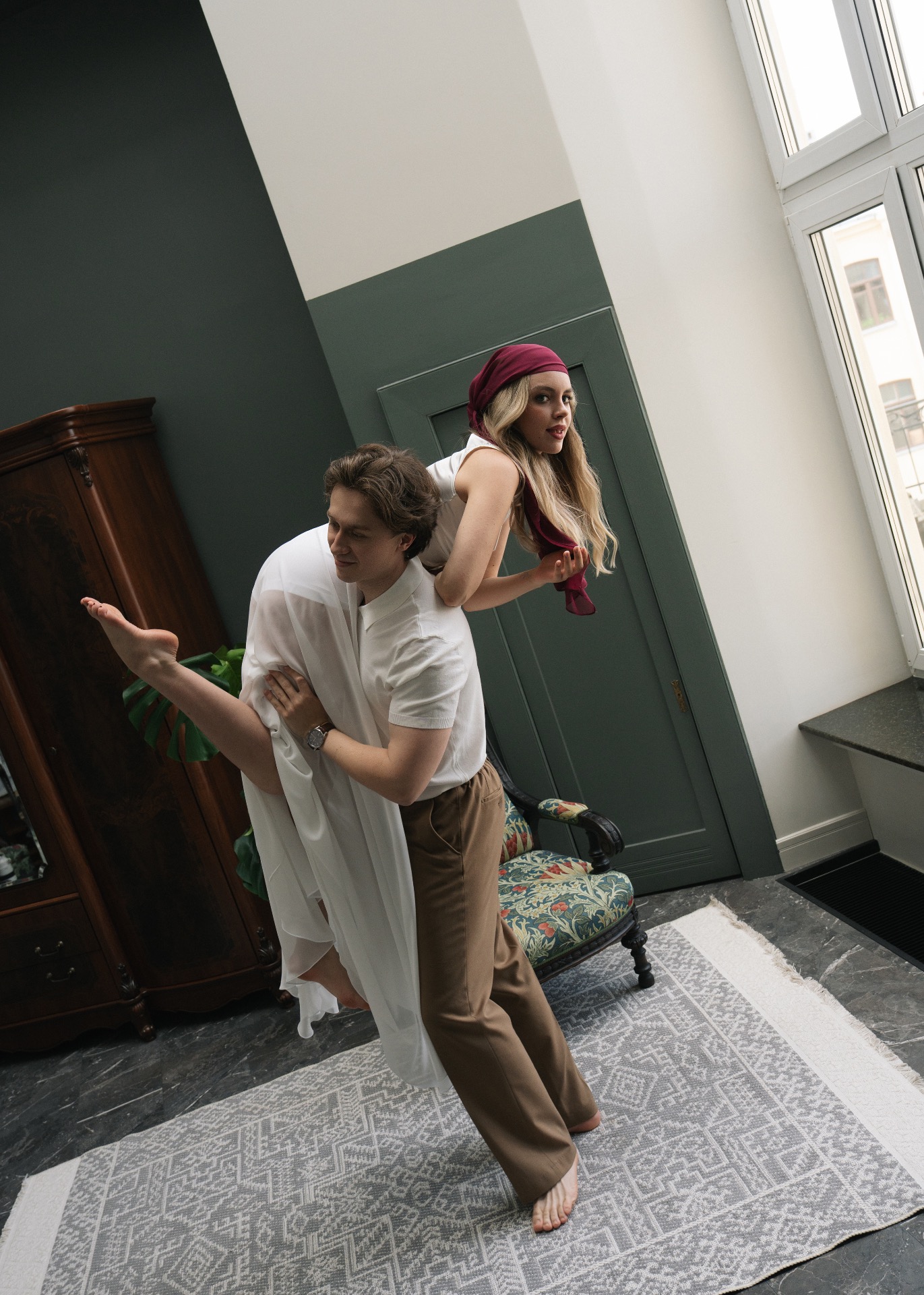 Егор перевёз меня в Петербург в период написания моего диплома. И спустя 1,5 года наших отношений он сделал мне предложение. Егор организовал фотосессию на улице, которую я долго у него выпрашивала. Под конец съёмки возле Исаакиевского собора фотограф сказала мне замереть, чтобы сделать пару портретных фото, потому что на лицо красиво падало солнце. А потом она сказала: «Всё, можешь поворачиваться», — и я увидела Егора, стоящего на одном колене с кольцом.