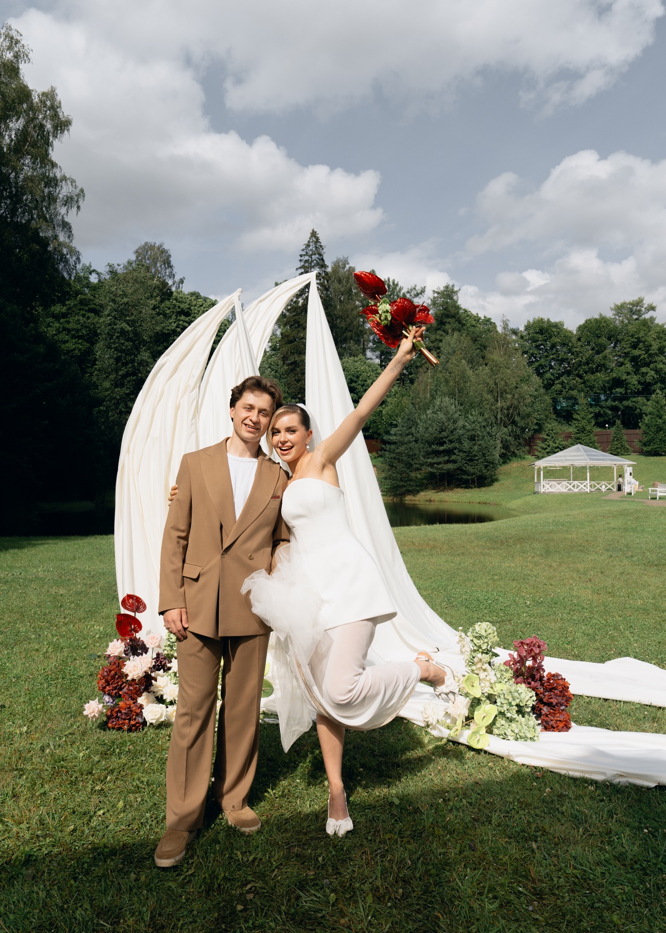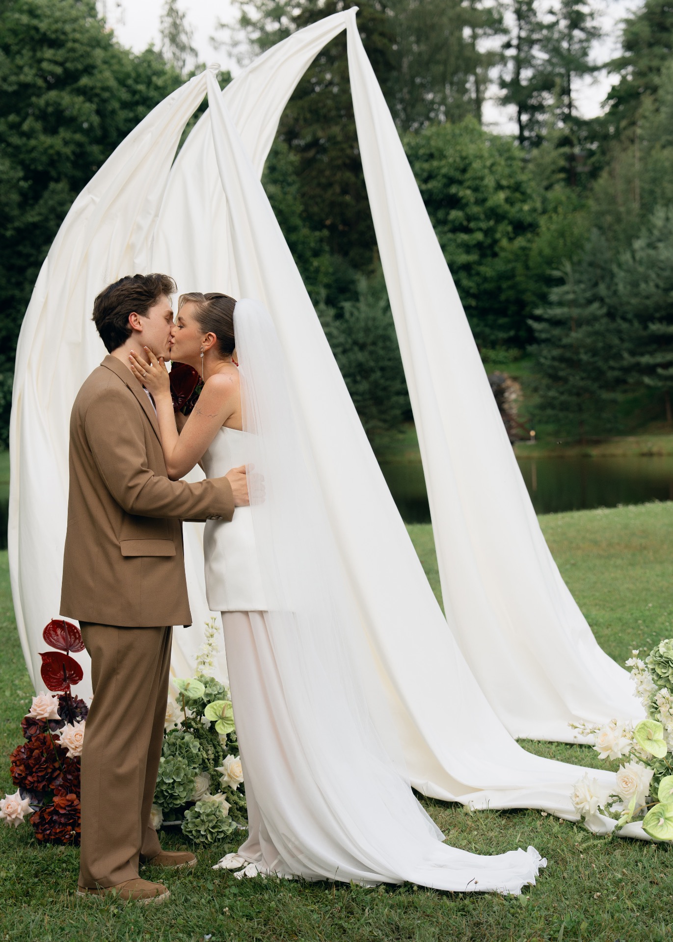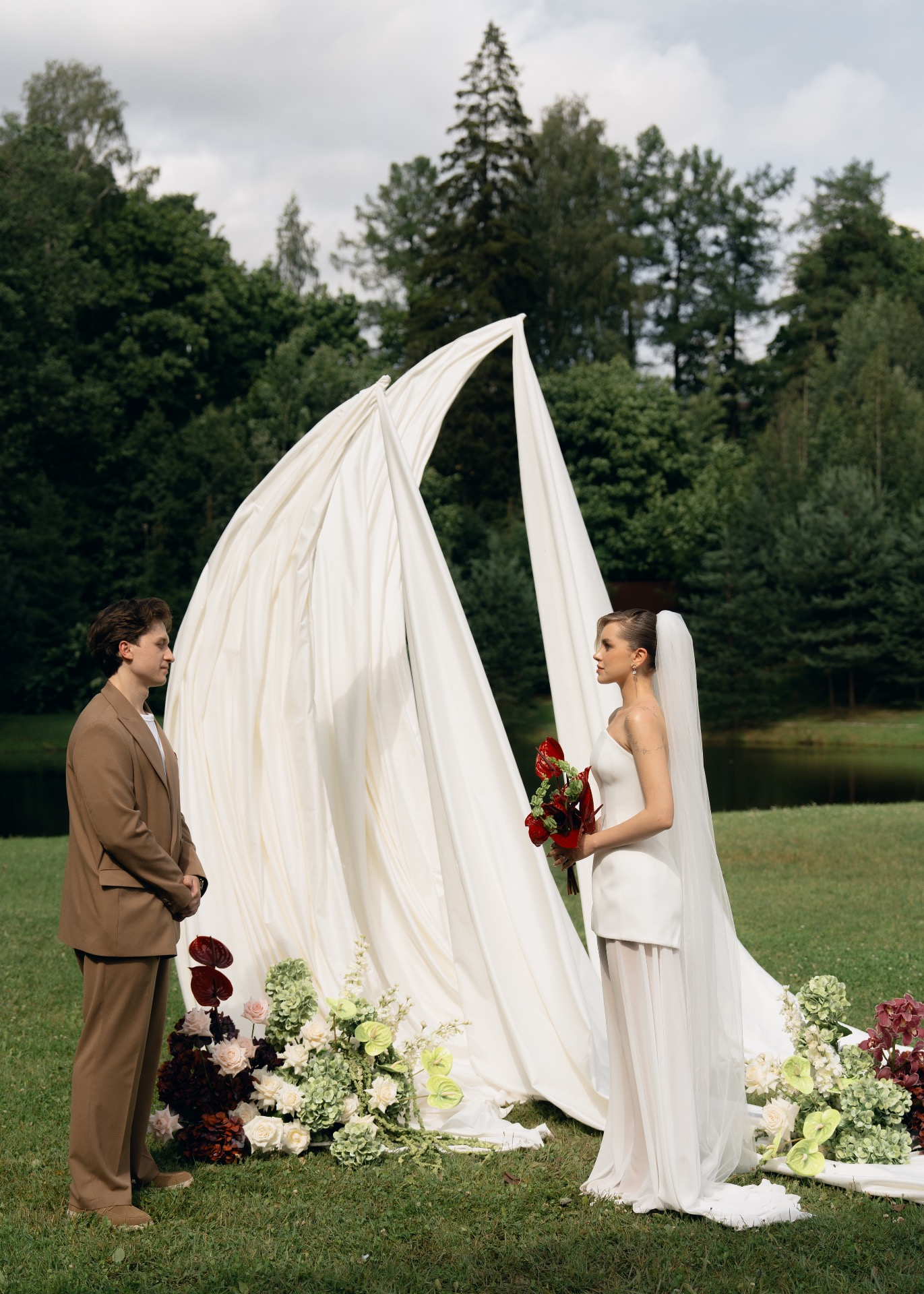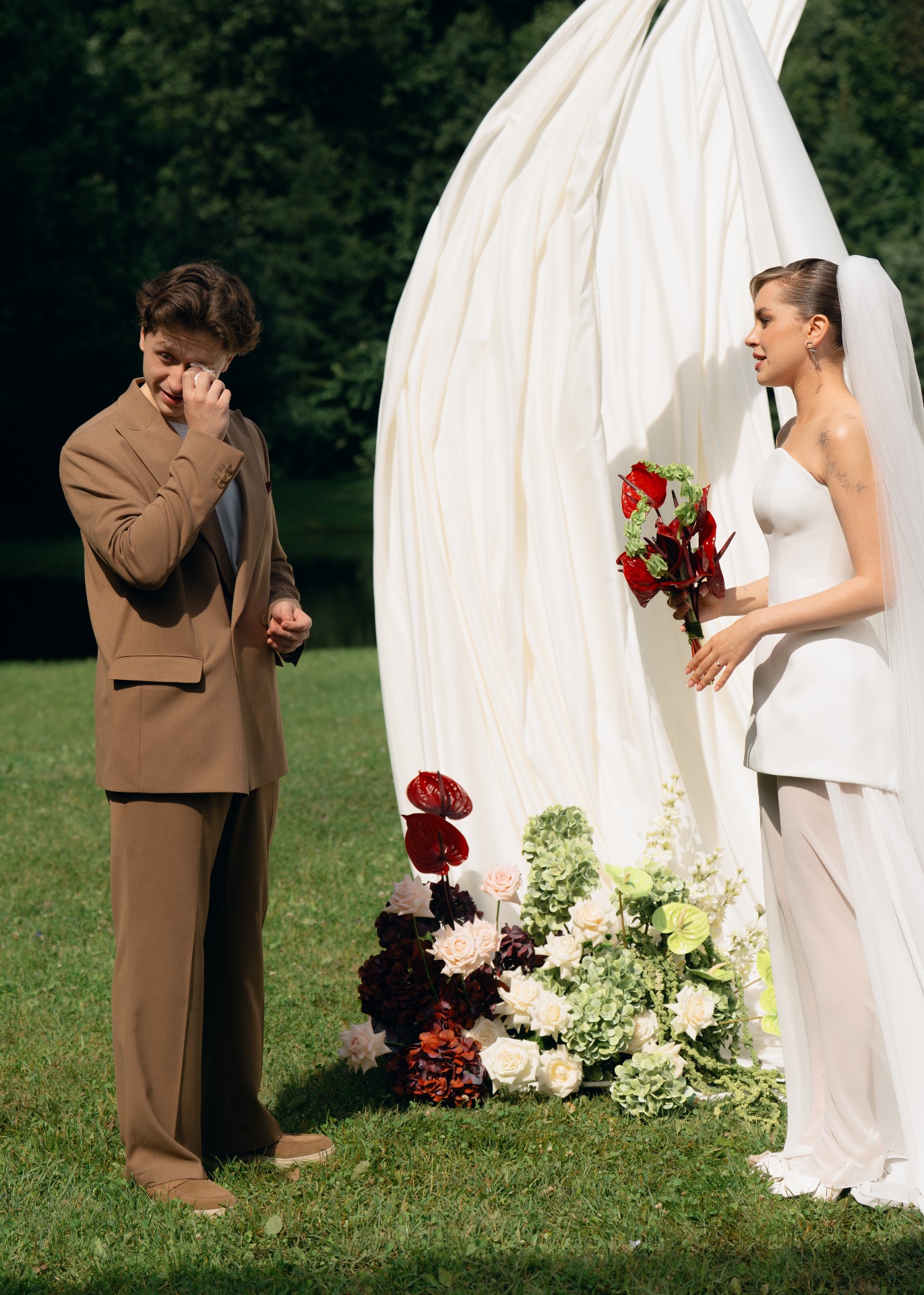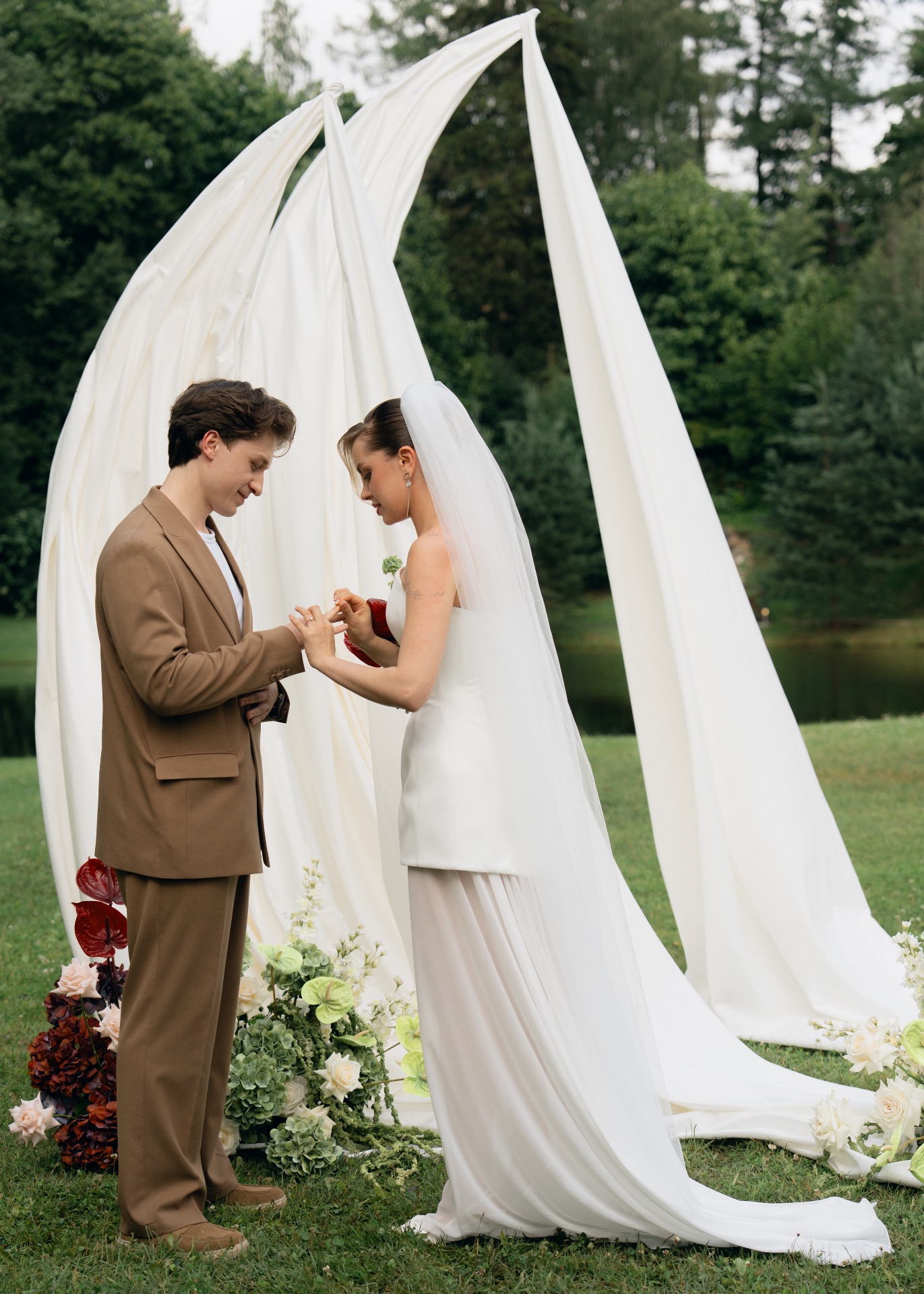 Мы изначально оба придерживались мнения, что нам важна лаконичность в деталях и образах. Я сразу понимала, что моё платье не будет пышным, а также на нём не будет страз и перьев. Егор же рассчитывал на комфортный костюм без жилета.