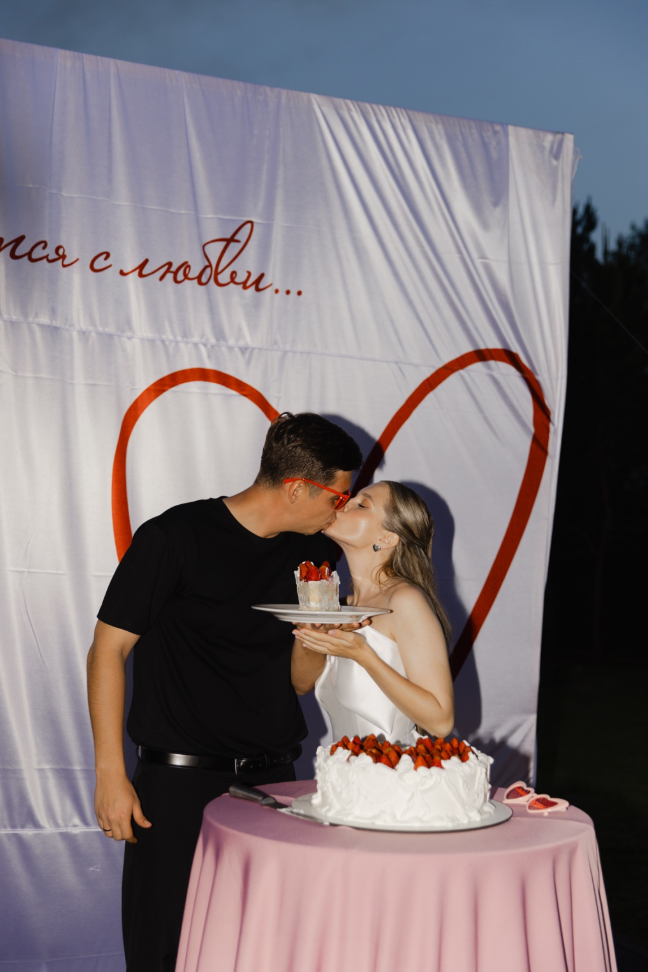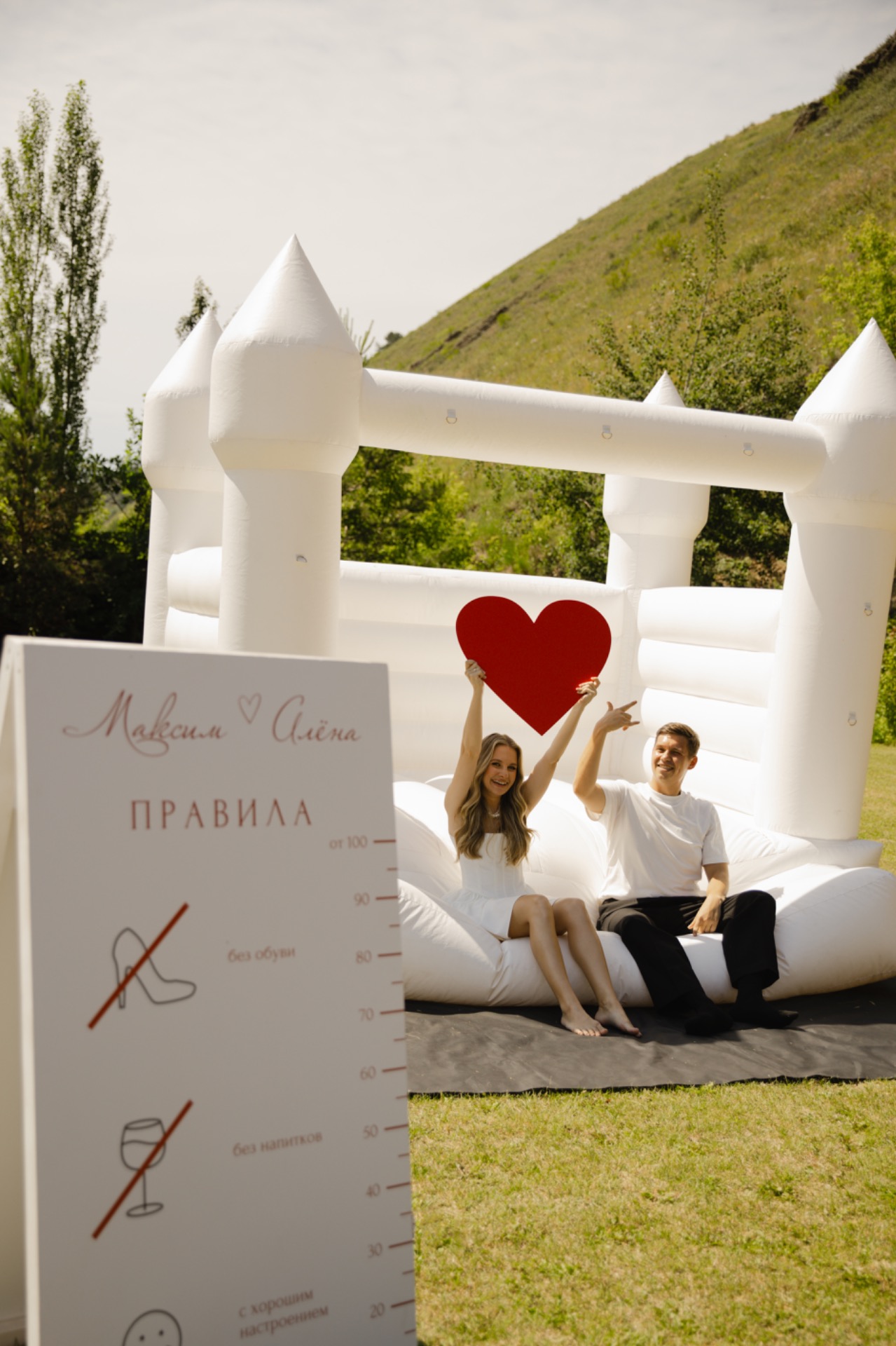 Жених, Максим, активно участвовал в подготовке. Именно он предложил основную концепцию свадьбы: показать этапы взросления. Welcome-зона — детство, церемония — юность, банкет — зрелость. Так на welcome появился батут в виде белого замка, детские фотографии нас и гостей, очки и леденцы в форме сердечек.