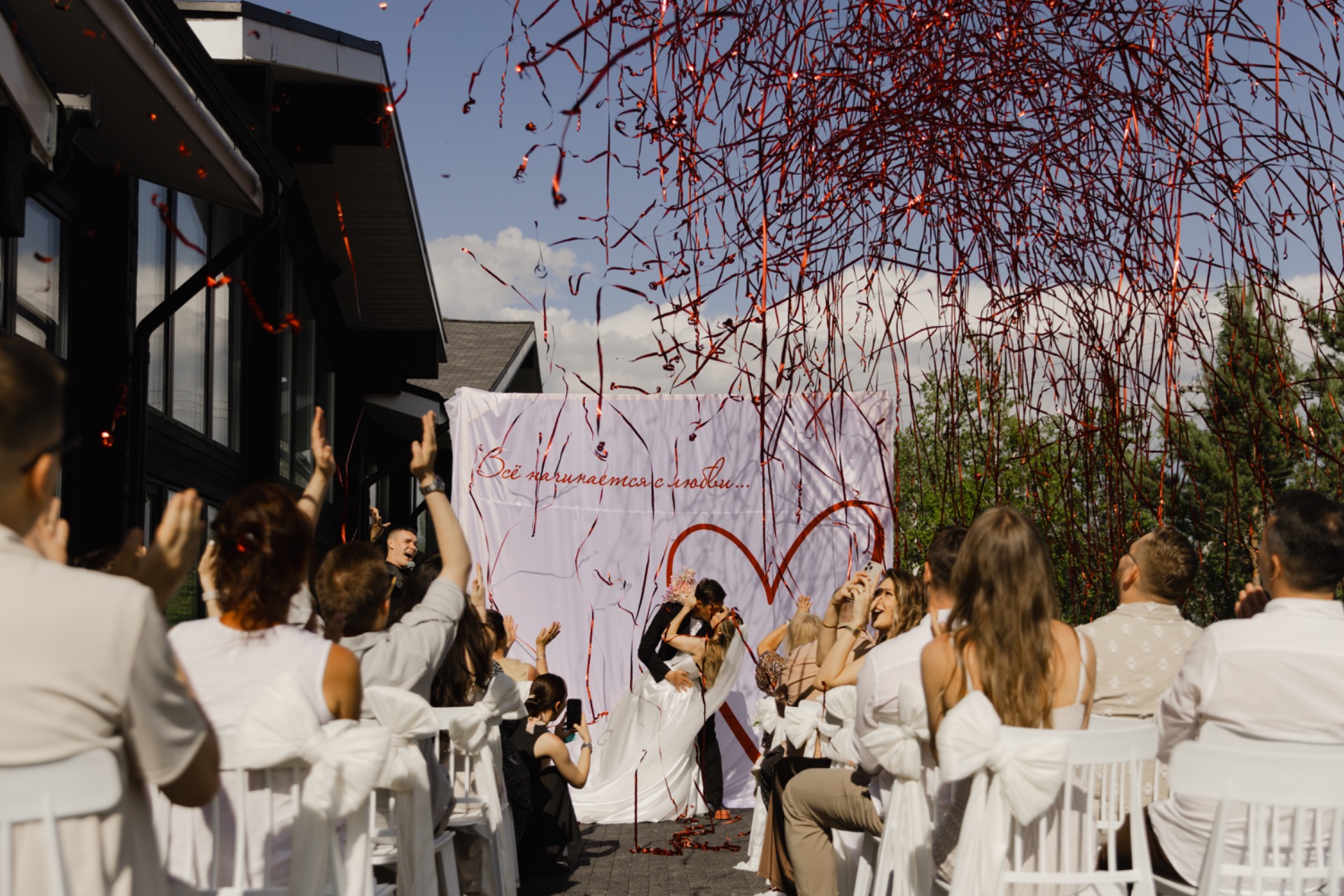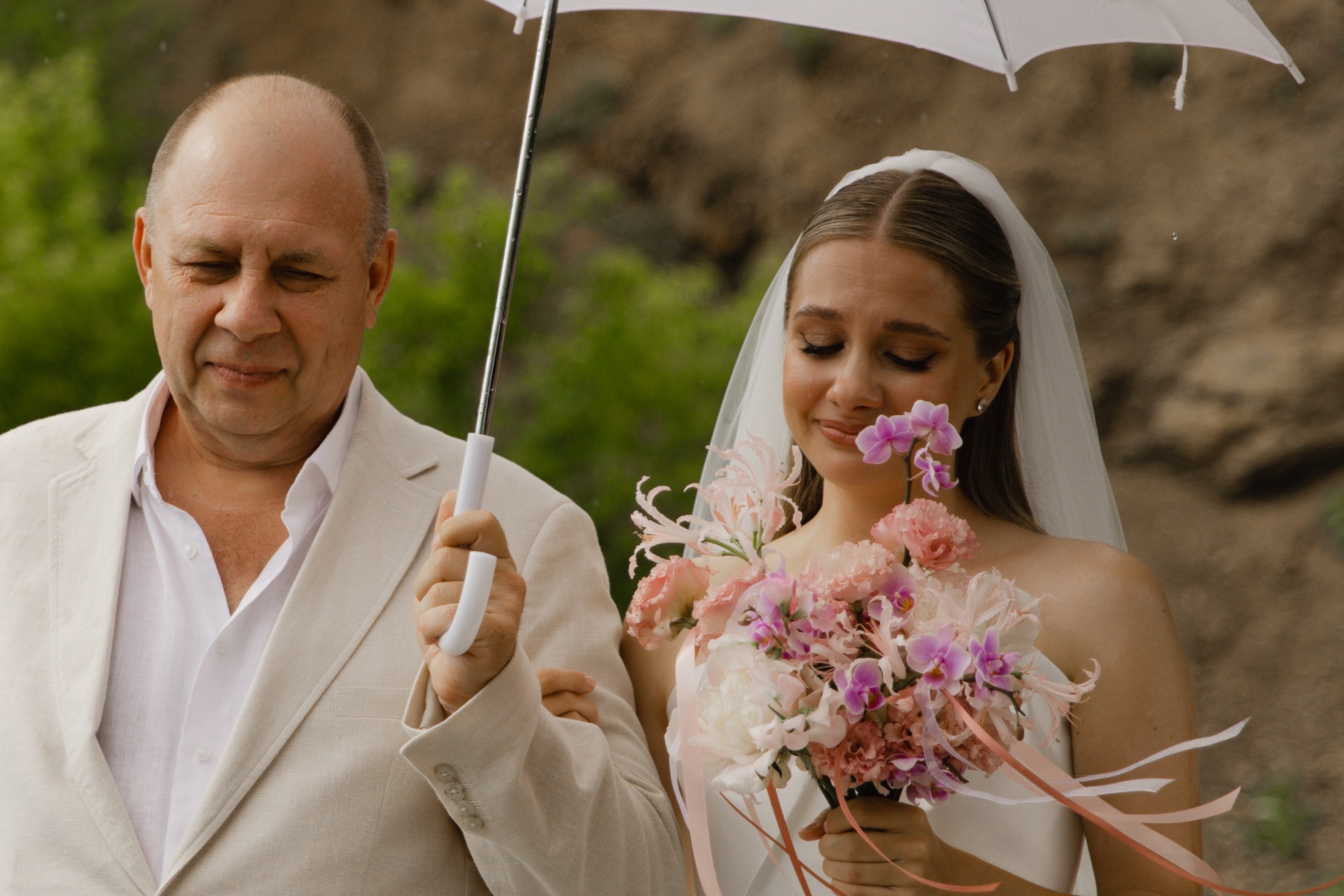 Но, спасибо нашим организаторам и всей команде, они буквально спасли ситуацию. Как только стихия немного отступила, ребята восстановили зону церемонии своими силами. Жених вышел под лёгкий дождь, гостям мы раздали зонты. А когда папа вёл меня к алтарю, дождь прекратился. Всё случилось, как в сказке. Любовь победила любые преграды.