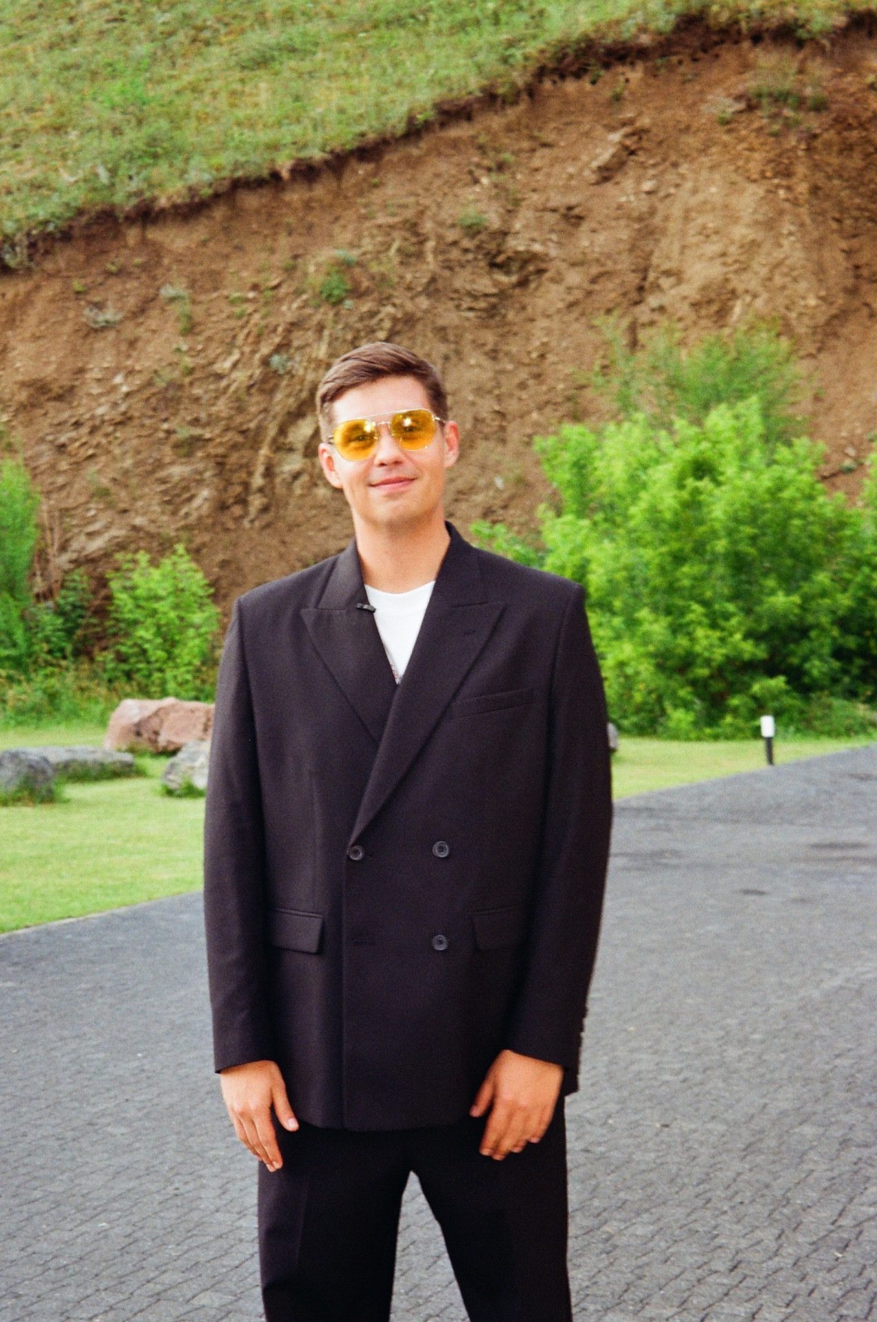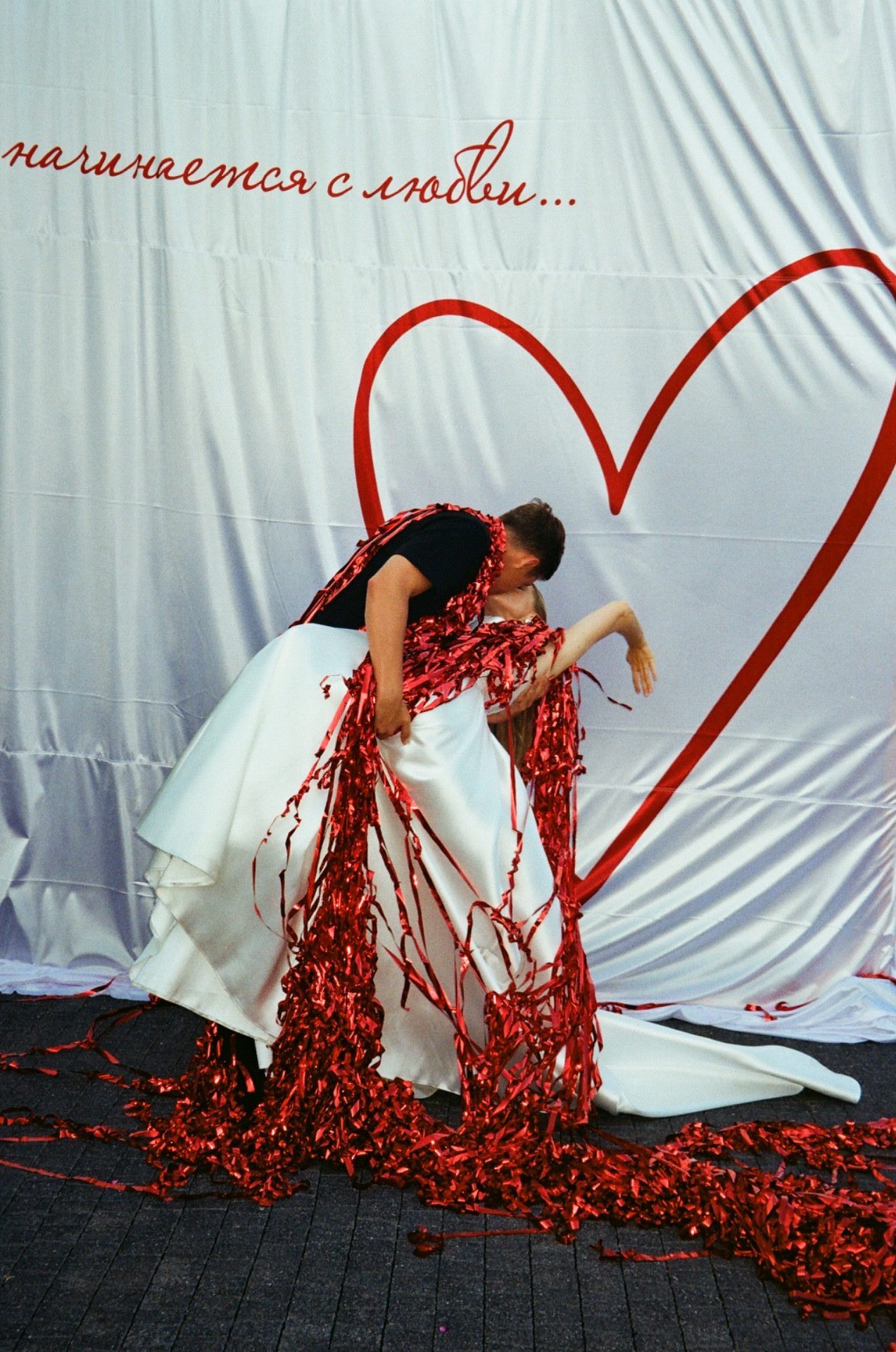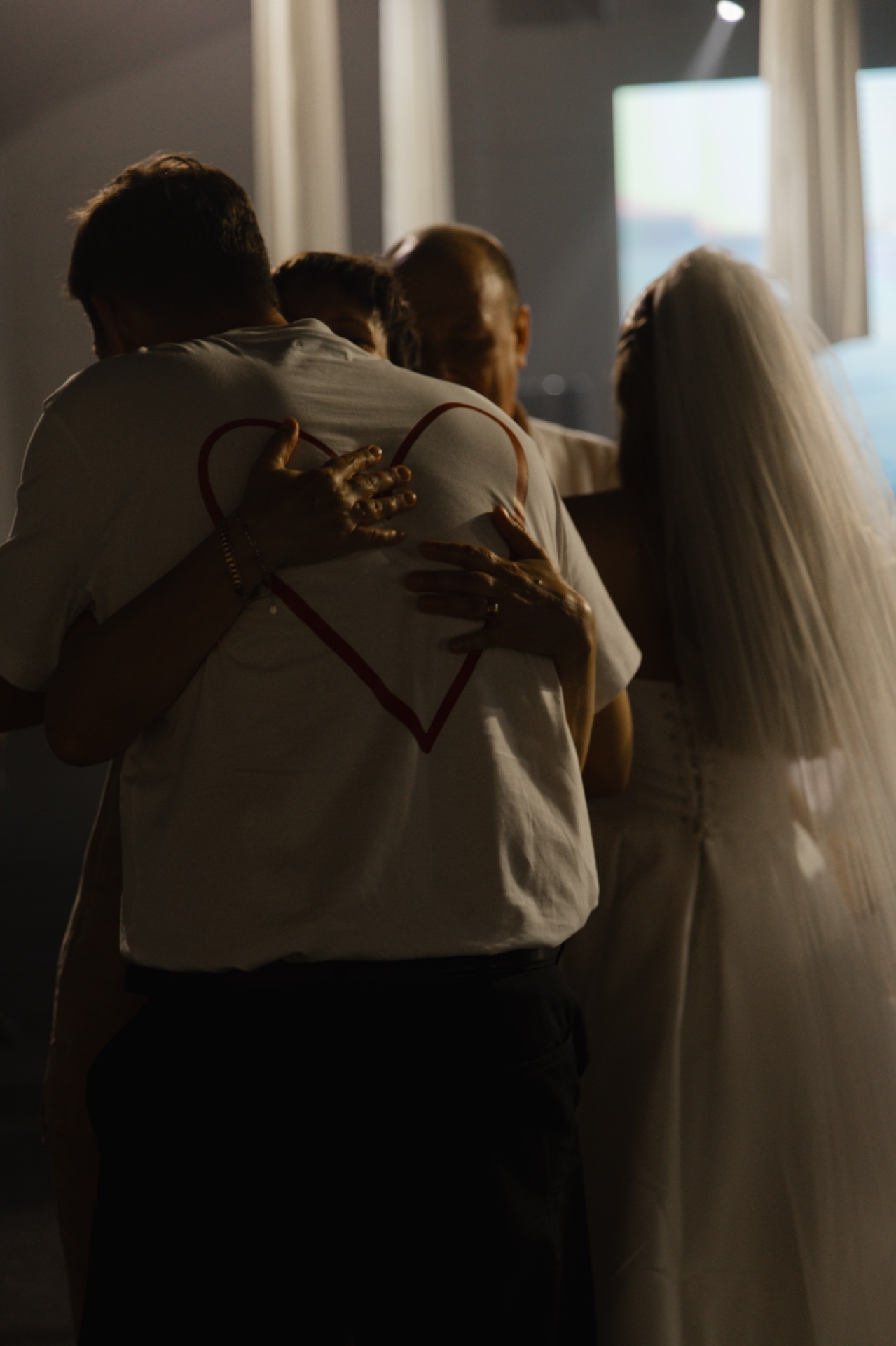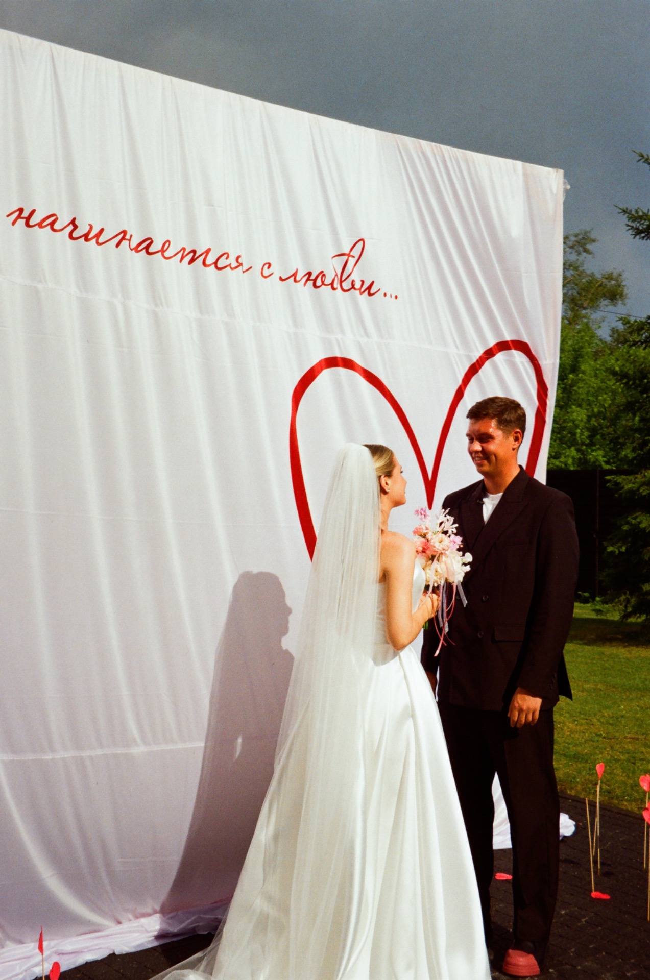 Образ жениха состоял из чёрного оверсайз-костюма. К нему мы подобрали необычные ботинки Camper с цветными съёмными носочками, они вызвали полный восторг у гостей и команды, все спрашивали, где купить такие же. Максим отказался от классической рубашки в пользу футболок, и мы решили «освежать» образ их сменой в течение дня. Выбрали базовые — молочную и чёрную, а в качестве фишки сделали на одной из них печать: фирменное сердце и надпись «Всё начинается с любви». Эти же слова были вышиты на нашей арке. Так у нас появился настоящий свадебный мерч.