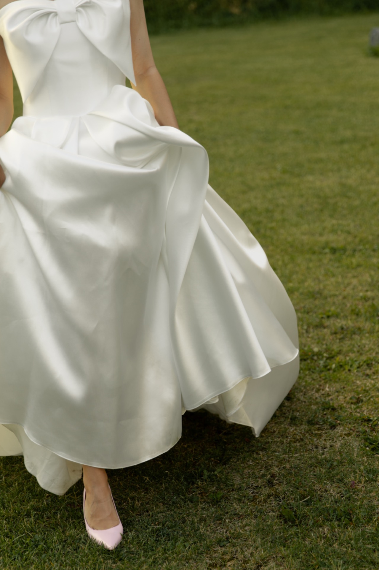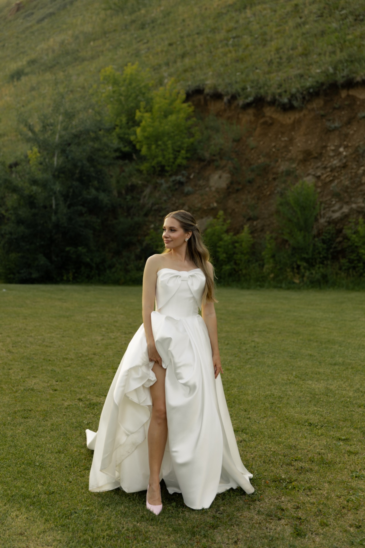 Образов у нас было несколько. Изначально я хотела только мини, но всё изменилось, когда я увидела шикарное платье с бантом на корсете и пышной юбкой. Моё сердечко затрепетало! По счастливой случайности это платье дождалось моего приезда, и, примерив его в салоне, я влюбилась окончательно. К платью я выбрала нежно-розовые лодочки на шпильке, серьги в виде сердечек и, конечно, длинную фату.