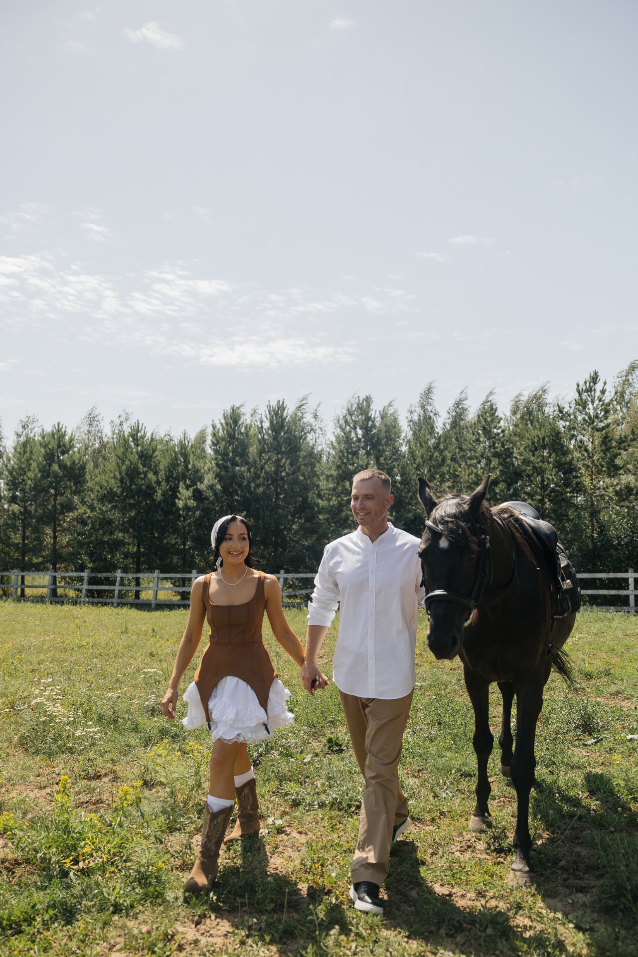 Утром у нас была фотосессия с конём по имени Павлин. Мы устроили пикник, кормили его ромашками и много смеялись.