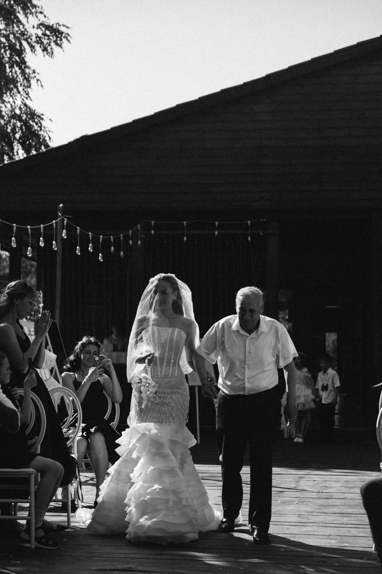 Я выходила под песню «Люблю» Марии Чайковской и Евгения Сои, держась за руку дедушки. Кольца выносили наши крестники: мальчик был в роли секретного агента с чемоданчиком, а девочка — в платье, похожем на моё.