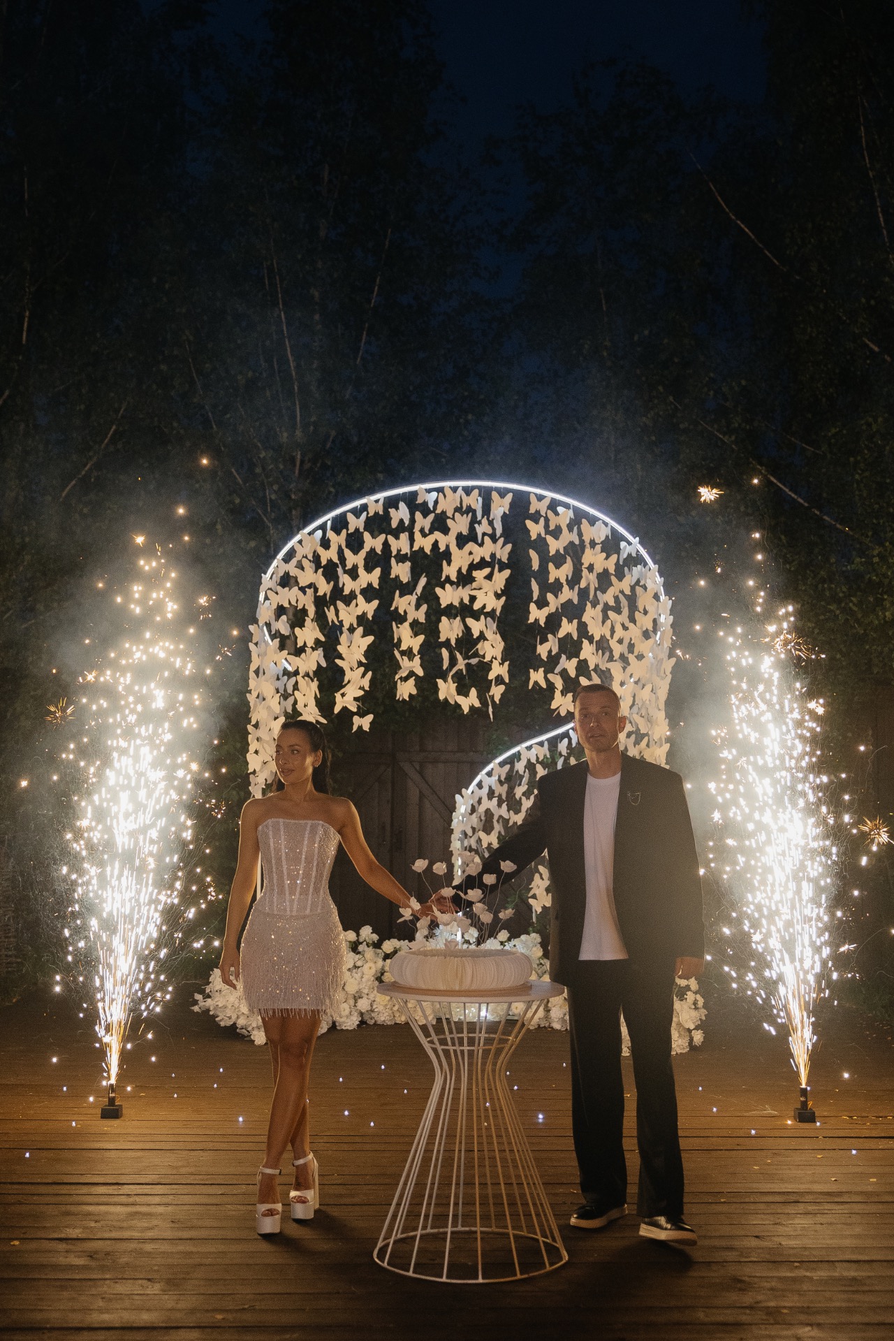 Торт вынесли вечером, когда на арке зажглись огни и фонарики. Холодные фонтаны, бенгальские огни, мягкий свет — всё вокруг будто ожило. Я посмотрела на Лёшу и прошептала: «Картинка из нашей головы ожила. Смотри, как красиво».