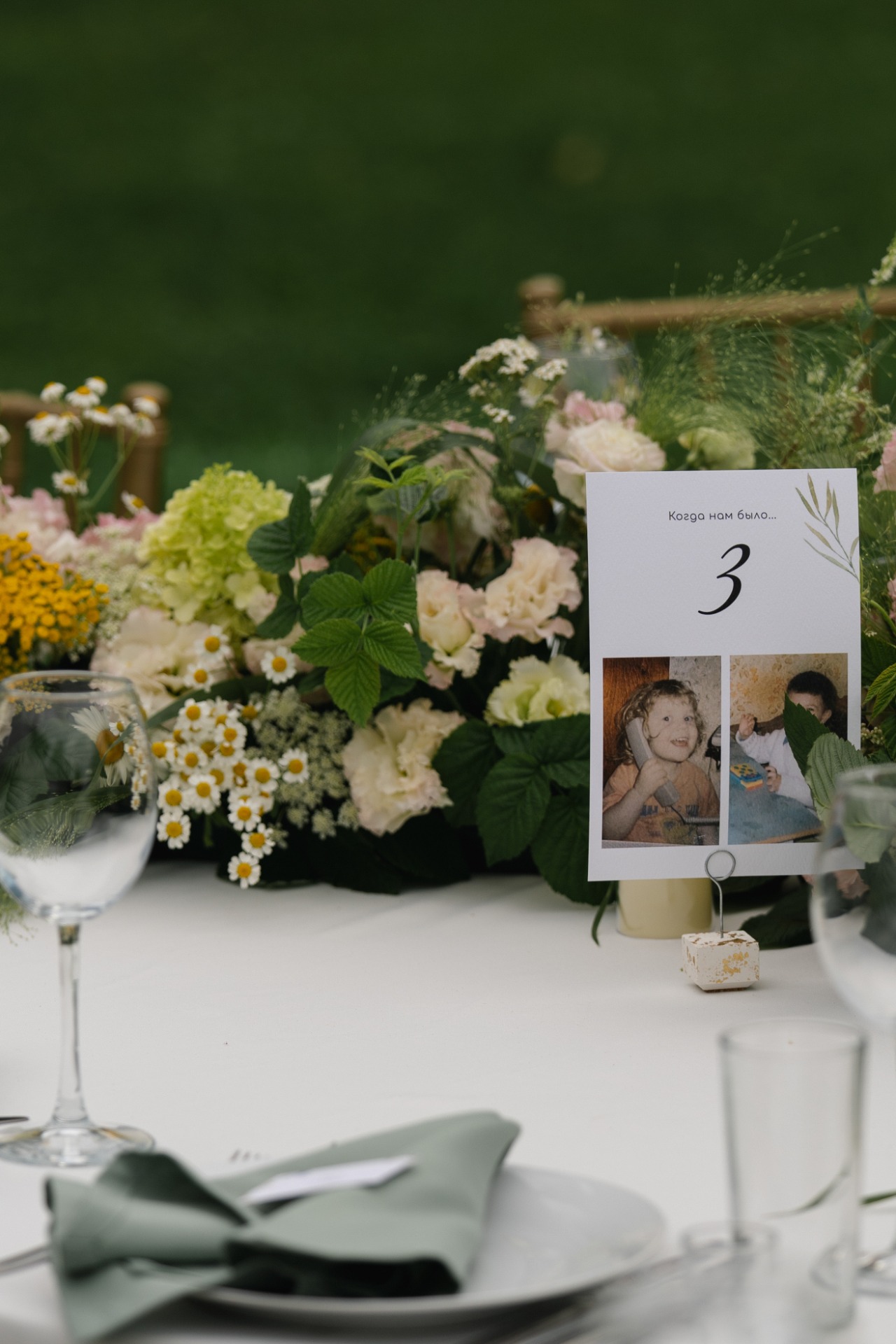 Я очень долго искала декораторов, все предлагали классический декор, а я хотела максимально натуральный, природный стиль. Совершенно случайно я наткнулась на только открывшуюся студию декора «Тётя Рут» с потрясающими дизайнерскими букетами. Они предложили мне сделать декор из травы и полевых ромашек, которые они срезали в вечер перед нашей свадьбой. И тут случился мэтч! Когда я увидела макет декора, у меня пошли мурашки!