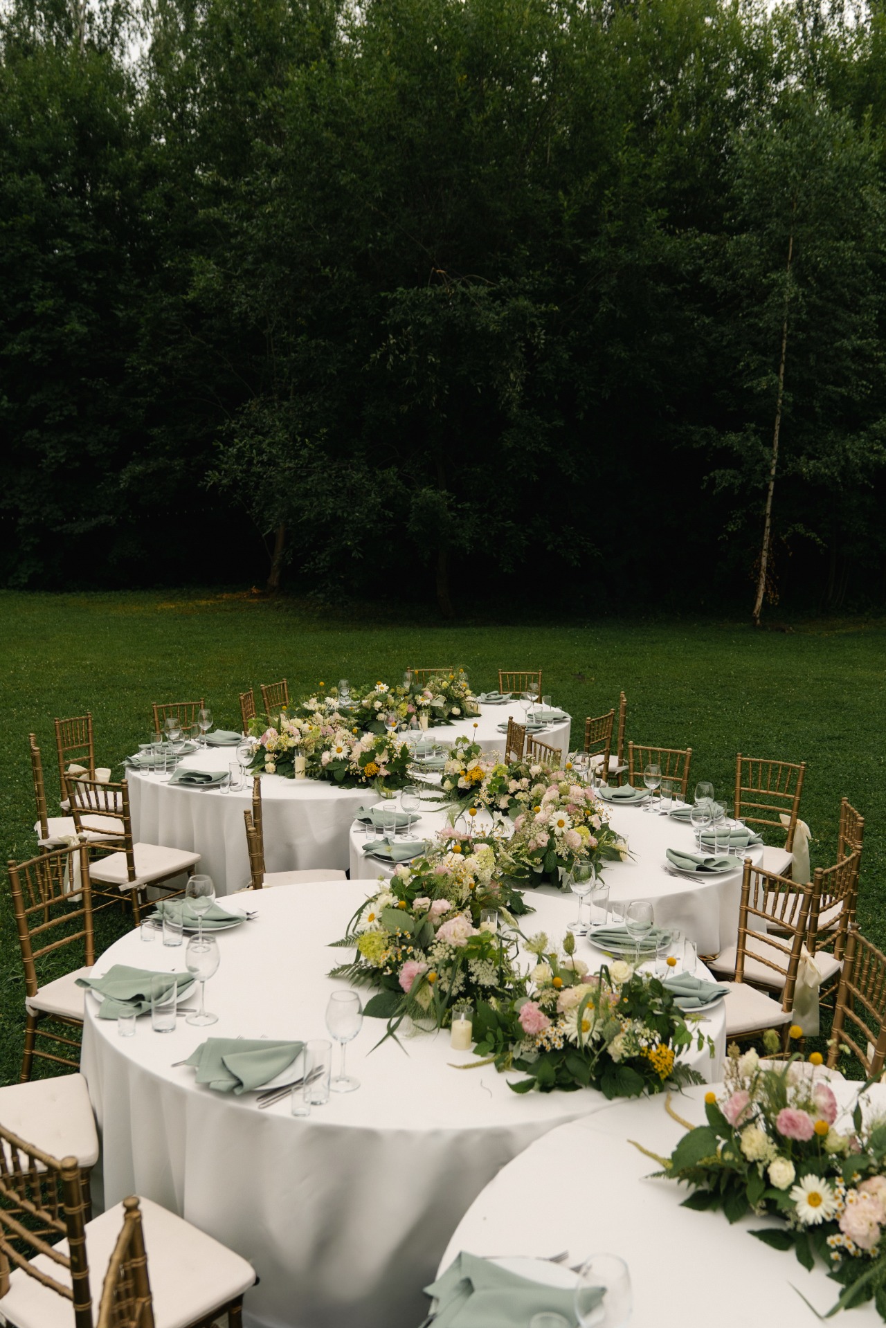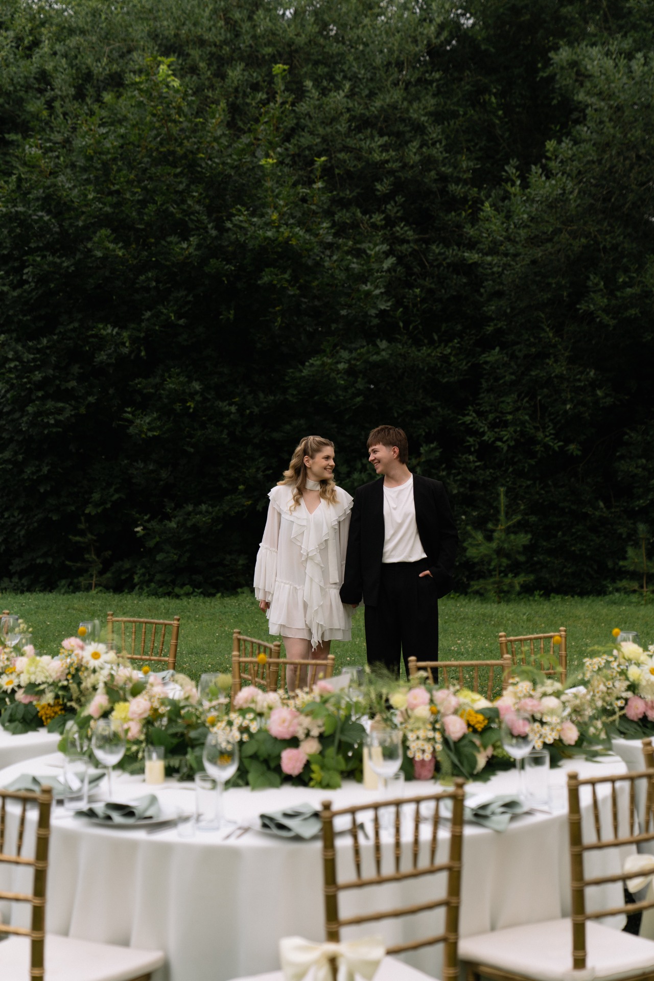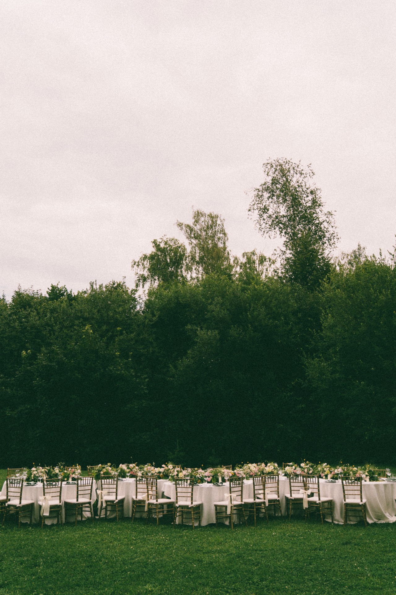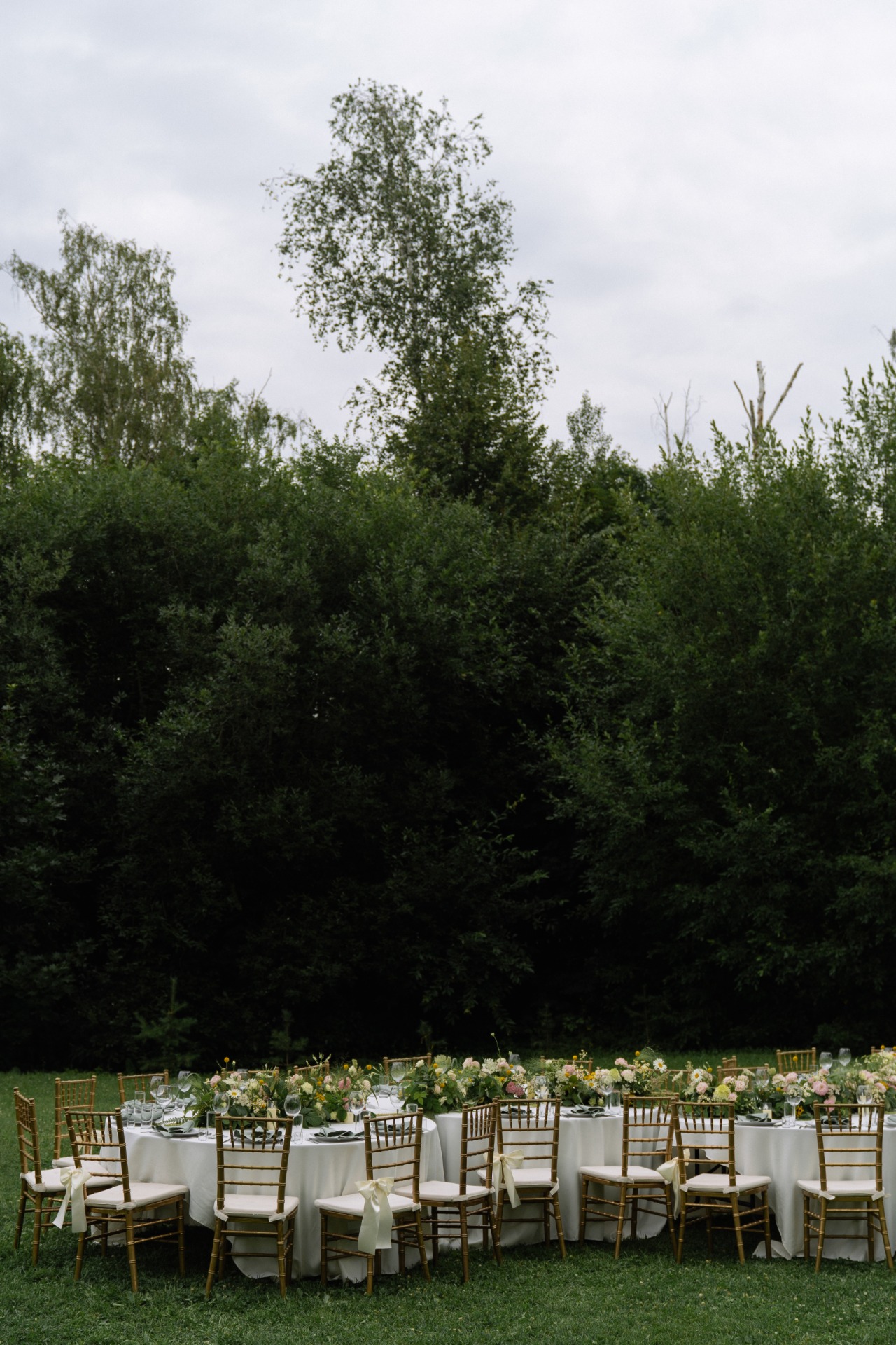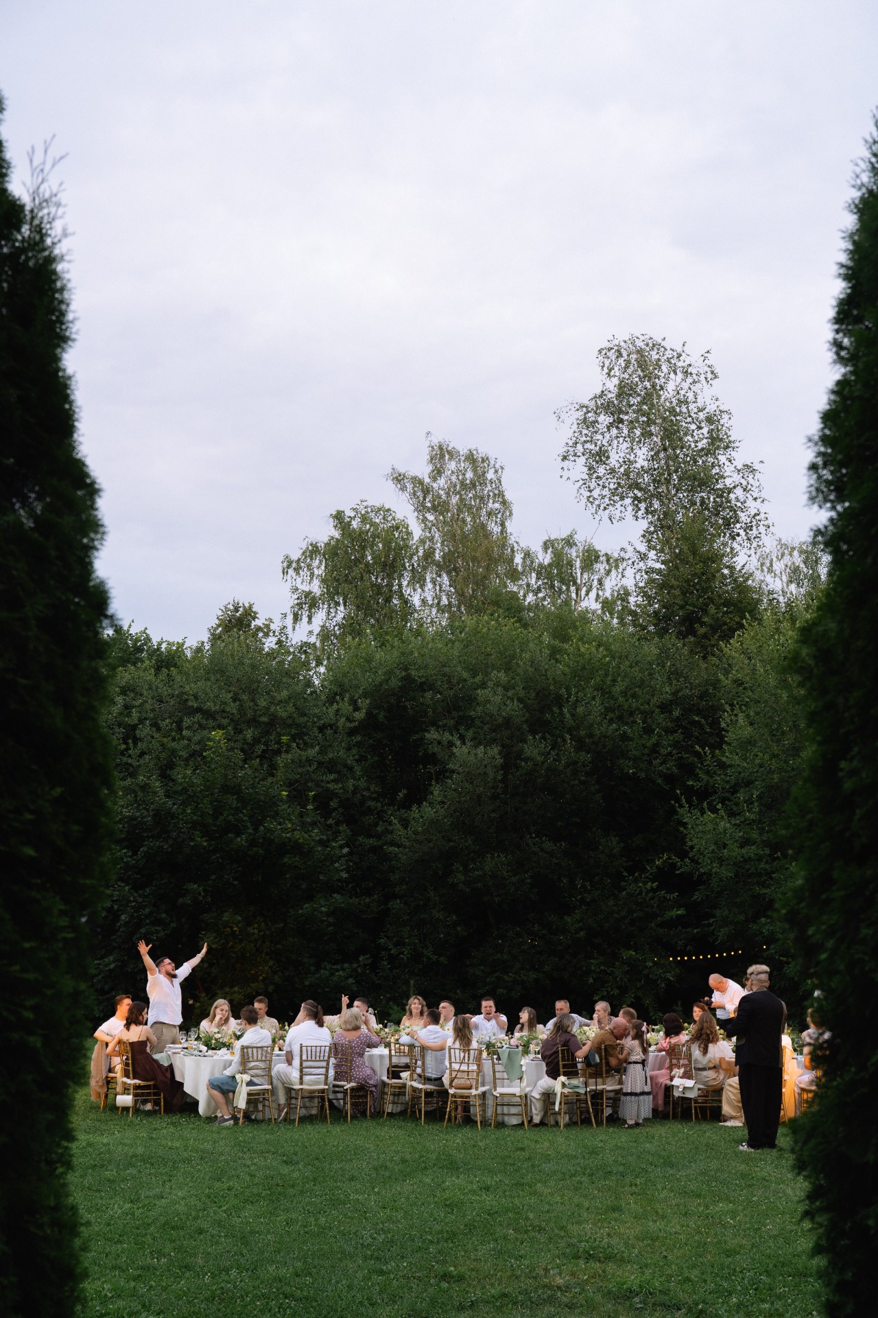 Мы долго собирали референсы и обратились к организаторам, но они отказали нам в этой идее. В итоге мы сами нашли старый и потрёпанный шатёр с обалденной огромной поляной с туями. Мы сразу начали визуализировать, как поставим столы на эту полянку и как наши гости будут босиком танцевать вокруг столов! Абсолютно всё мы делали дистанционно, поэтому риски были огромными.