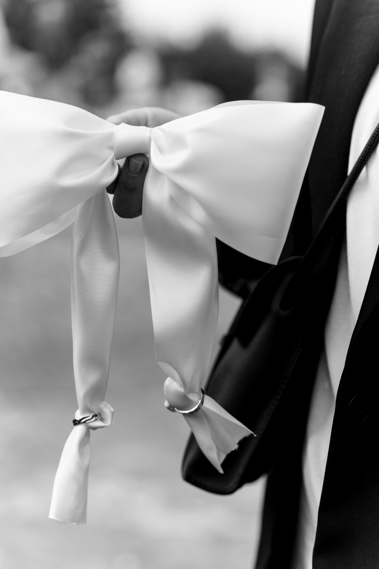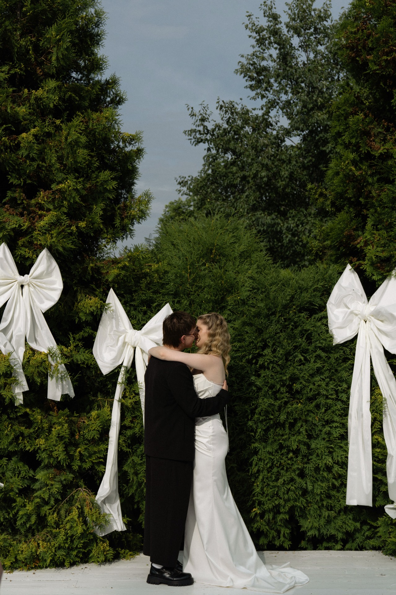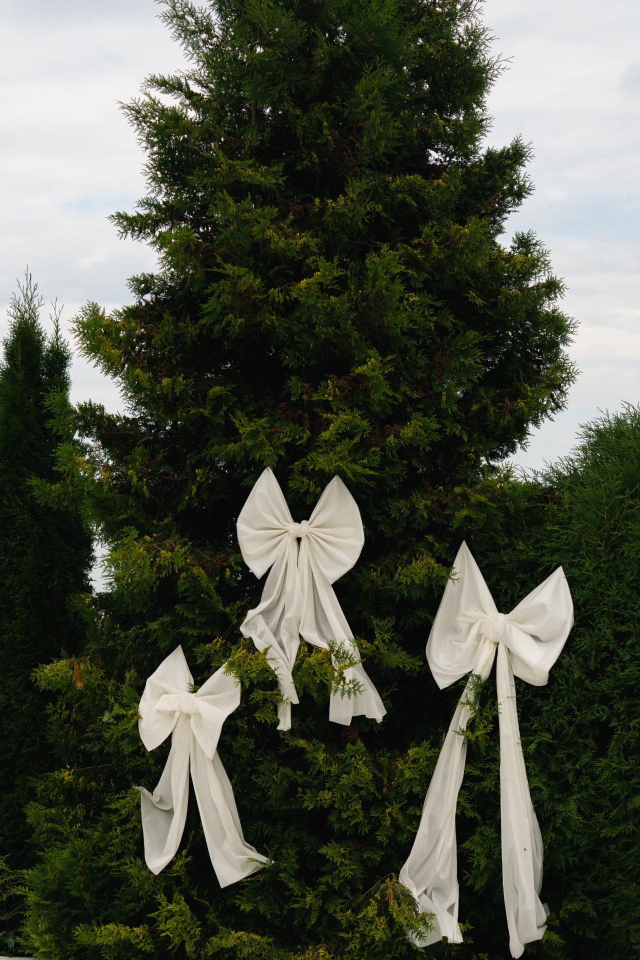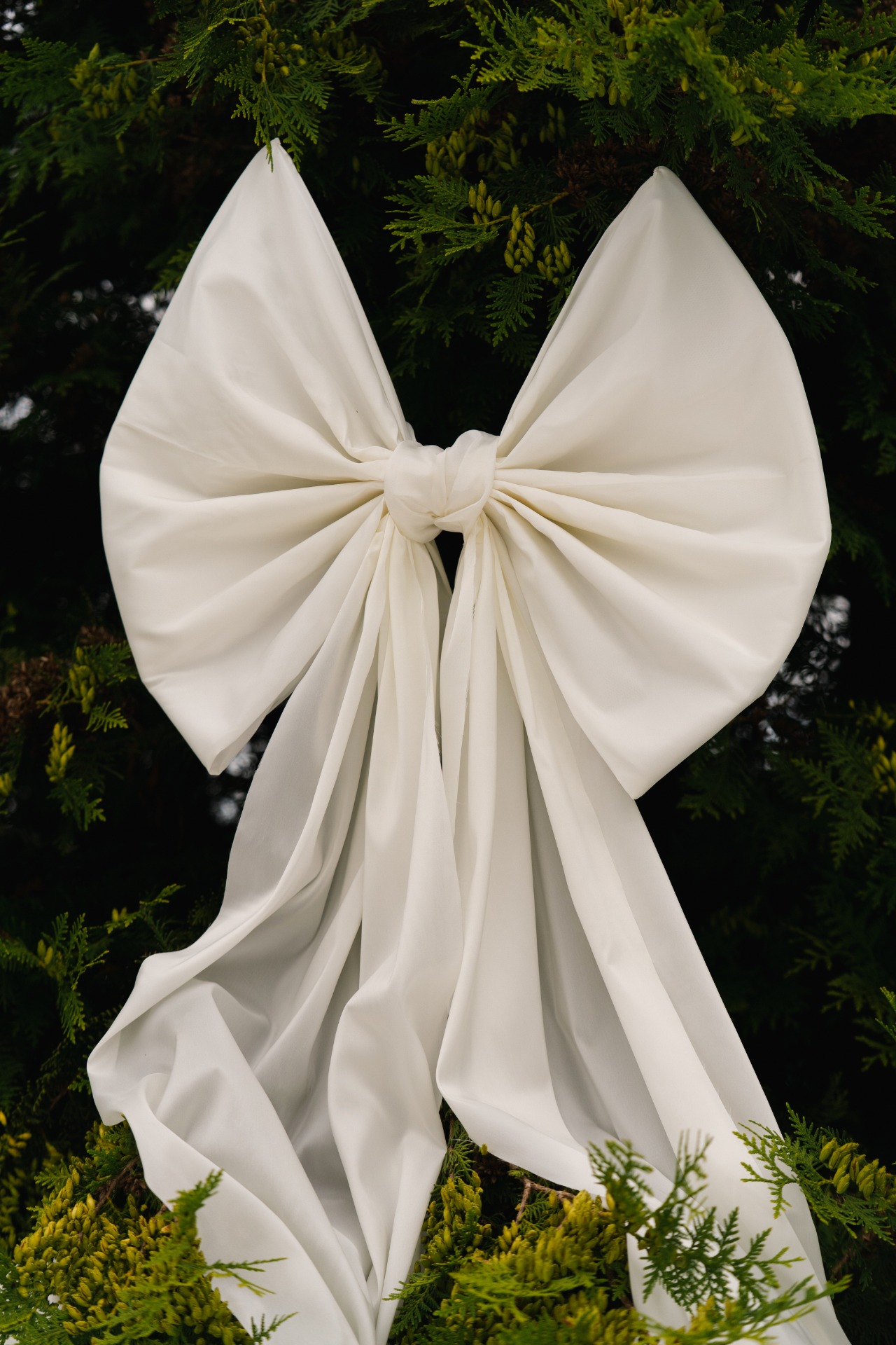 В зоне церемонии стояли потрясающие туи, и мне очень хотелось задействовать их в декоре. В прошлый Новый год были популярны банты, и я подумала: «А почему бы и нет?». Так родилась наша концепция «Любовь украшает жизнь, как бант украшает подарок». На стульях у нас также были атласные бантики.