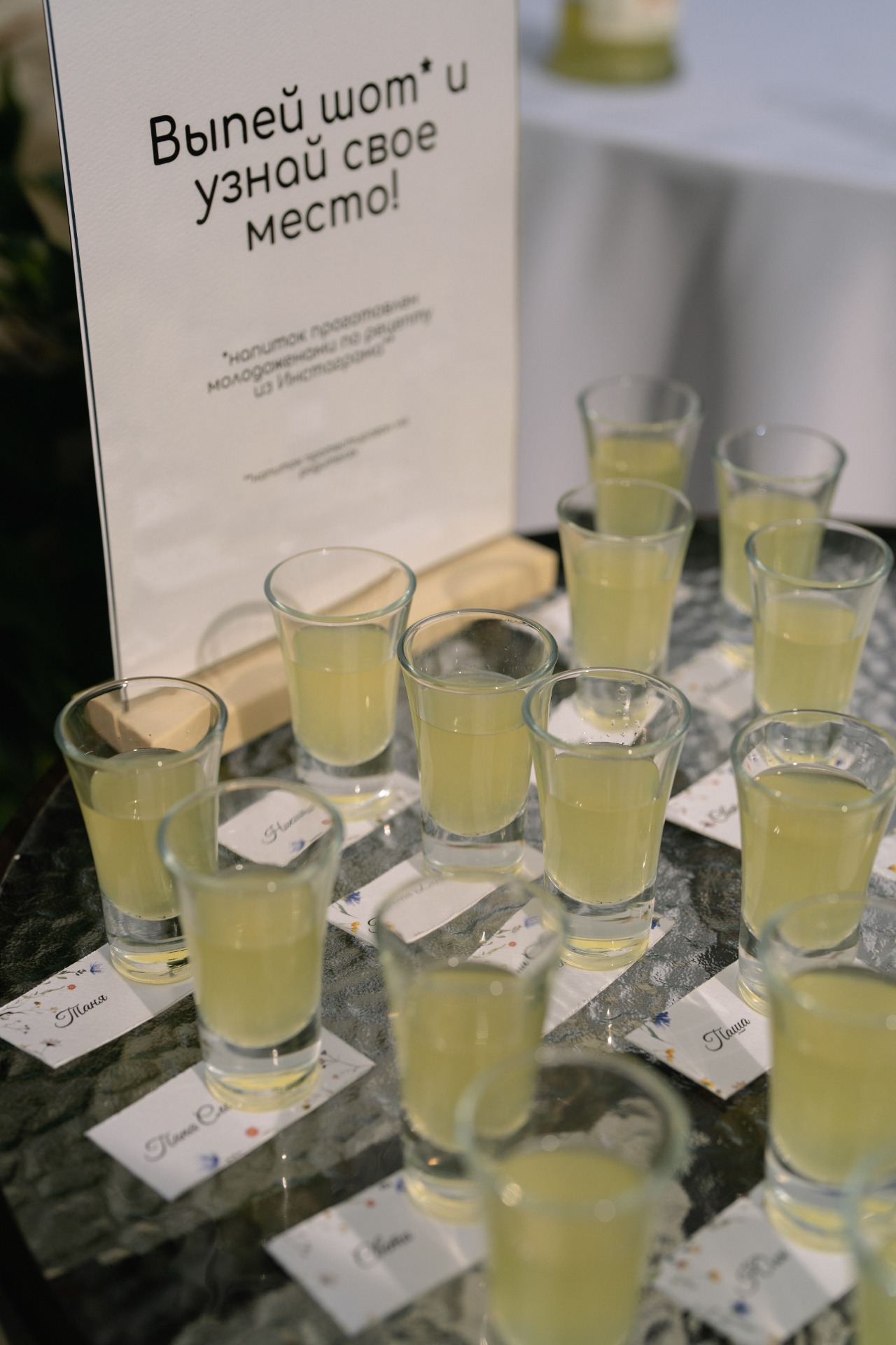 На велкоме мы сделали рассадку с самодельным лимончелло и чек-лист событий, которые будут реализованы на свадьбе, а тот, кто угадал больше всех пунктов, получил приз.