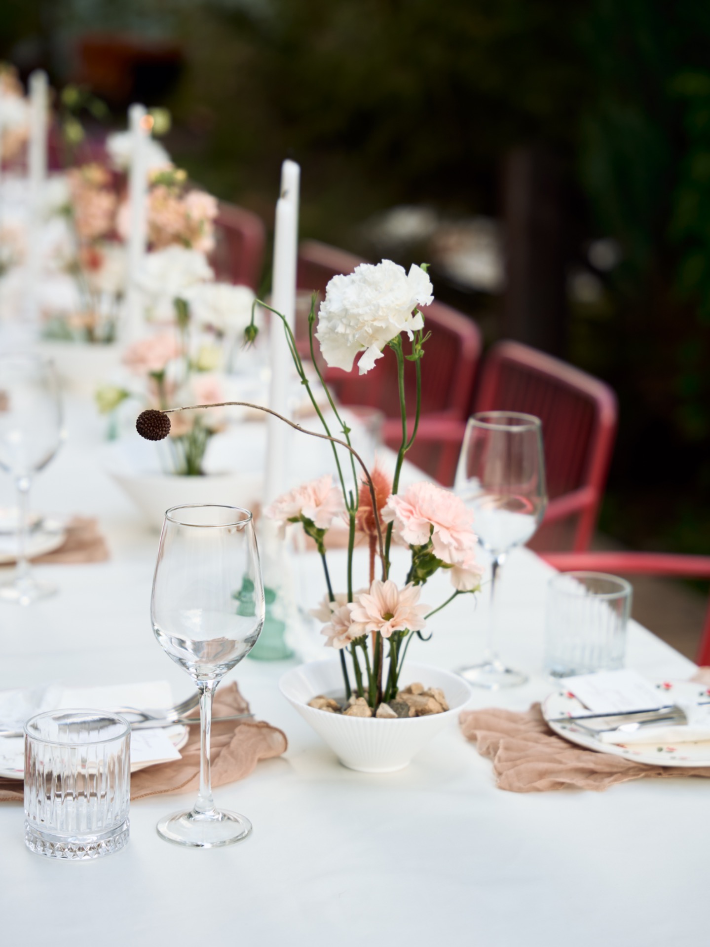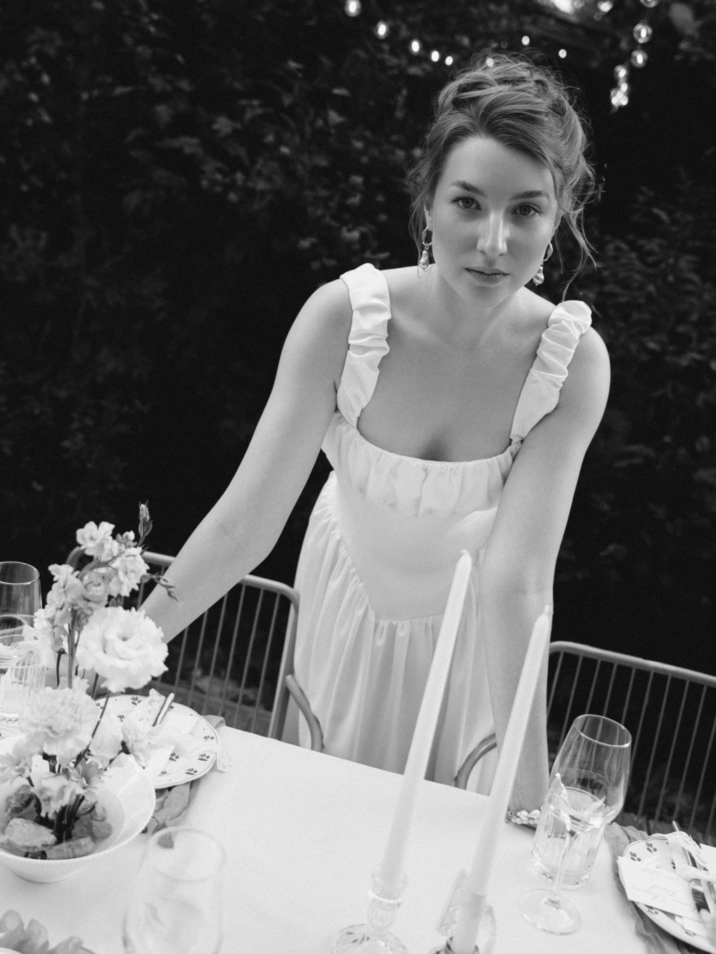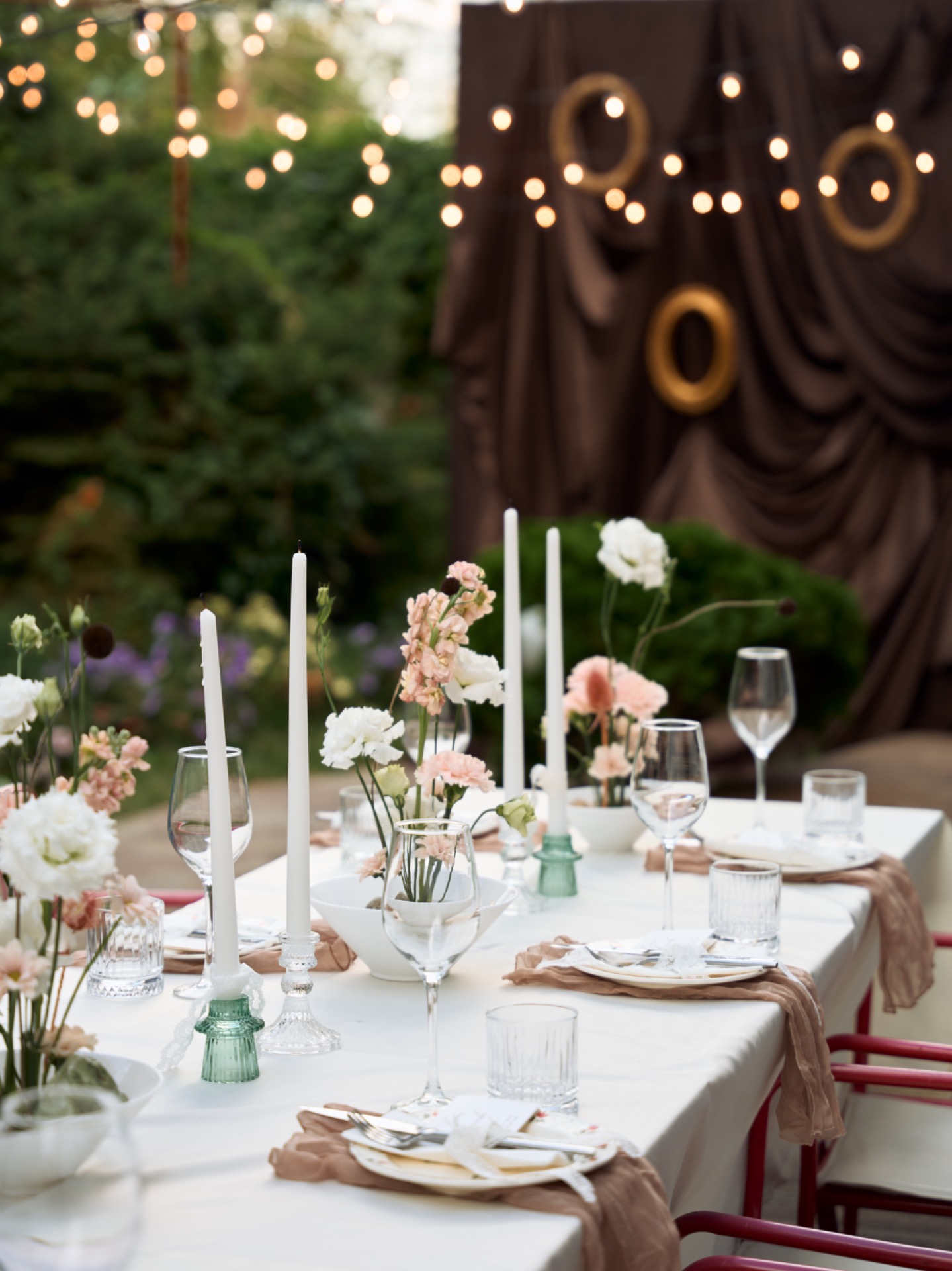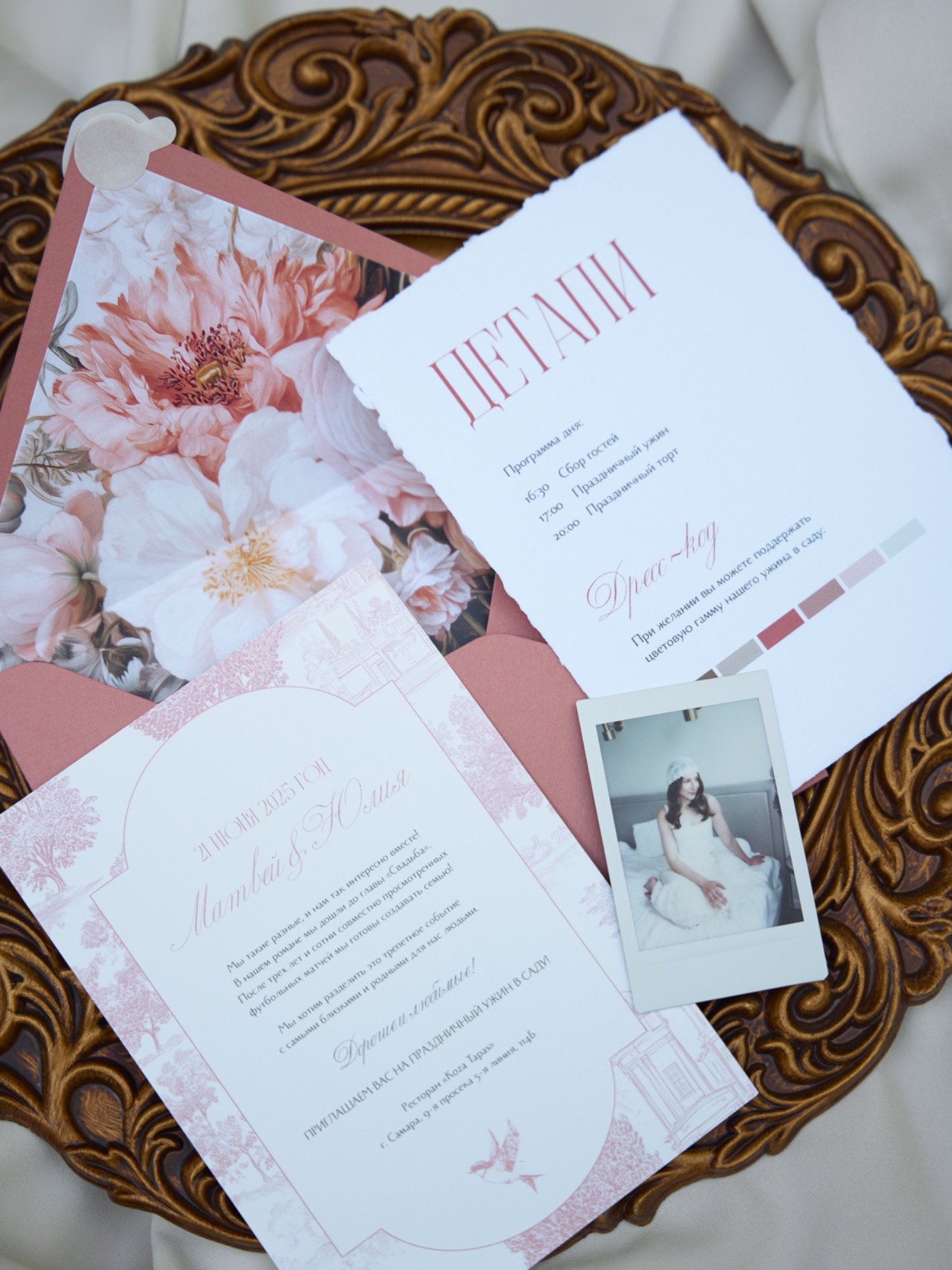 Мы выбрали плавный переход от терракотового к бежевому оттенкам, которые напоминали о нежных чувствах. Для гостей мы подготовили мудборд по образам для вдохновения. Локацией для ужина стал ресторан с садом и террасой. Я хотела, чтобы это место стало оазисом, где мы могли бы отпраздновать нашу любовь, словно в летнем саду, где время замирает и всё вокруг наполняется светом.