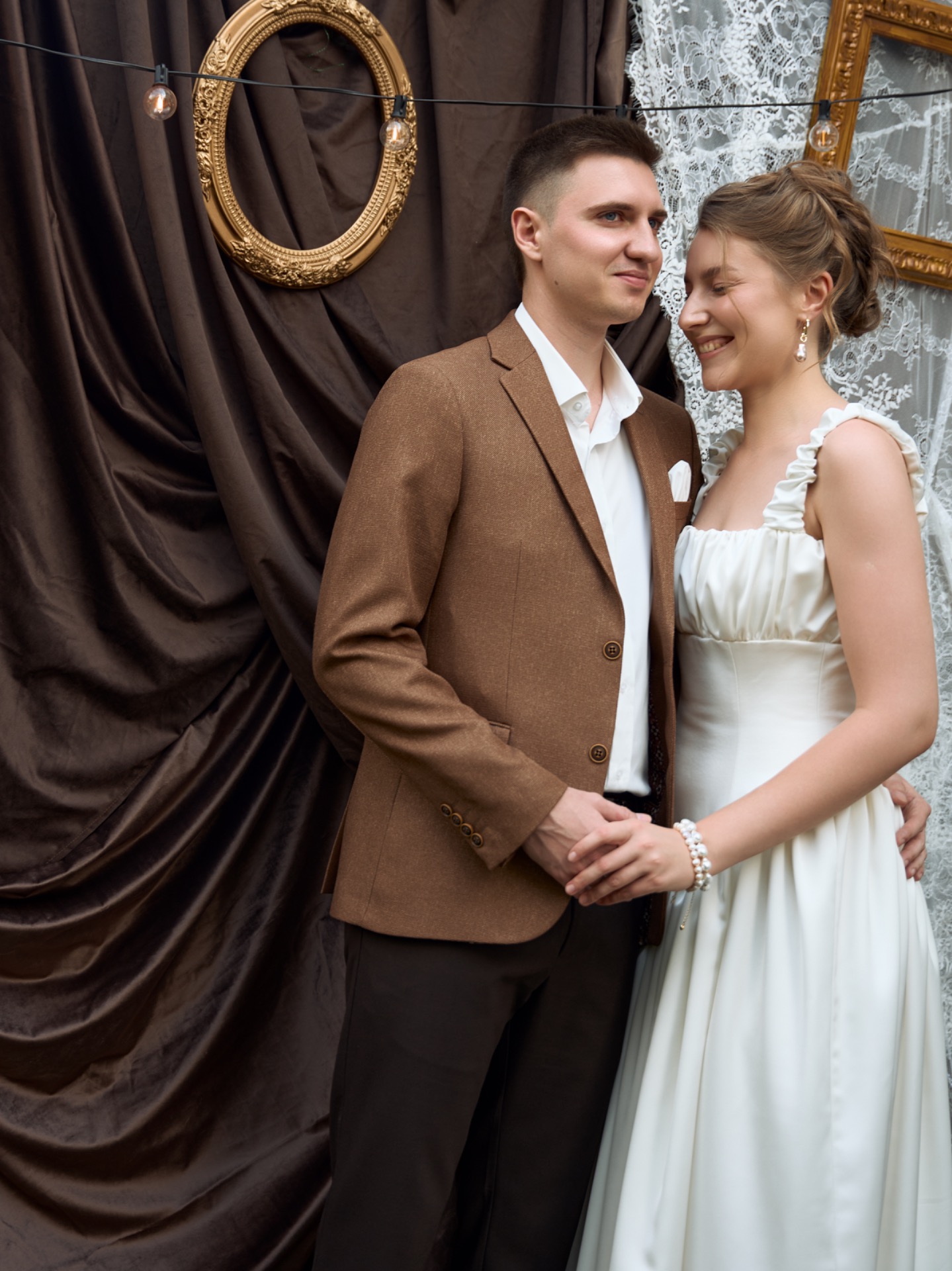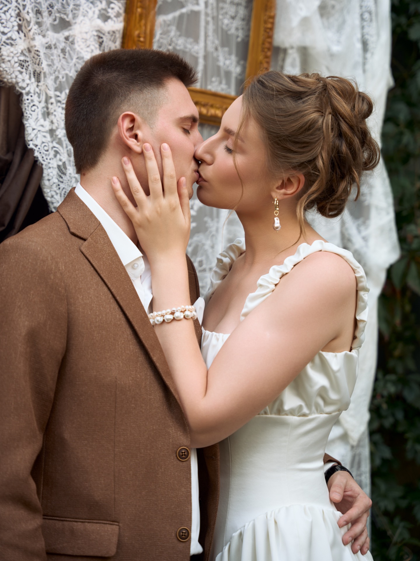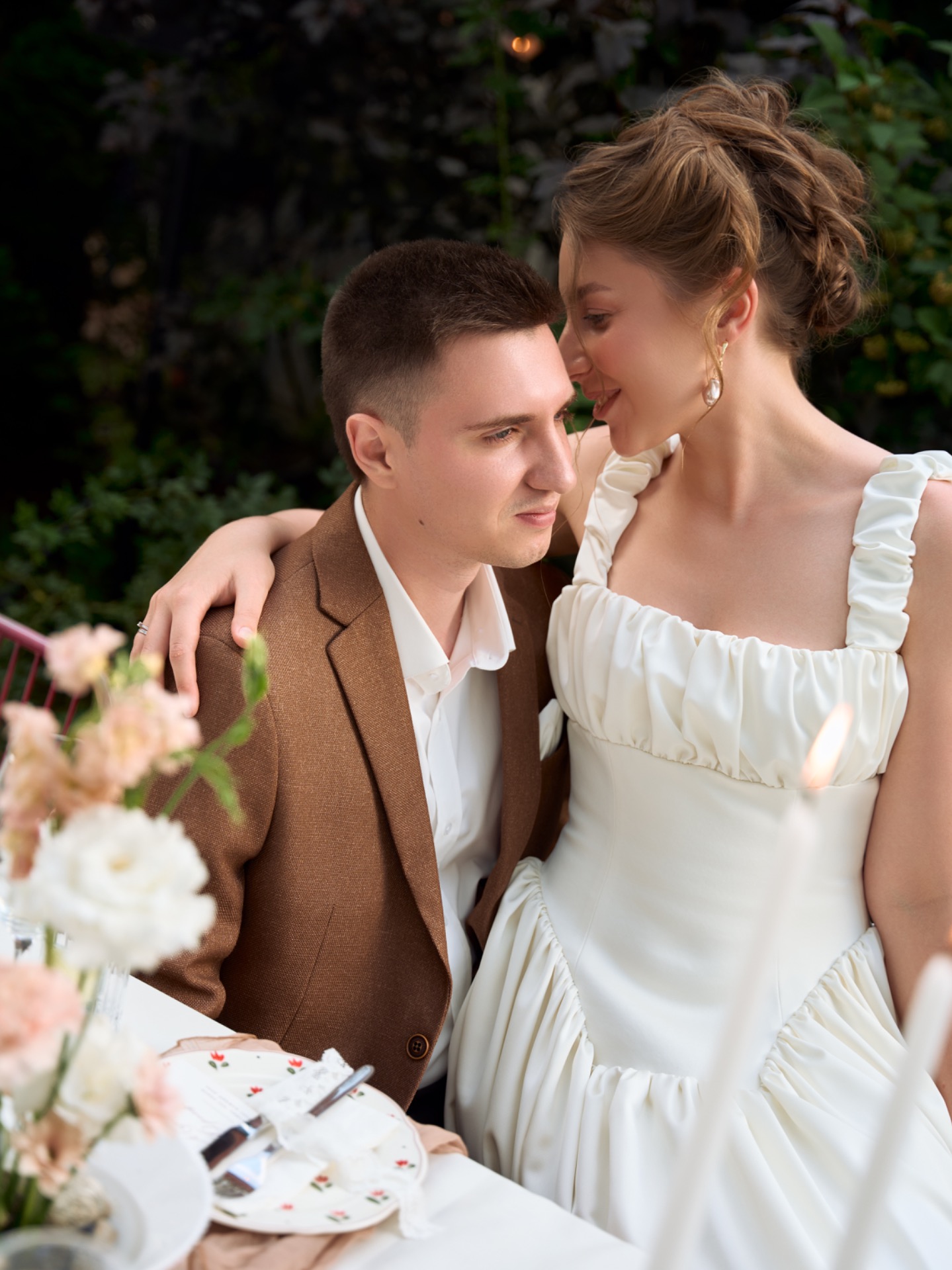 В день свадьбы наши образы идеально дополняли друг друга, создавая атмосферу романтики и утончённости. Я чувствовала себя настоящей героиней романа о любви — литературной, нежной и элегантной.