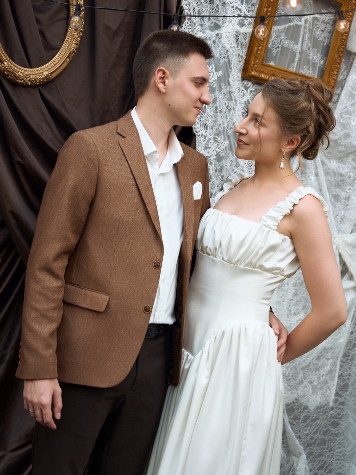 Образ Матвея мы продумывали после того, как определились с моим стилем. Мы выбрали тёмно-коричневые брюки и блейзер на тон светлее, что создало гармоничное сочетание. Его стиль также был вдохновлён винтажной эстетикой, что сделало нас настоящими героями романтической истории.